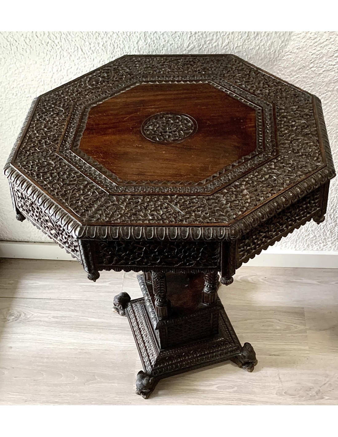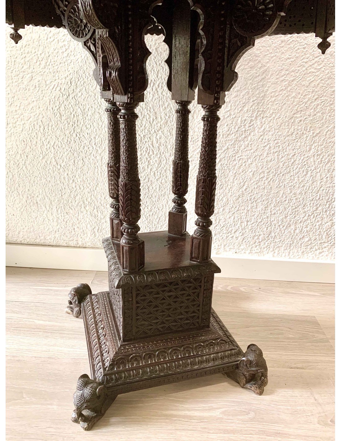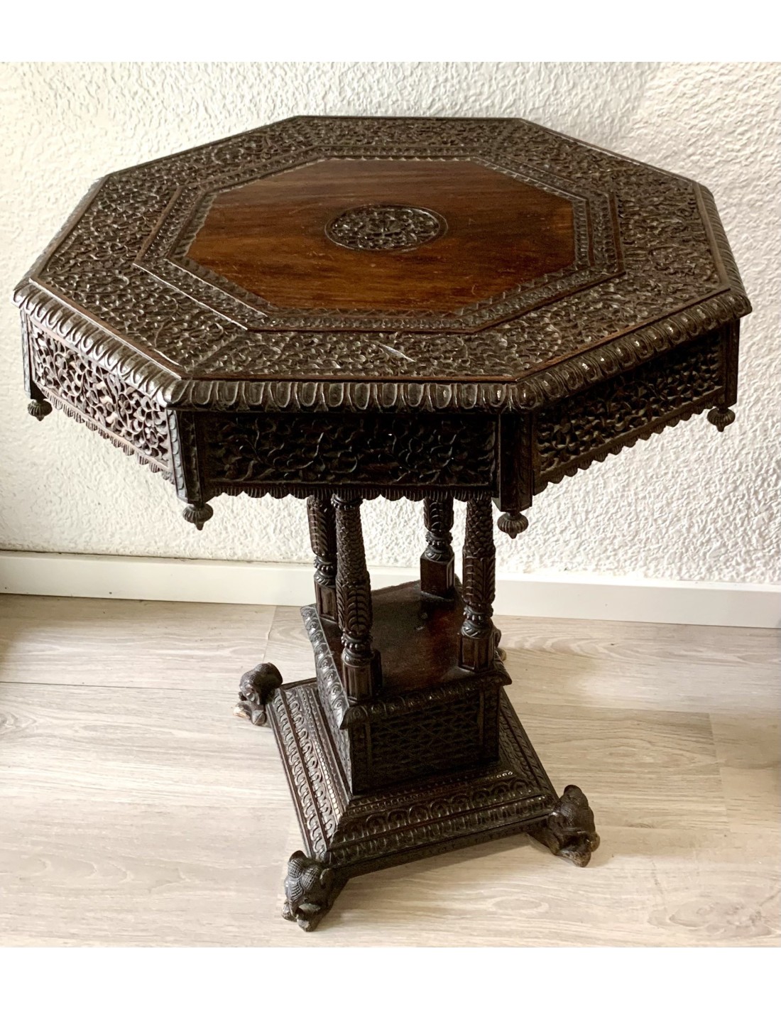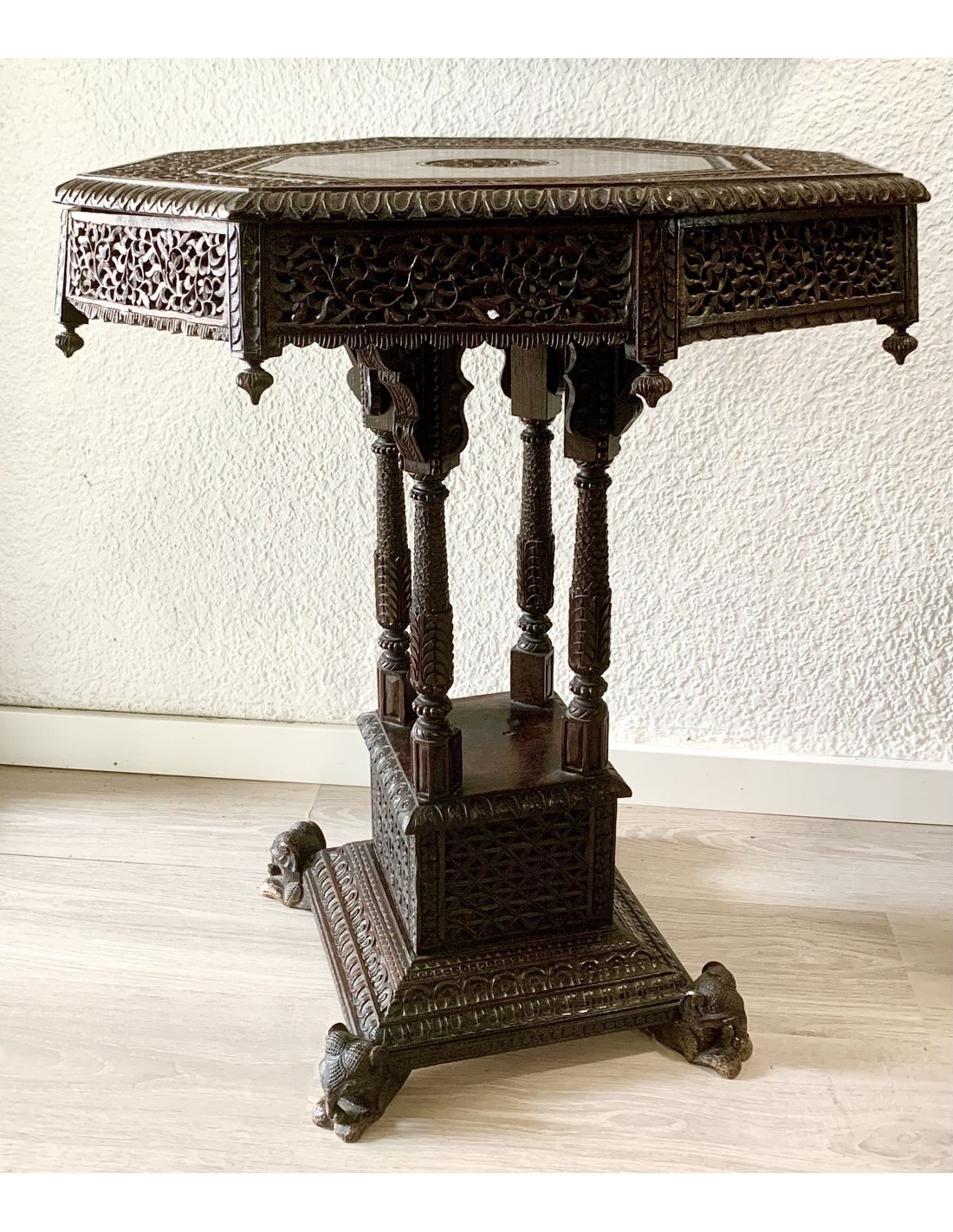 Padouk table, manufactured in colonial India (about 1869-70) in wood entirely carved in padouk, for export from the mid-19th century to Europe and above all to England. Smooth octagonal shaped base with central spherical decoration, four columns interlocking on two entirely carved cubic bases, feet in the shape of an elephant.