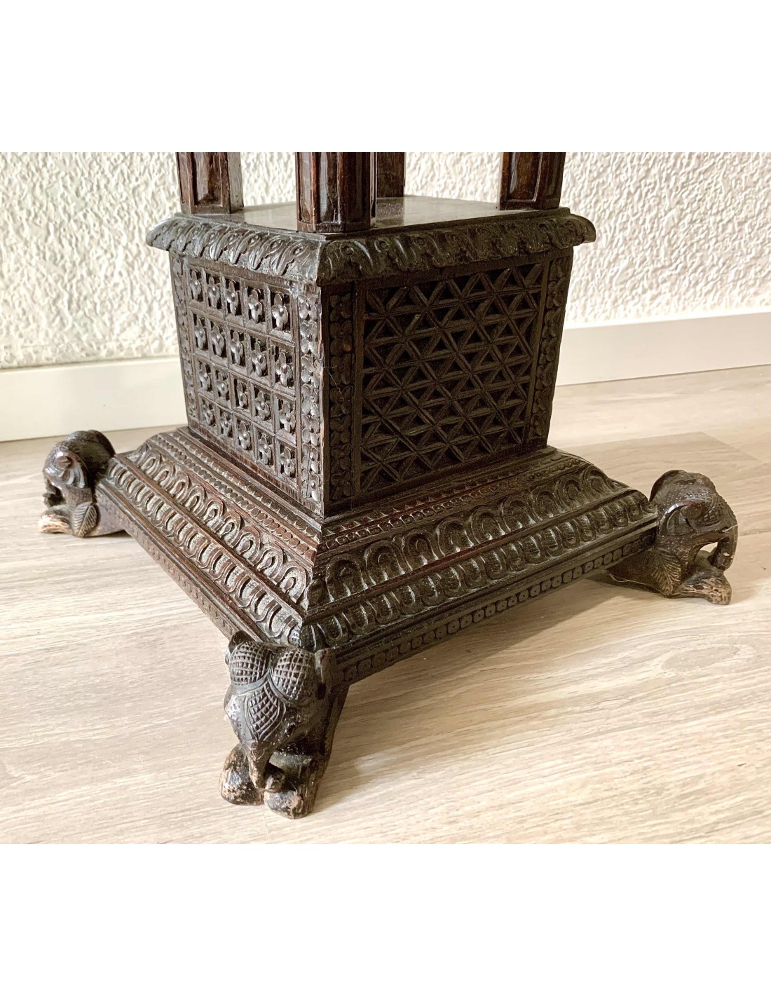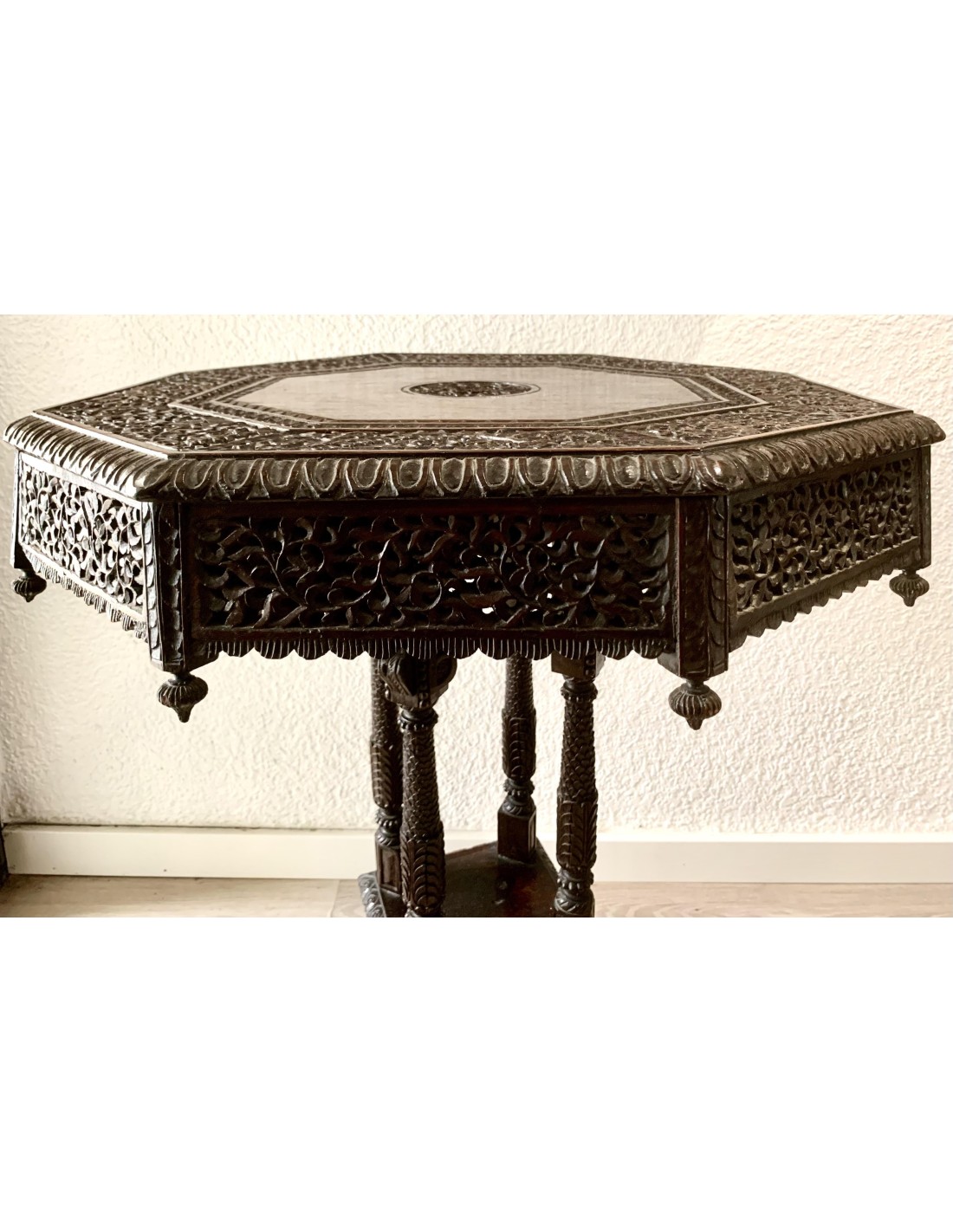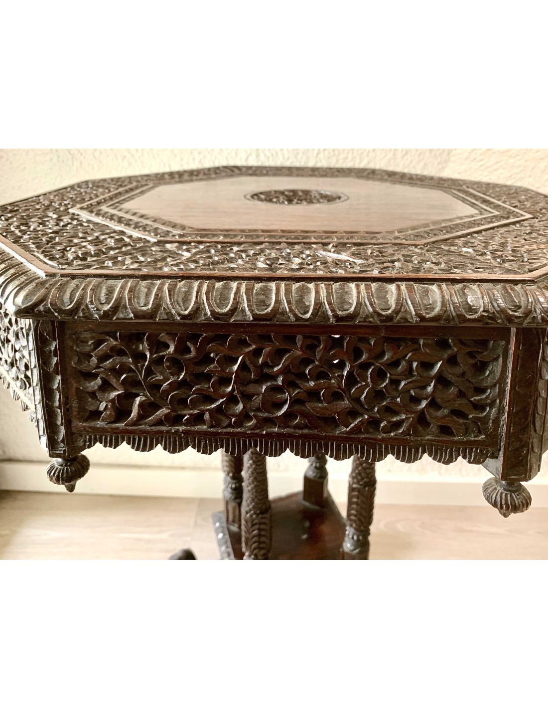 Padouk table, manufactured in colonial India (about 1869-70) in wood entirely carved in padouk, for export from the mid-19th century to Europe and above all to England. Smooth octagonal shaped base with central spherical decoration, four columns interlocking on two entirely carved cubic bases, feet in the shape of an elephant.