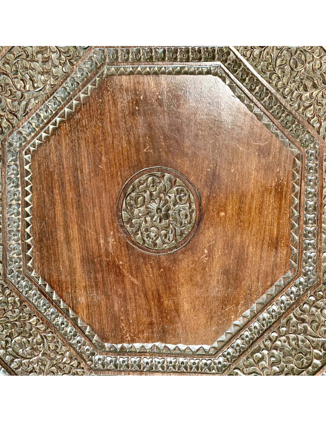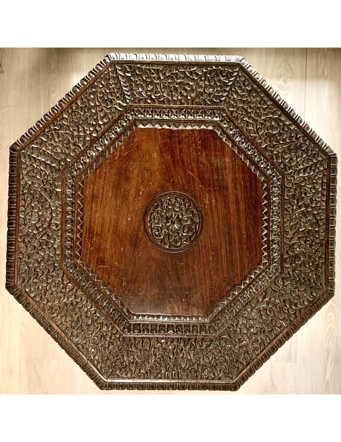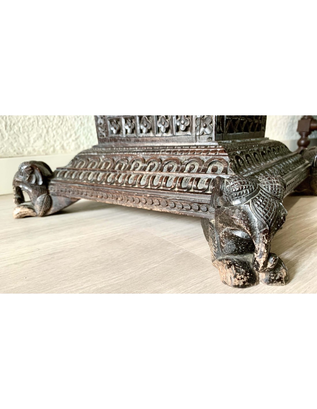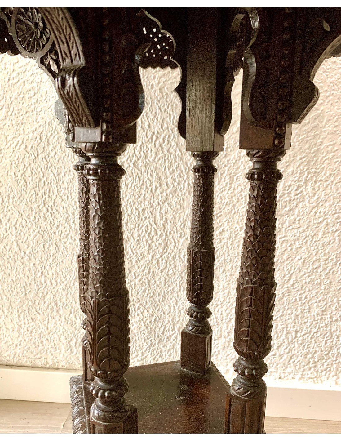 Padouk table, manufactured in colonial India (about 1869-70) in wood entirely carved in padouk, for export from the mid-19th century to Europe and above all to England. Smooth octagonal shaped base with central spherical decoration, four columns interlocking on two entirely carved cubic bases, feet in the shape of an elephant.