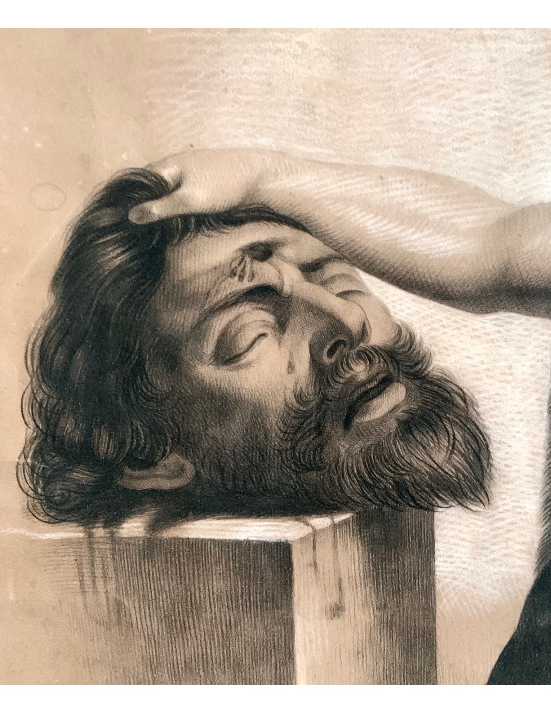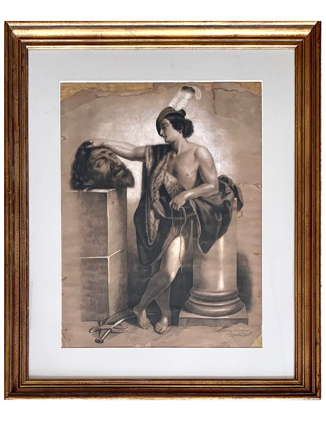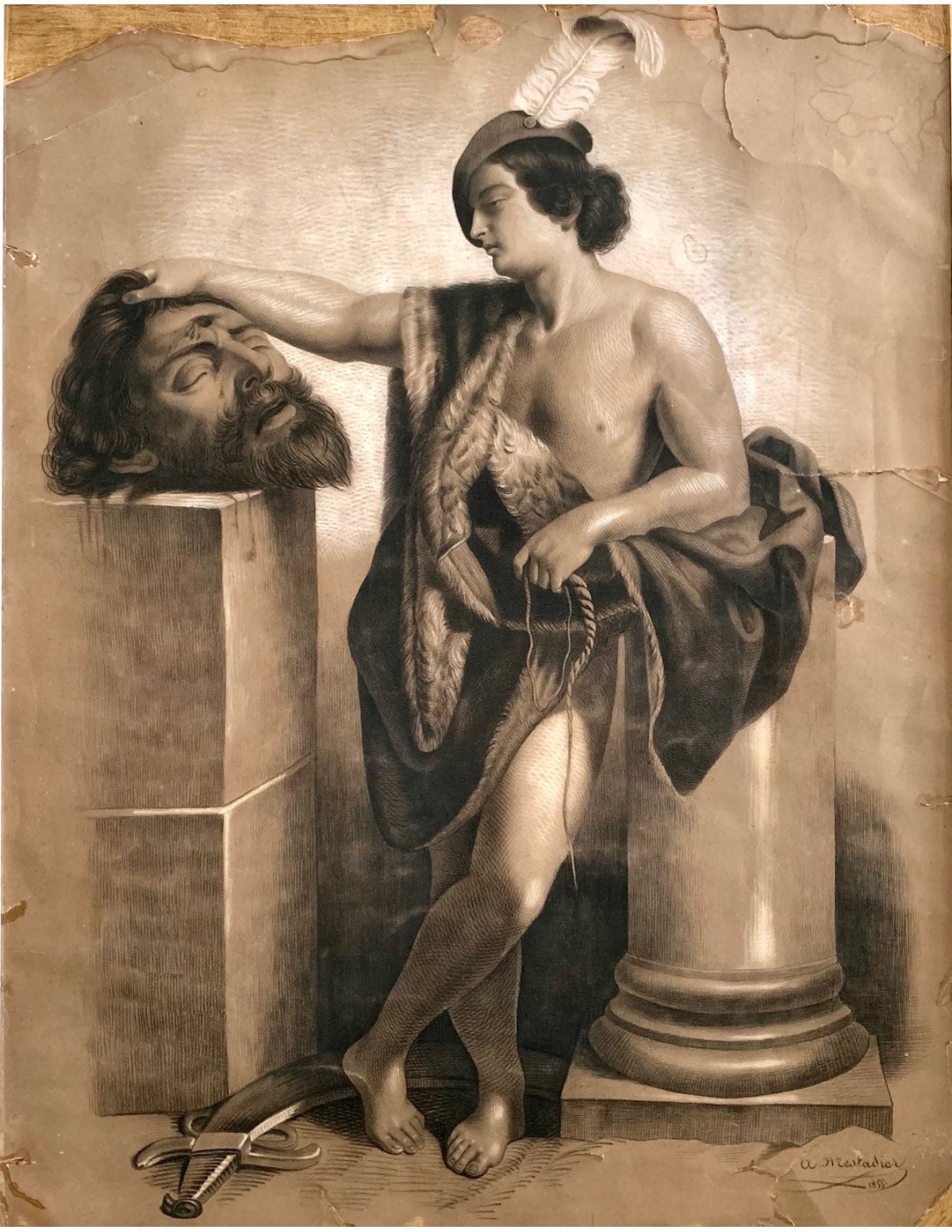 "David and Goliath," charcoal drawing on paper with white pastel highlights, France, 19th century, signed and dated 1855 in the lower right corner.
