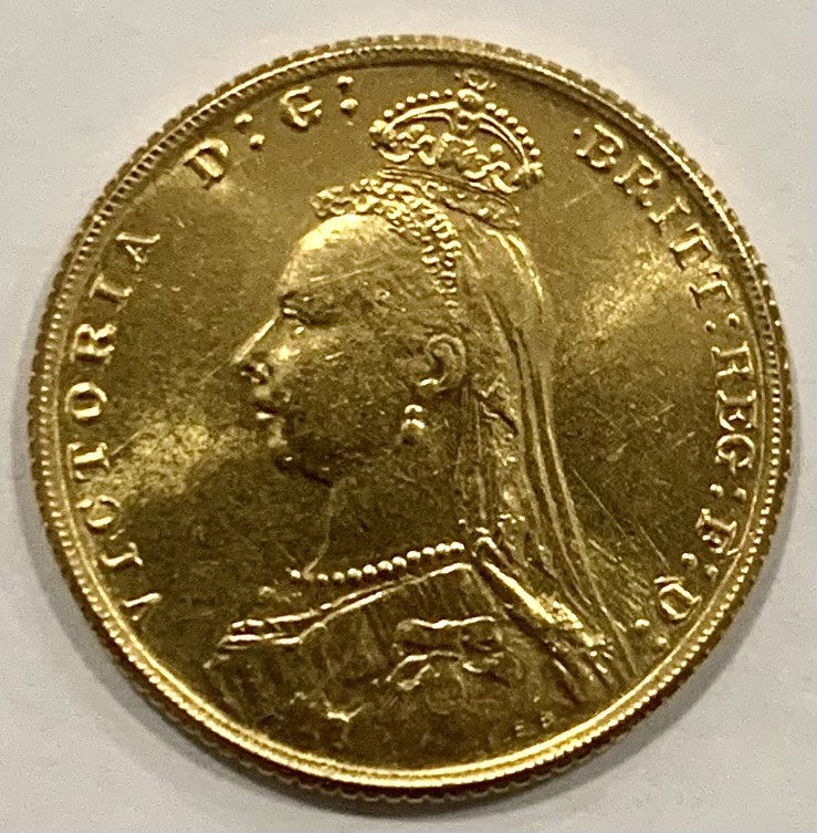 Queen Victoria gold sterling coin, 1892 for The Royal Mint, London Mint.