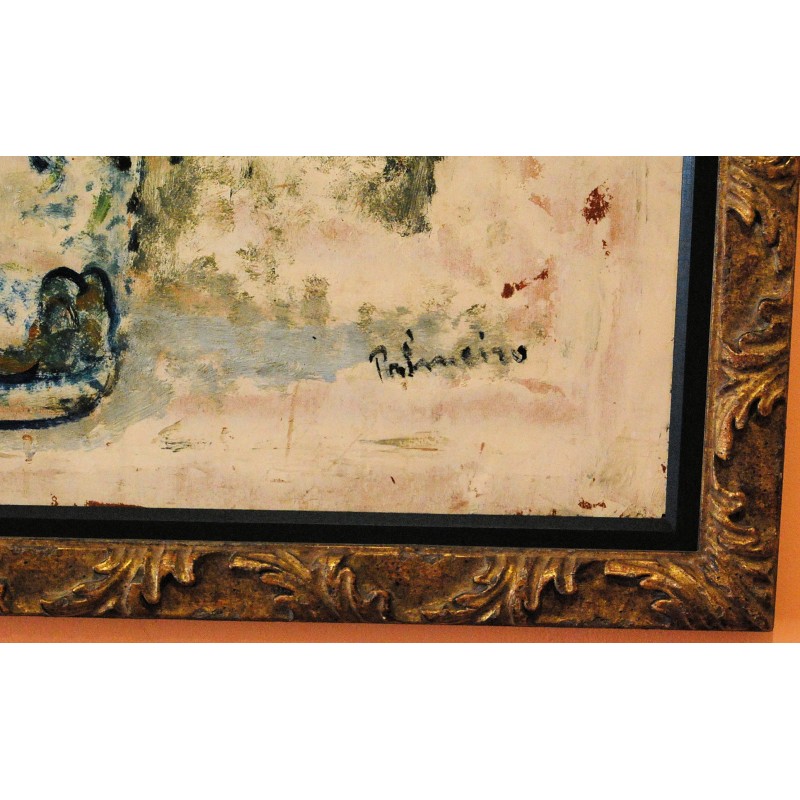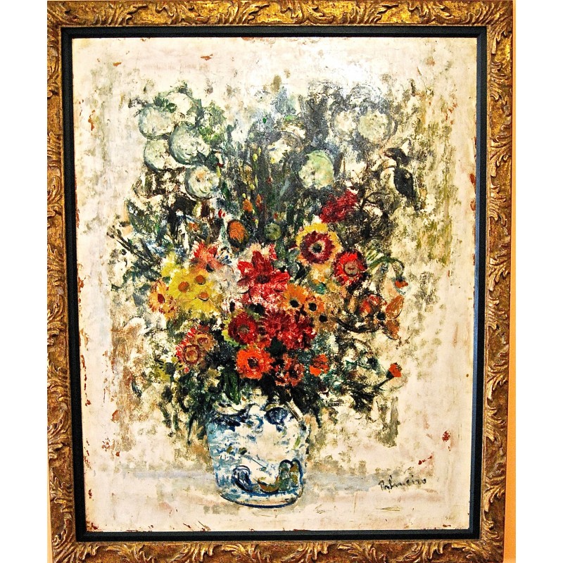 Bodegón floral, José Palmeiro (Madrid 1901 - Bergerac 1984). Su producción artística estuvo vinculada fuertemente a la tradición francesa del post-impresionismo . De igual forma, su arte se debe incluir dentro del post-cubismo. Bodegón de flores, oleo sobre cartón, pintura realizada en la decada de los años 30.
