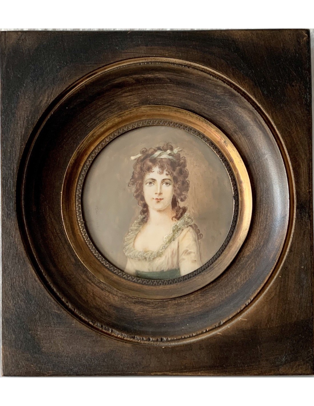 Retrato de mujer, miniatura redonda al gouache sobre sutil lamina de marfil, mitad del siglo XIX, firmado en el lado izquierdo, enmarcación original de época, buen estado de conservación general.