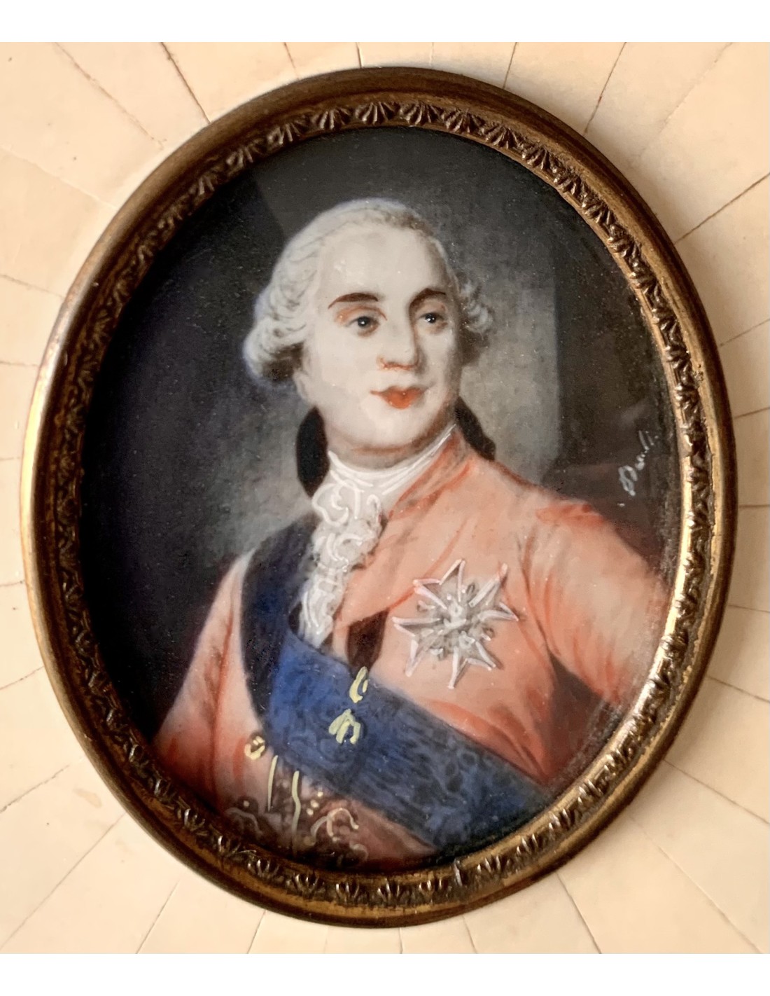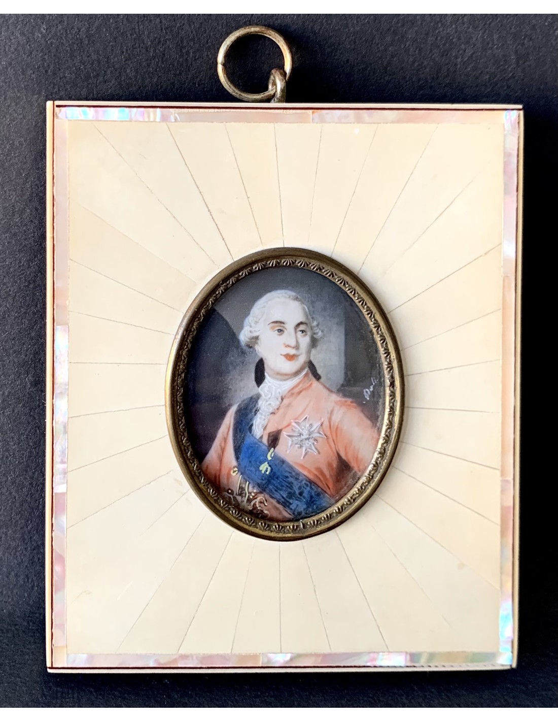 Miniatura de finales del siglo XIX, retrato de Luis XVI, basado sobre un retrato del siglo XVIII, gouache, firma en el lado derecho no identificada. Enmarcación con laminas de hueso y nácar, margen interior ovalado de latón acristalado.