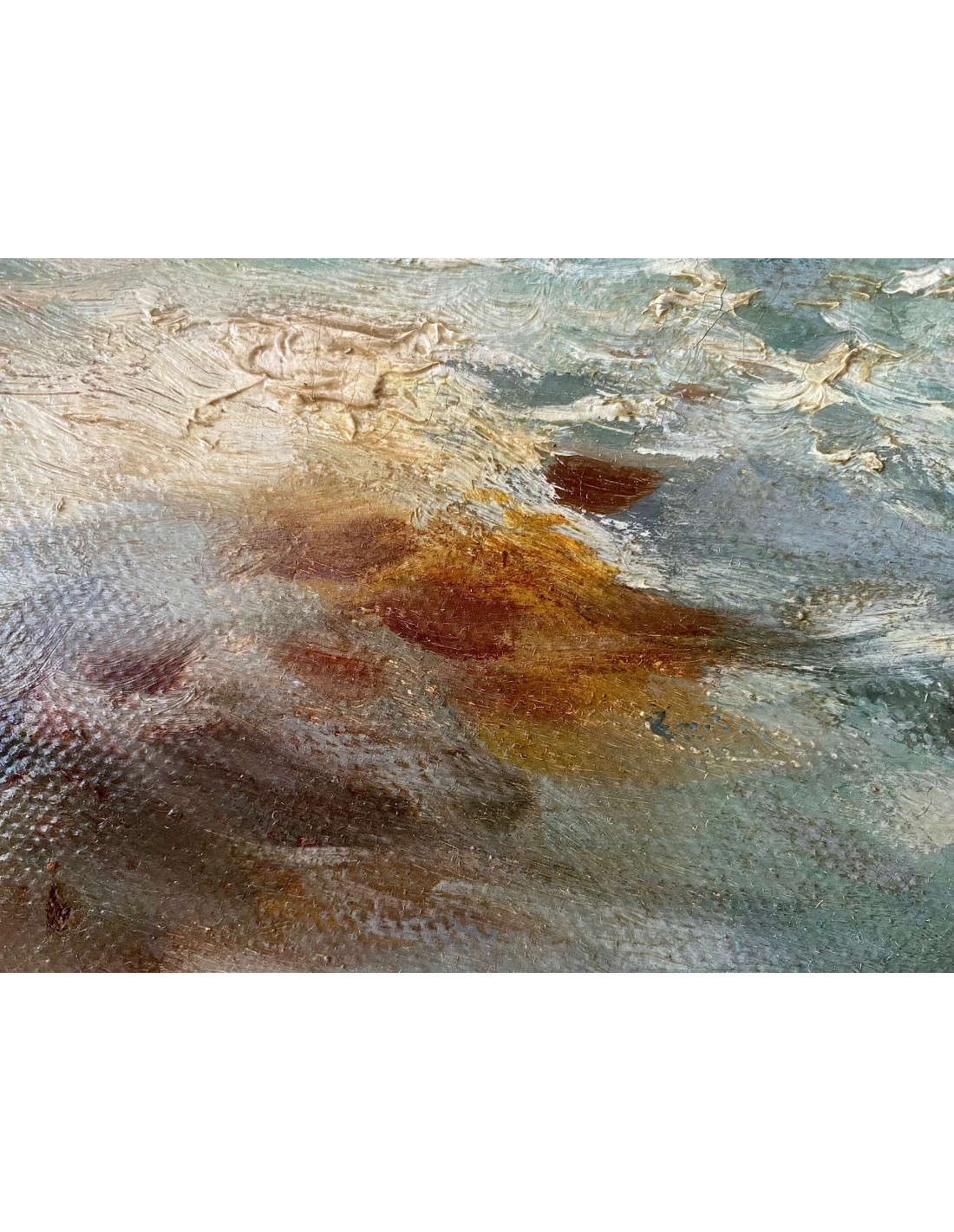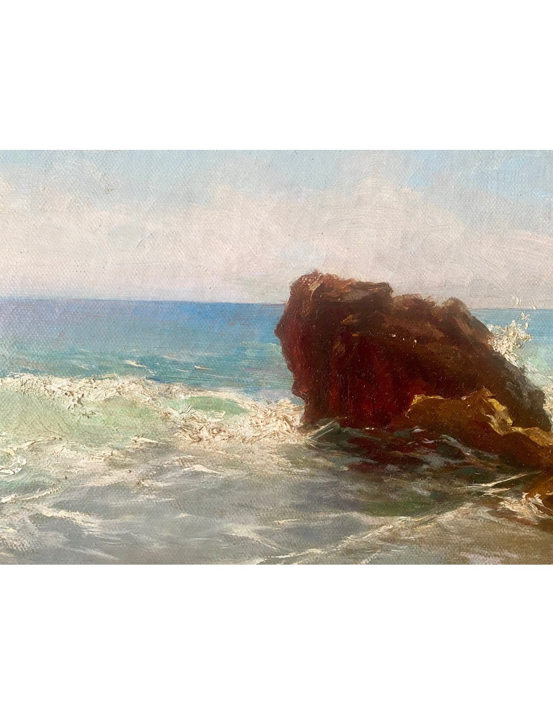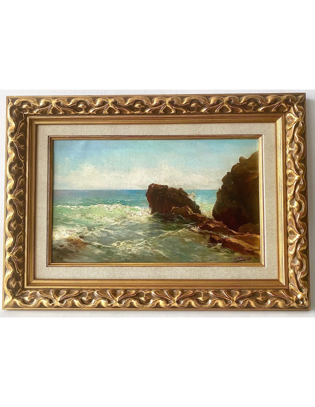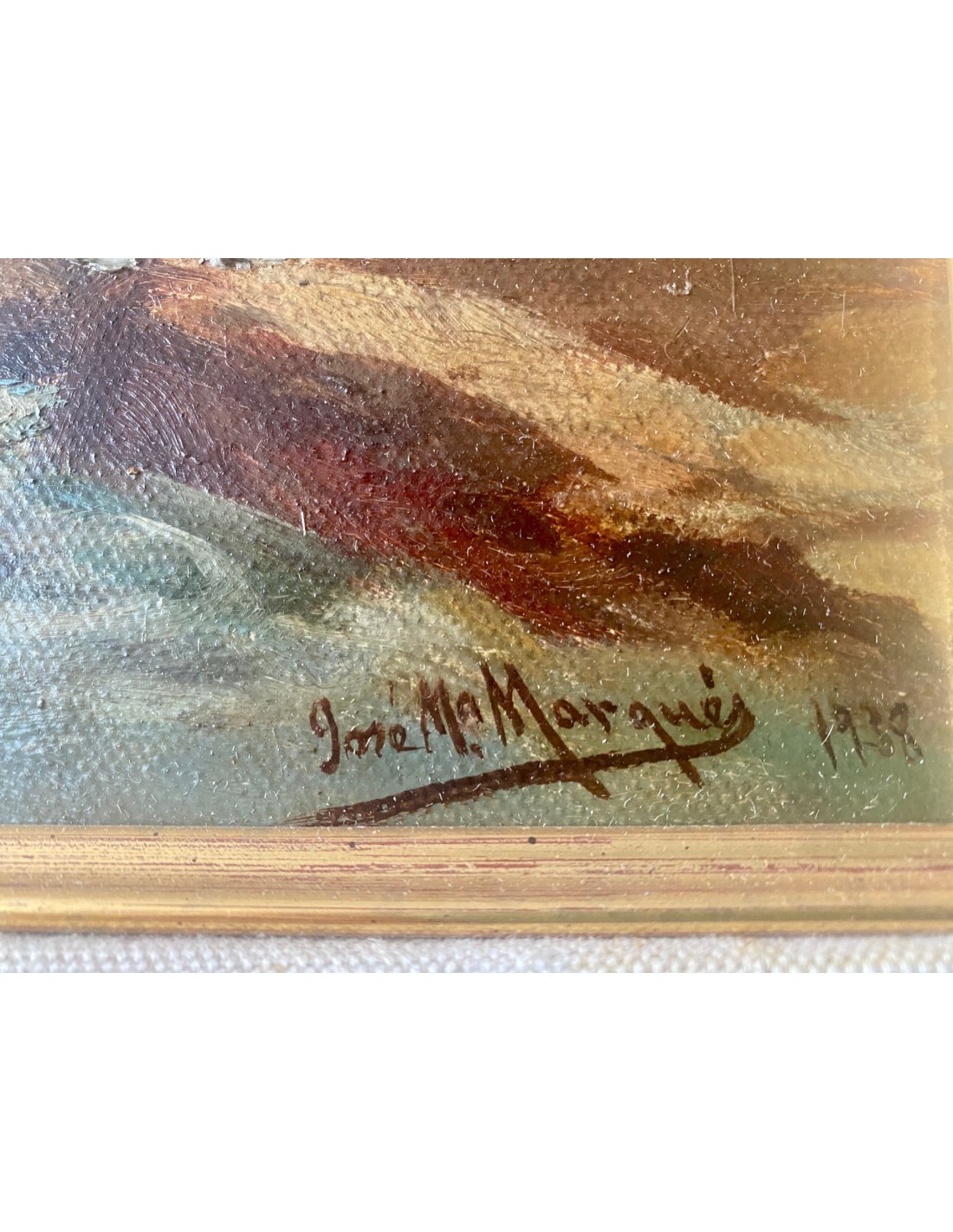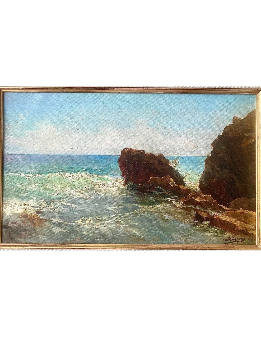 Marina con enmarcación dorada y blanca. Firmada y fechada en el ángulo inferior derecho. José María Marqués y García (Tortosa, 1862-Barcelona, 1938). Estudió dibujo y pintura en el taller de su padre, Manuel Marqués. Fue alumno de la Academia de Bellas Artes de Barcelona. En 1882 obtuvo una medalla de progreso en la Exposición de Villanueva y Geltrú. Sus cuadros se vendieron en Nueva York, Londres, París, Milán y Barcelona. Cultivó diversos géneros. Falleció en Barcelona el 25 de noviembre de 1938.