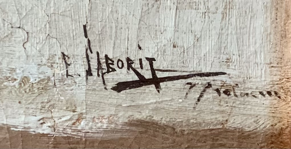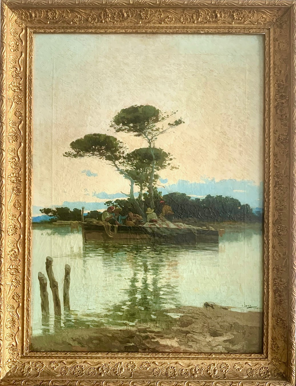 Pintura que representa una embarcación con pescadores que están volviendo de la mar por la Devesa gola del Perelló Albufera de Valencia. Enrique Saborit y Arosa (Valencia 1869-1928). Pintor español. Estudió en la Escuela de Bellas Artes de San Carlos de Valencia y con el pintor Juan Peyró. Autor de escenas costumbristas, también cultivó el paisaje. A partir de 1887 acudió con asiduidad a las Exposiciones Nacionales de Bellas Artes, obteniendo mención de honor en 1895 y tercera medalla en 1897 con el cuadro propiedad del Museo del Prado. También consiguió medalla de plata en la Exposición Regional de Valencia en 1912.