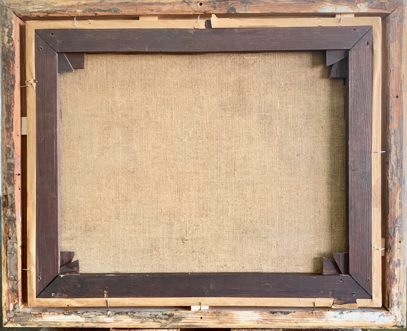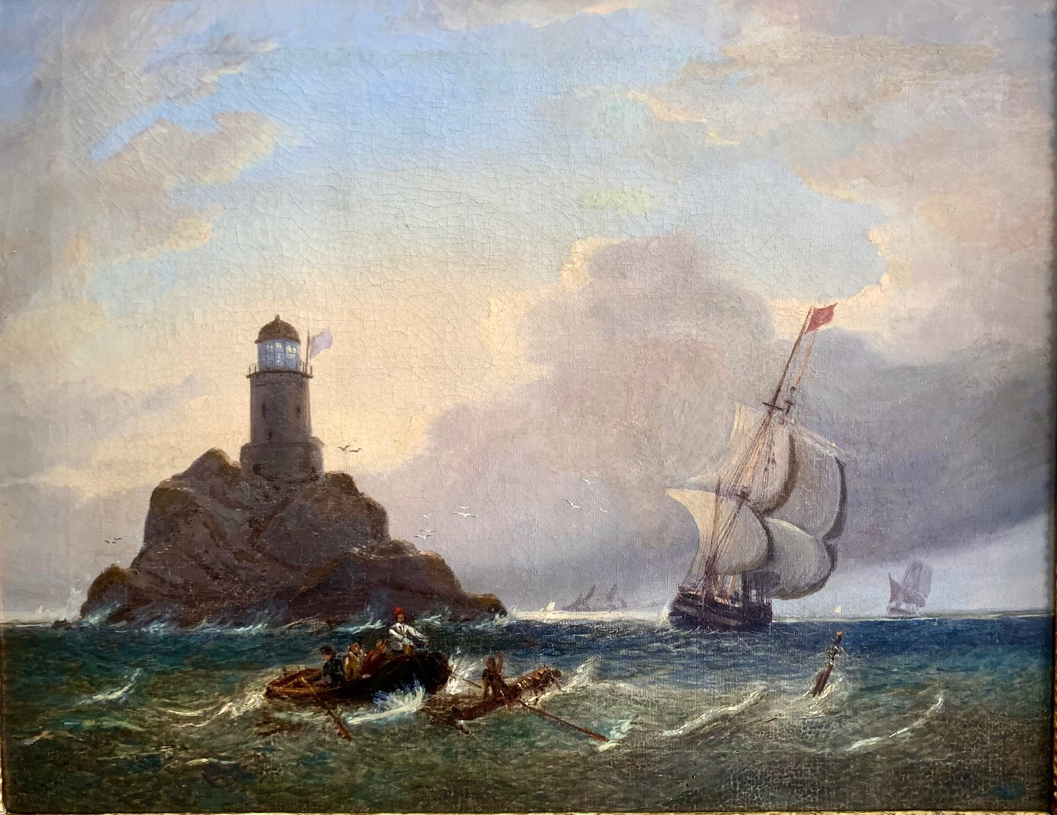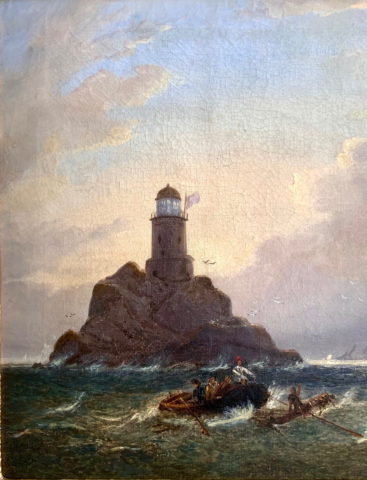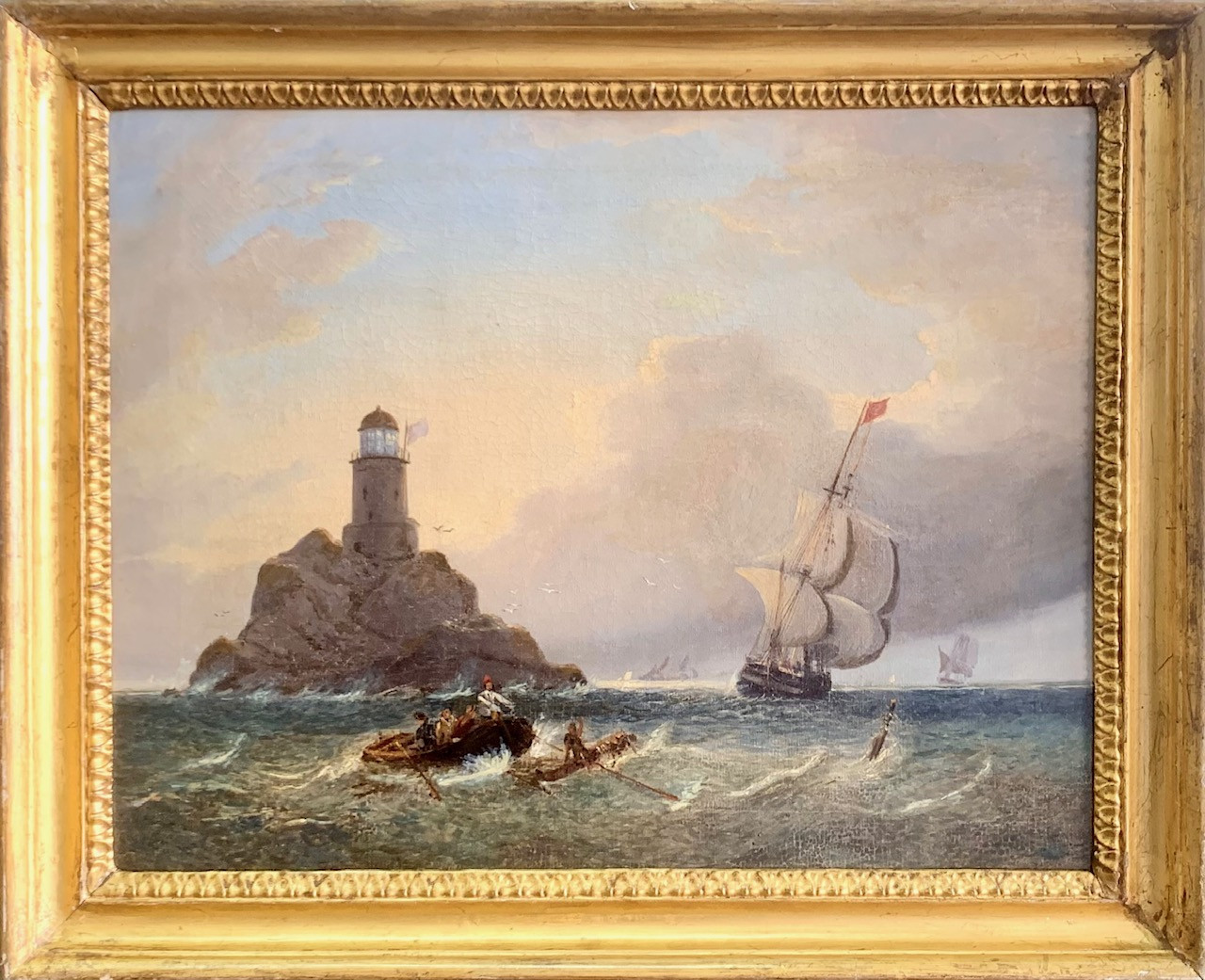 Escena de marina, naufragio y al fondo, pequeña isla rocosa con faro. Óleo sobre lienzo de mediados del Siglo XIX, escuela francesa. Enmarcación dorada de la misma época.