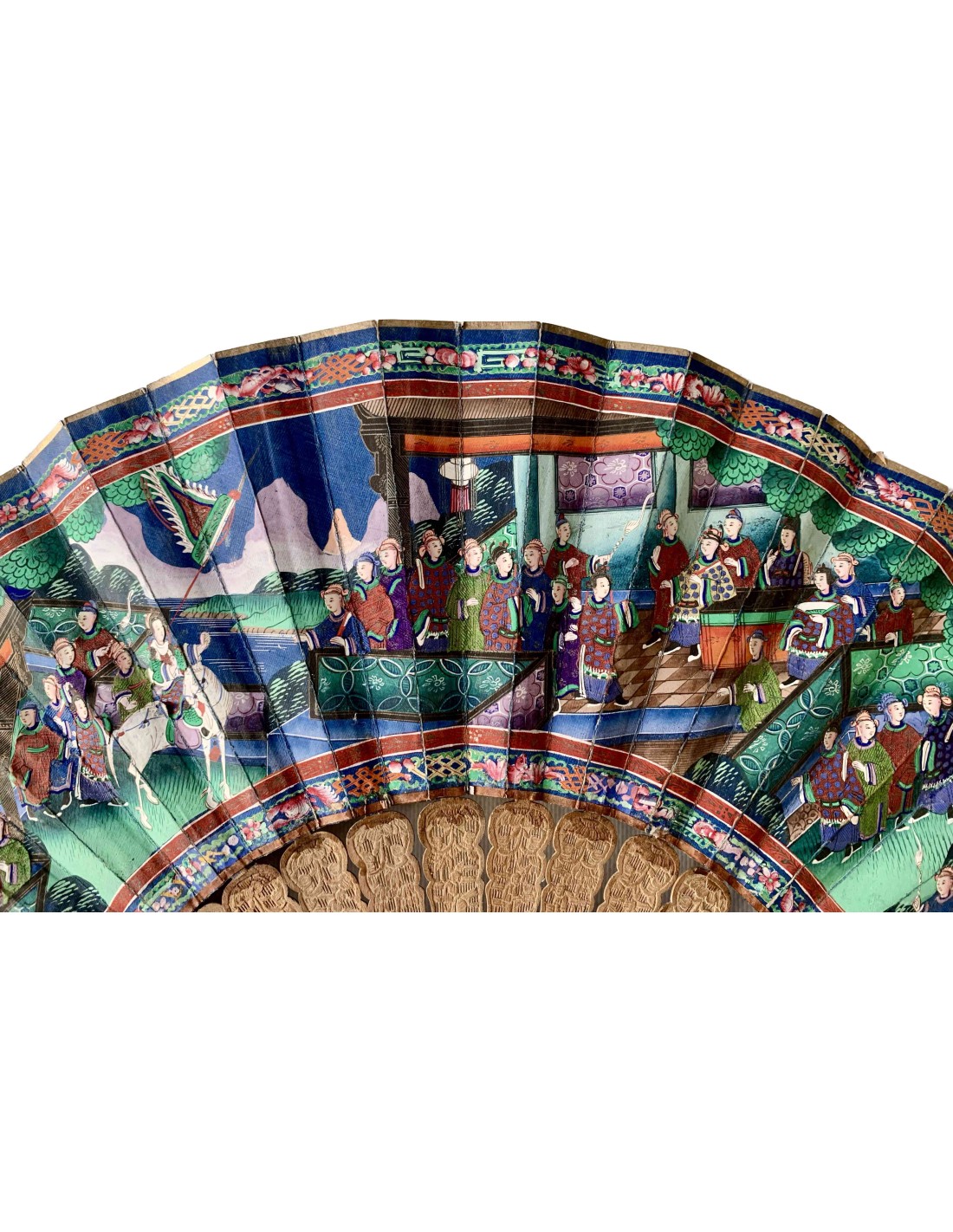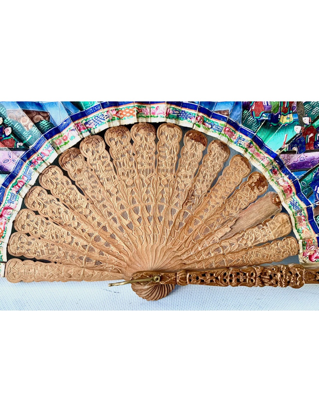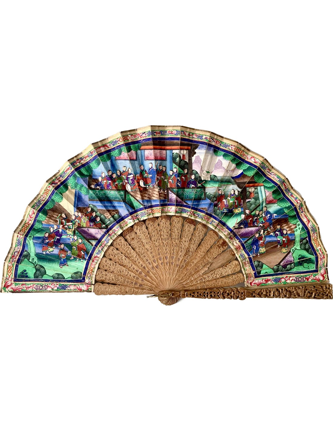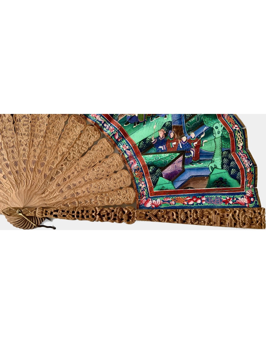 Abanico chino periodo Qing, Cantón, llamado “mil caras” siglo XIX, país en papel pintado al gouache, escena con varias figuras (con trajes en tela y caras pintada sobre hueso) en el templo, varillaje en madera tallada.