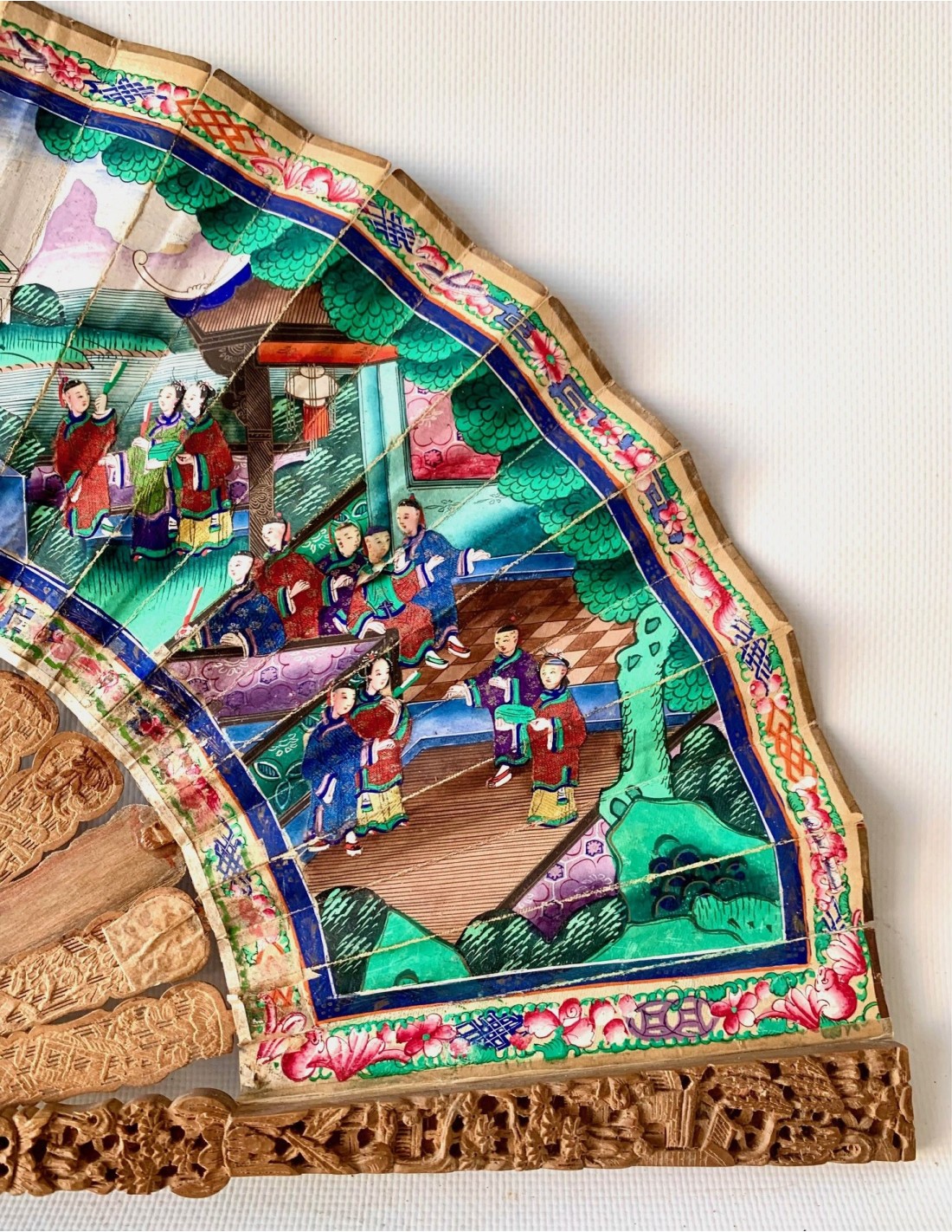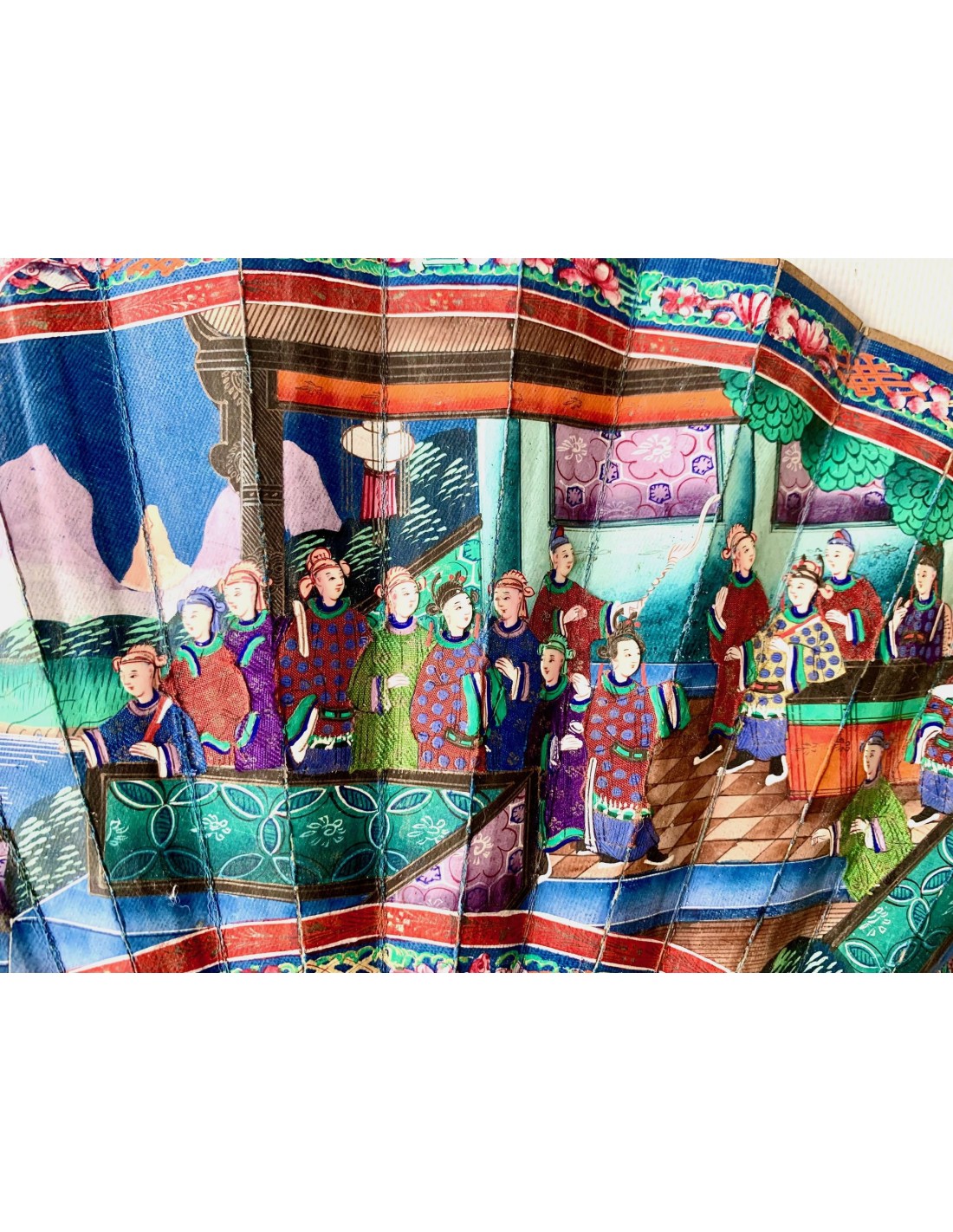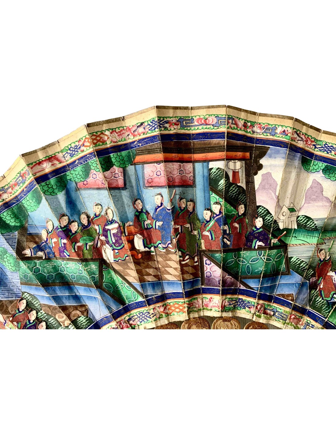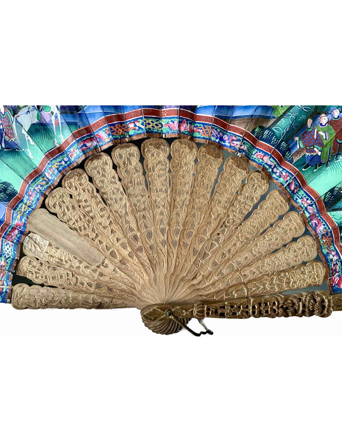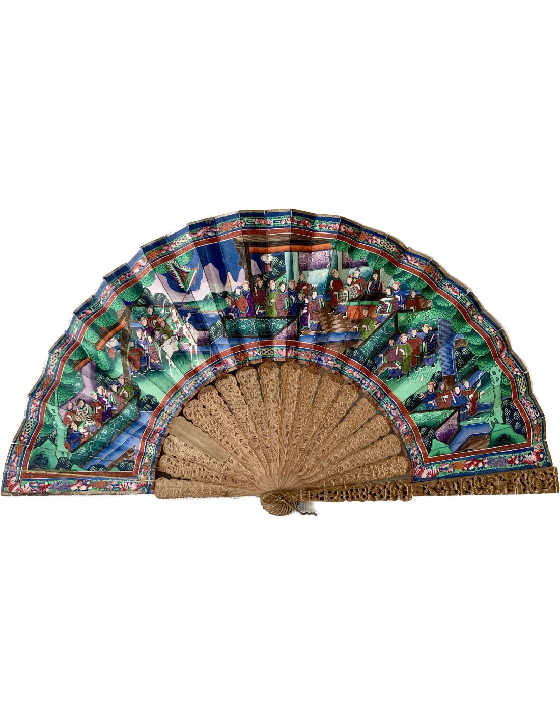 Abanico chino periodo Qing, Cantón, llamado “mil caras” siglo XIX, país en papel pintado al gouache, escena con varias figuras (con trajes en tela y caras pintada sobre hueso) en el templo, varillaje en madera tallada.