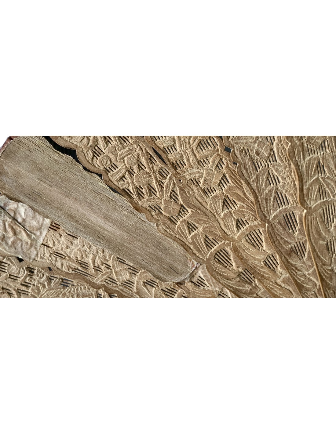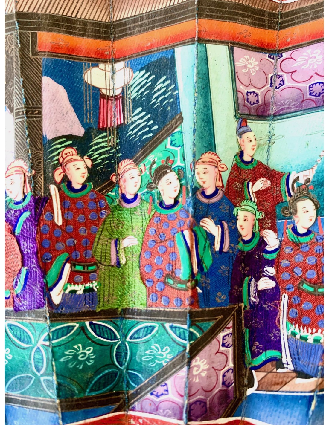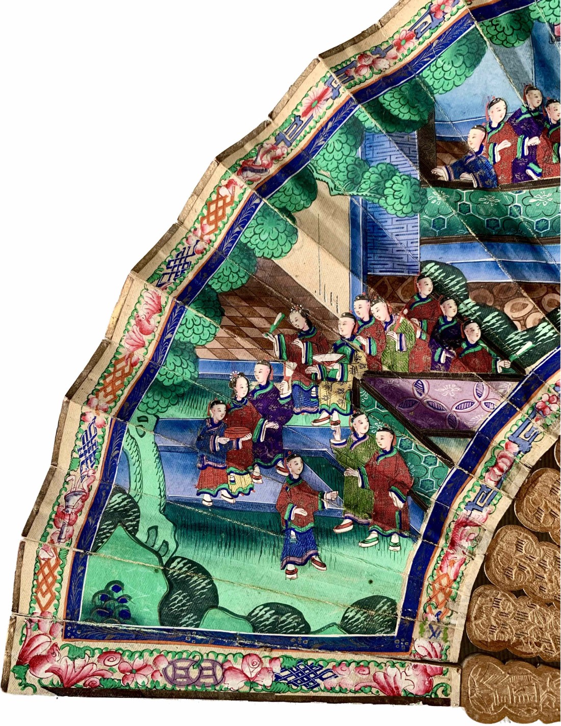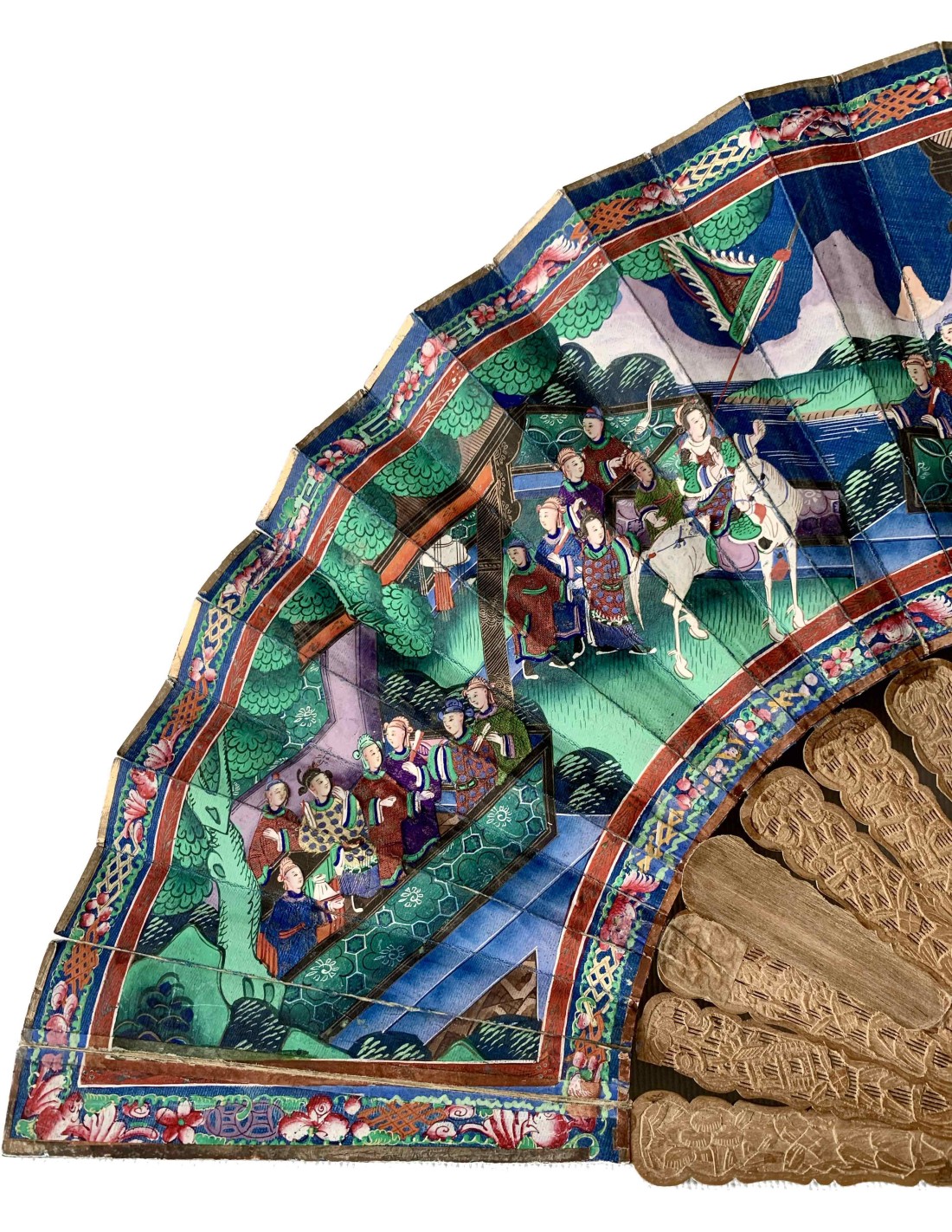 Abanico chino periodo Qing, Cantón, llamado “mil caras” siglo XIX, país en papel pintado al gouache, escena con varias figuras (con trajes en tela y caras pintada sobre hueso) en el templo, varillaje en madera tallada.