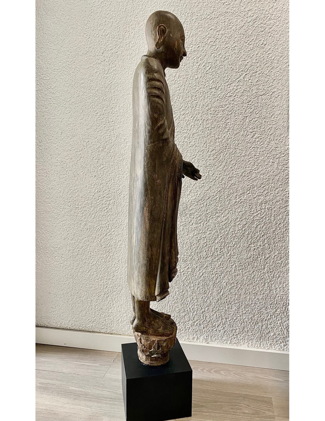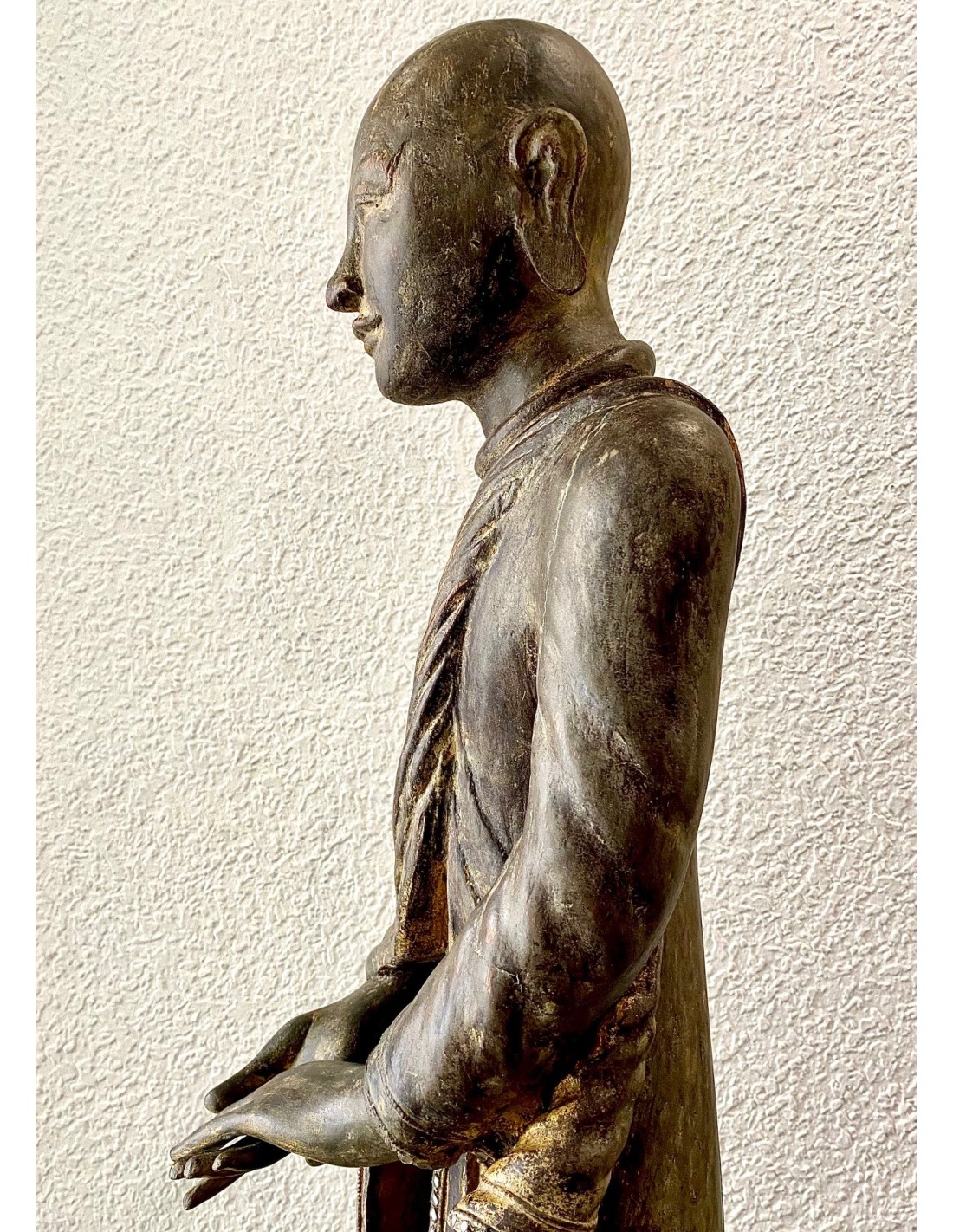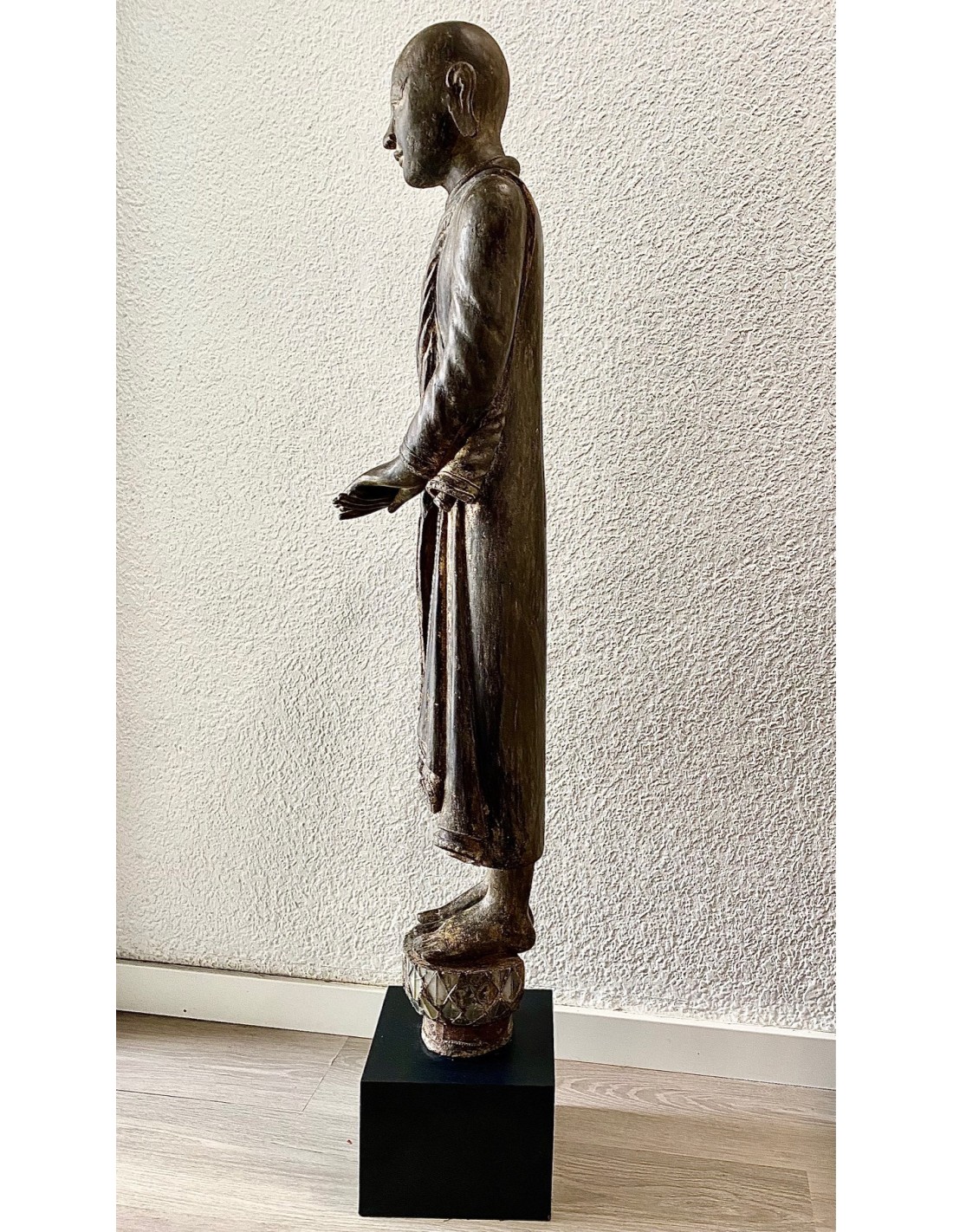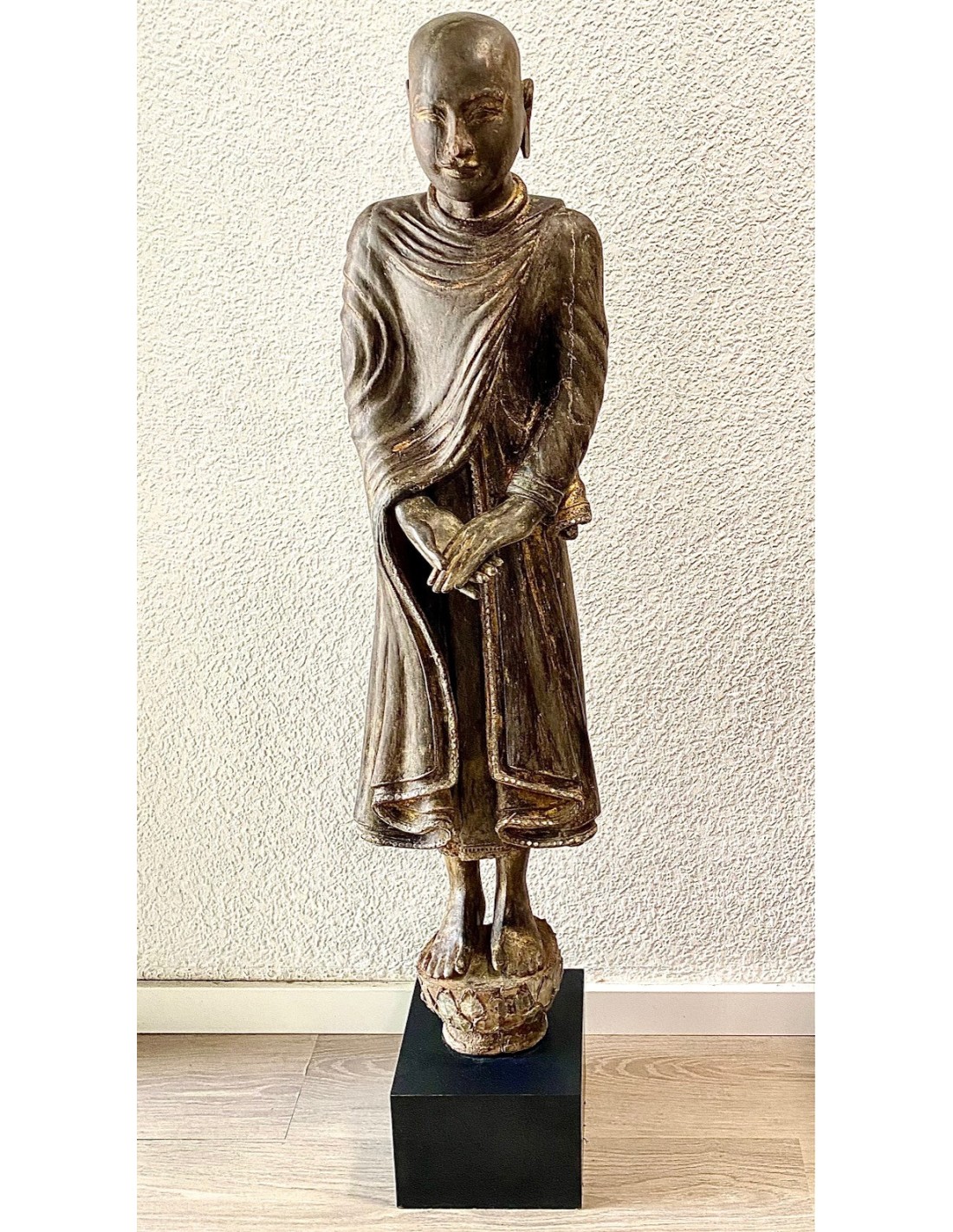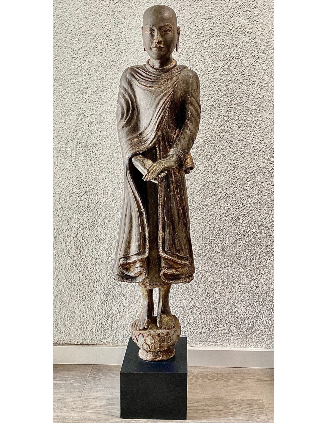 Figura de Buda Mandalay de pie sobre una base cuadrada negra. Madera maciza tallada y dorada. Birmania de finales del Siglo XVIII principios Siglo XIX. La postura es natural, con el rostro sereno y una leve sonrisa. Vestido con túnica monástica (uttarasanga) decorada con incrustaciones en vidrio.