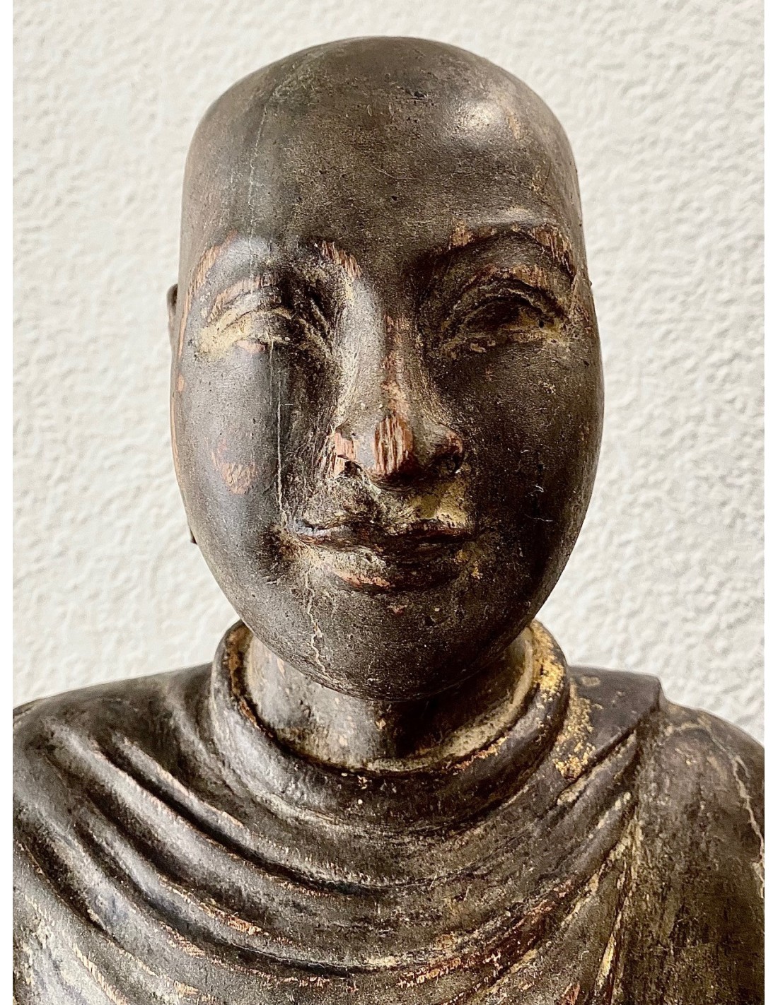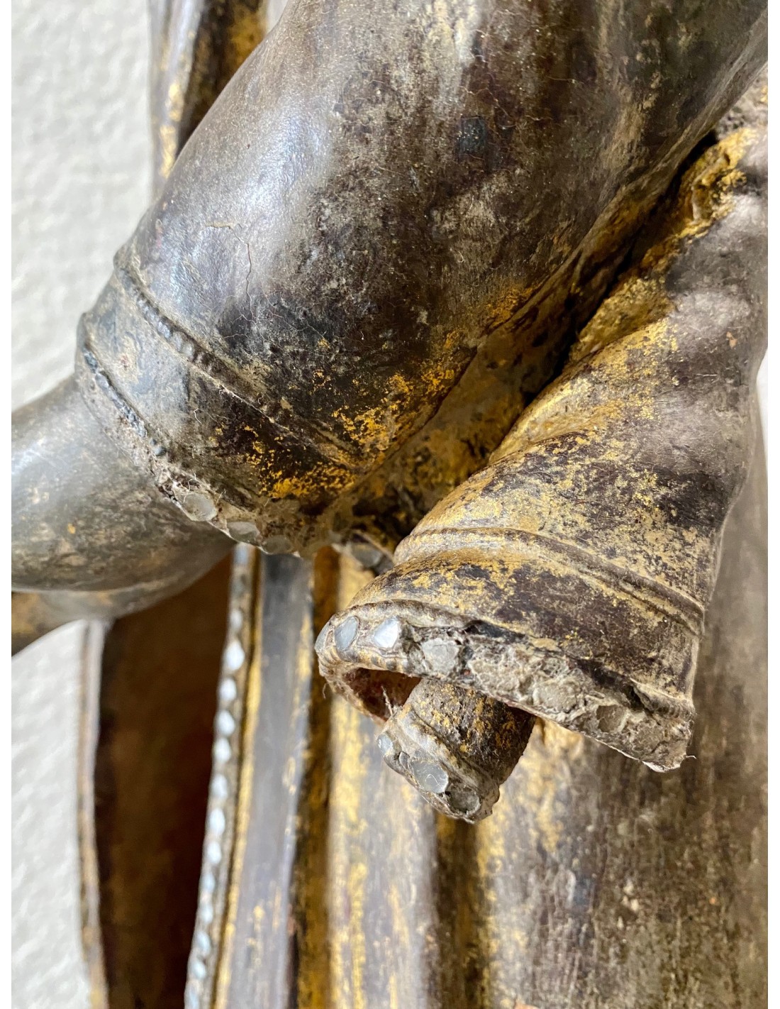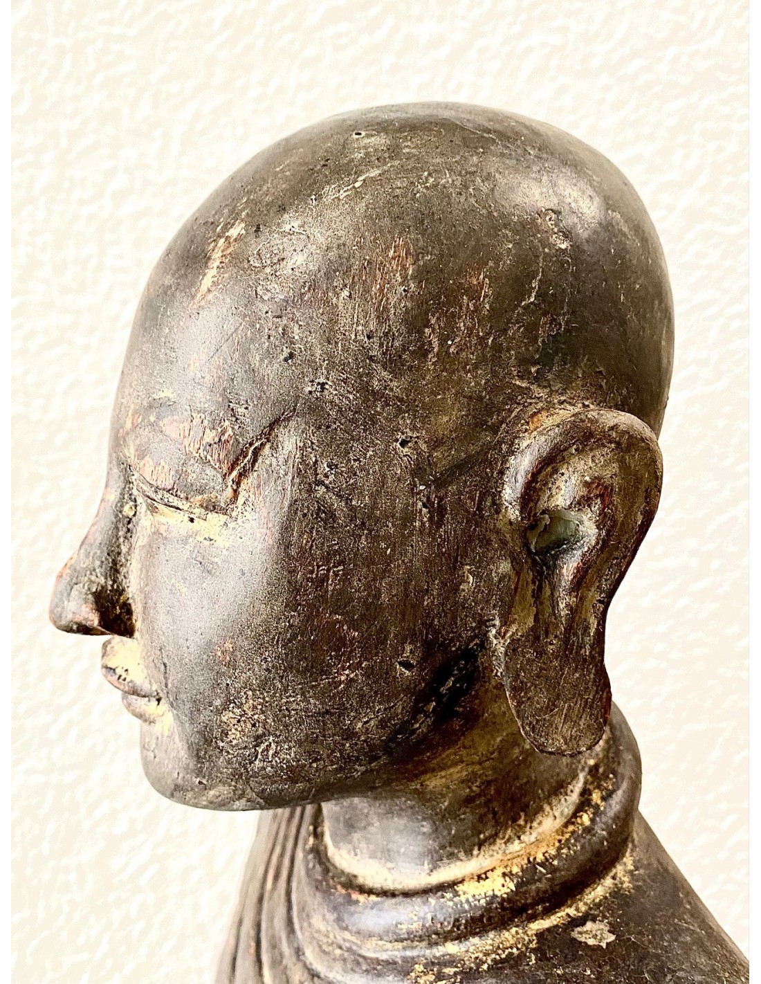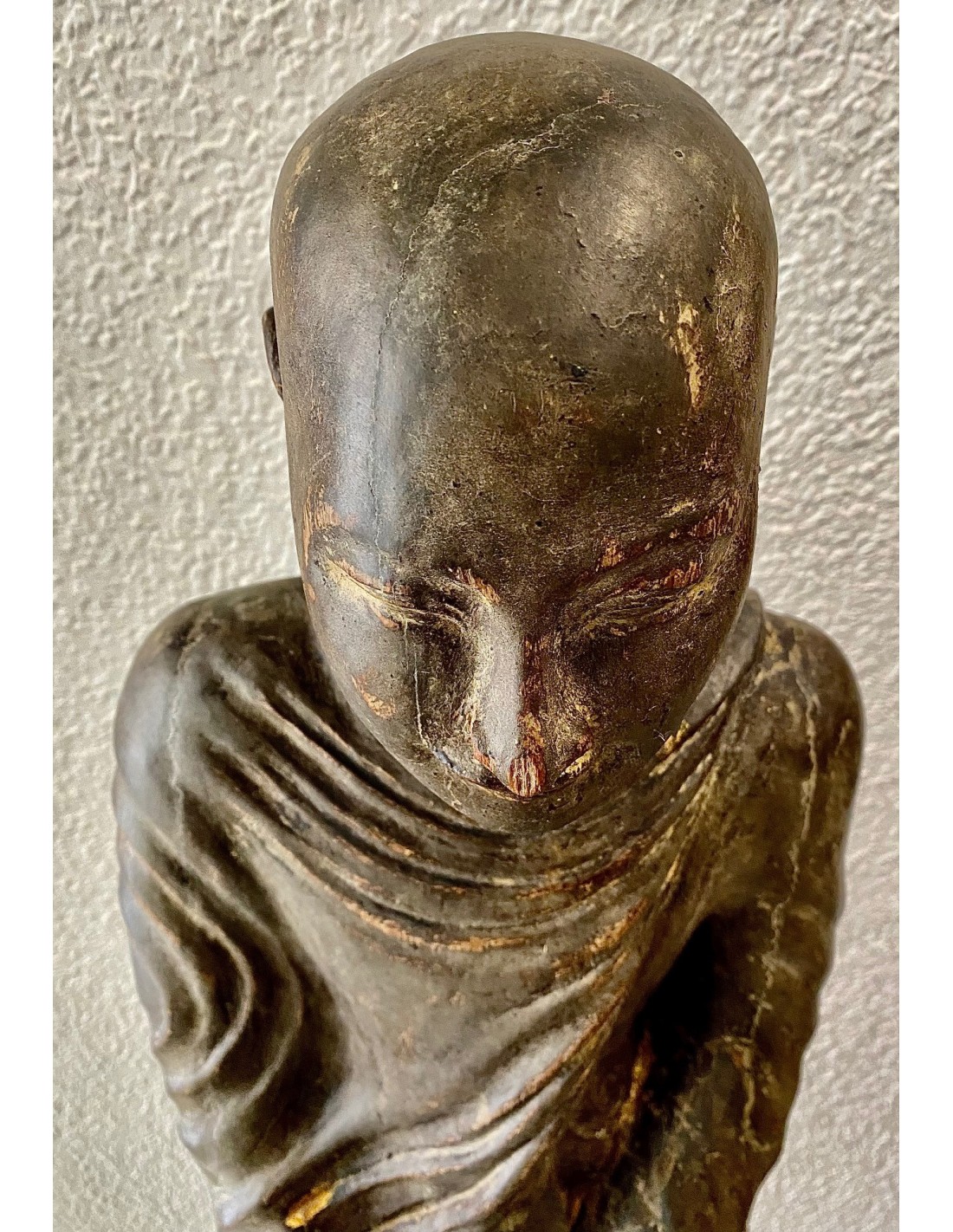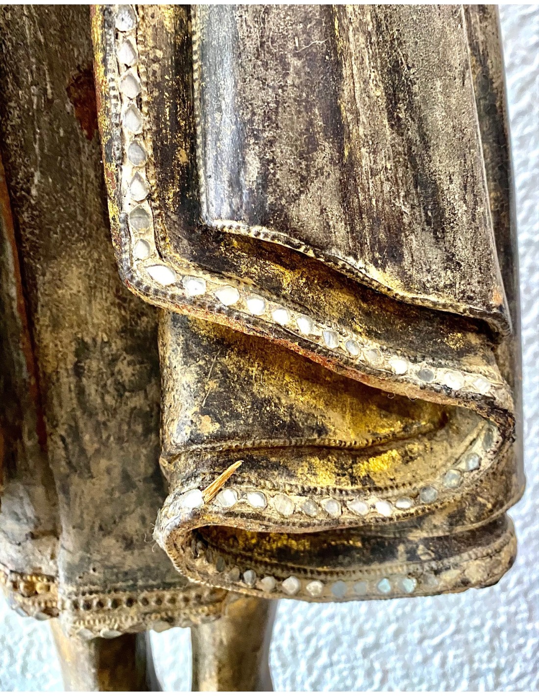 Figura de Buda Mandalay de pie sobre una base cuadrada negra. Madera maciza tallada y dorada. Birmania de finales del Siglo XVIII principios Siglo XIX. La postura es natural, con el rostro sereno y una leve sonrisa. Vestido con túnica monástica (uttarasanga) decorada con incrustaciones en vidrio.