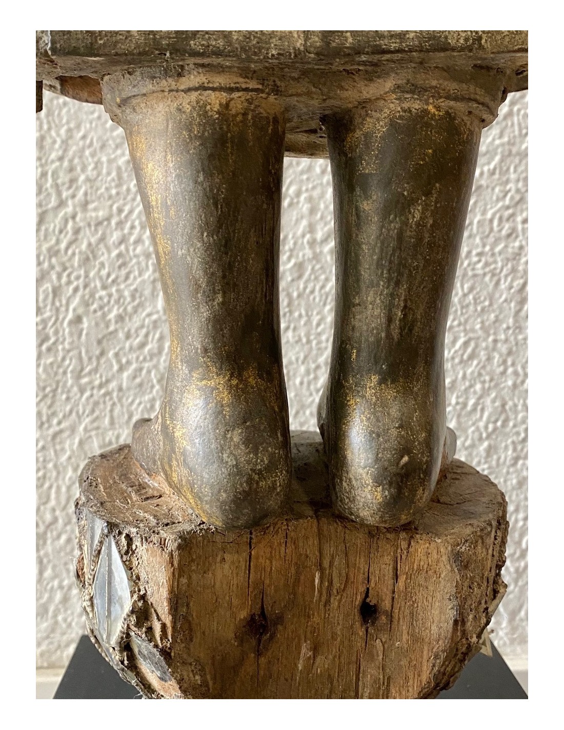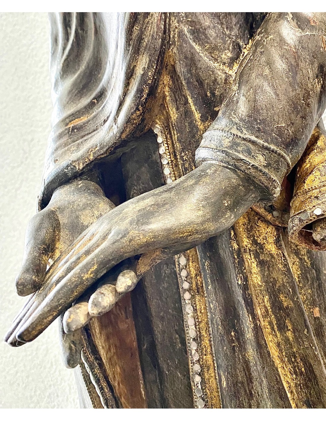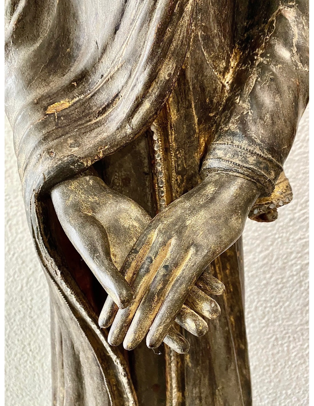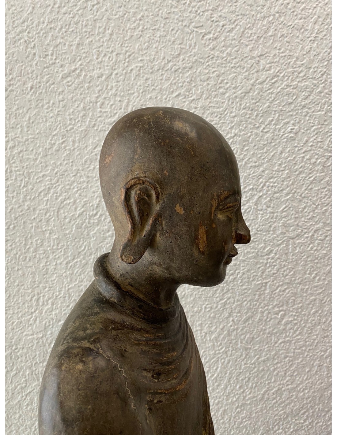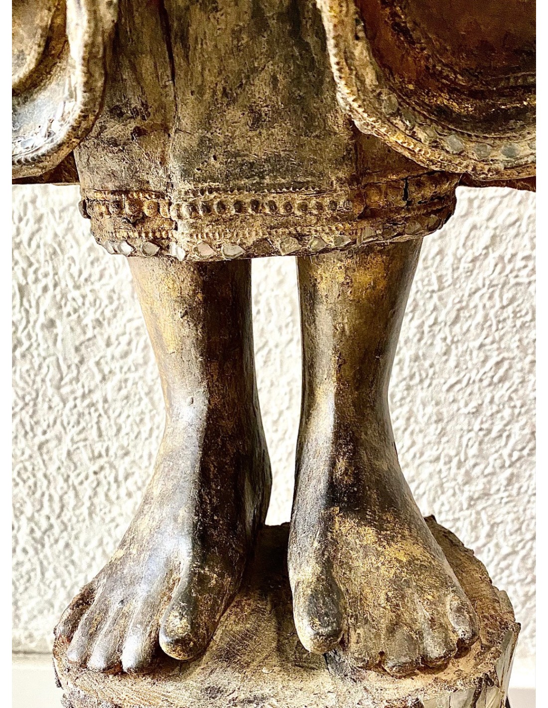 Figura de Buda Mandalay de pie sobre una base cuadrada negra. Madera maciza tallada y dorada. Birmania de finales del Siglo XVIII principios Siglo XIX. La postura es natural, con el rostro sereno y una leve sonrisa. Vestido con túnica monástica (uttarasanga) decorada con incrustaciones en vidrio.