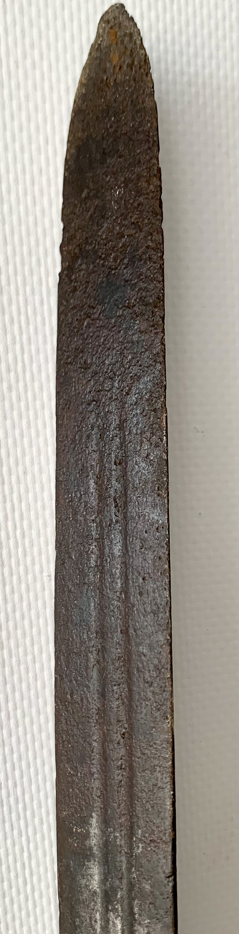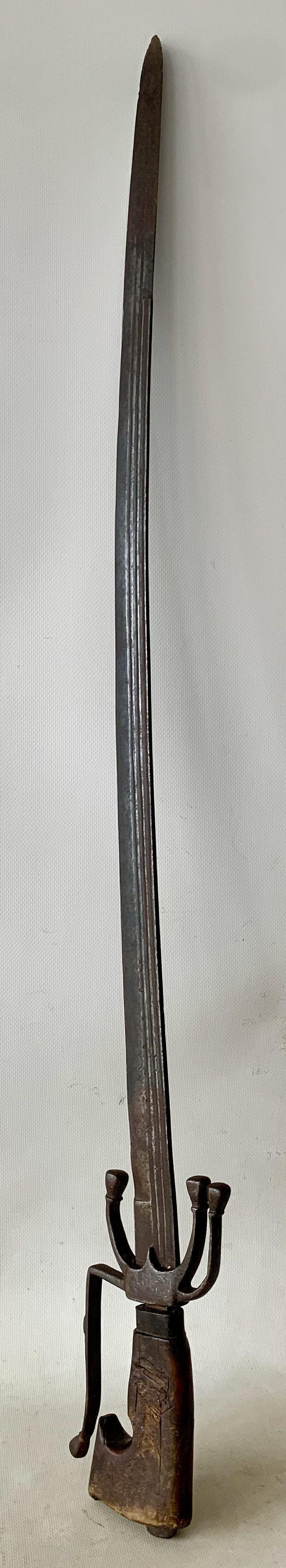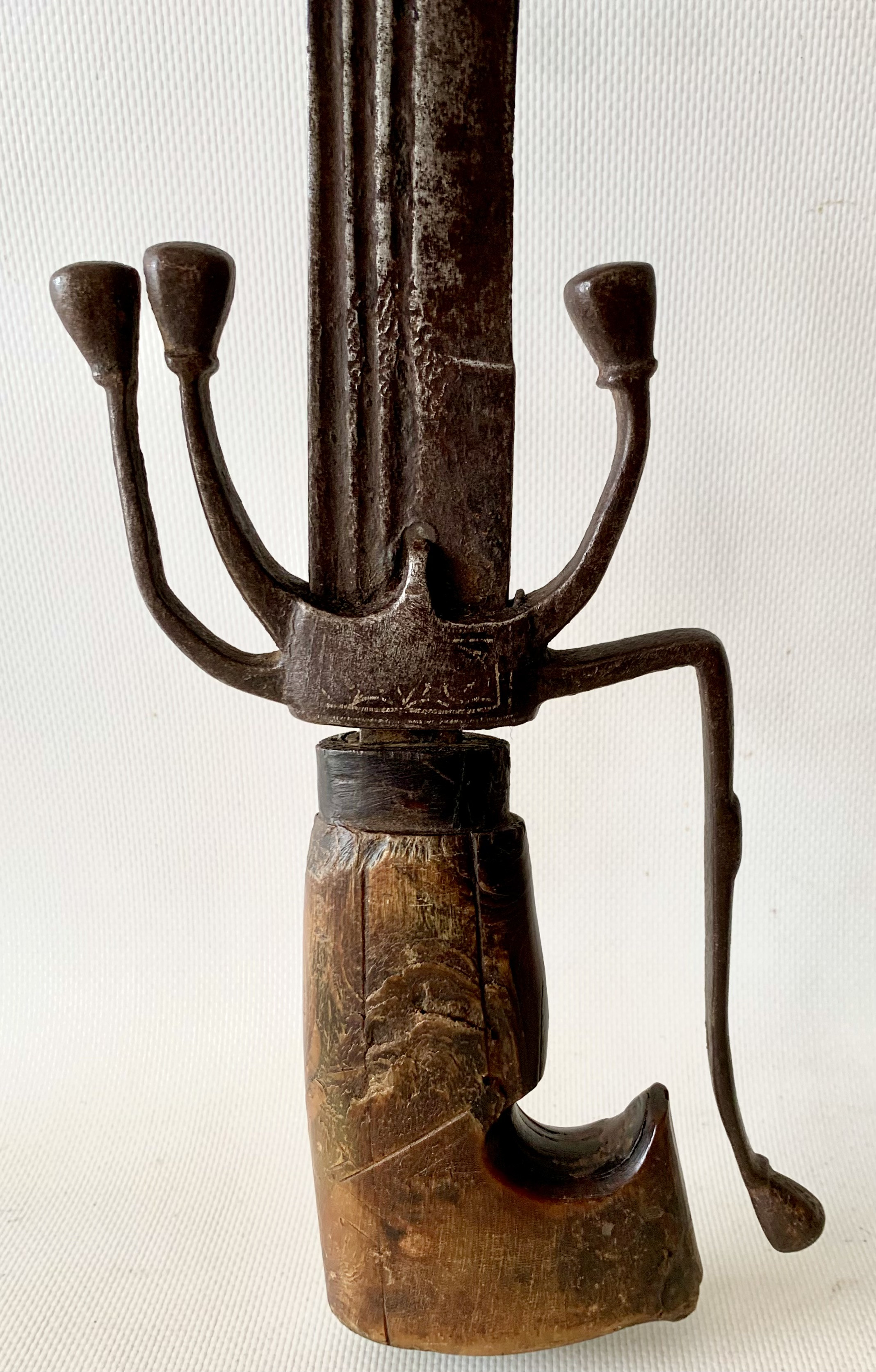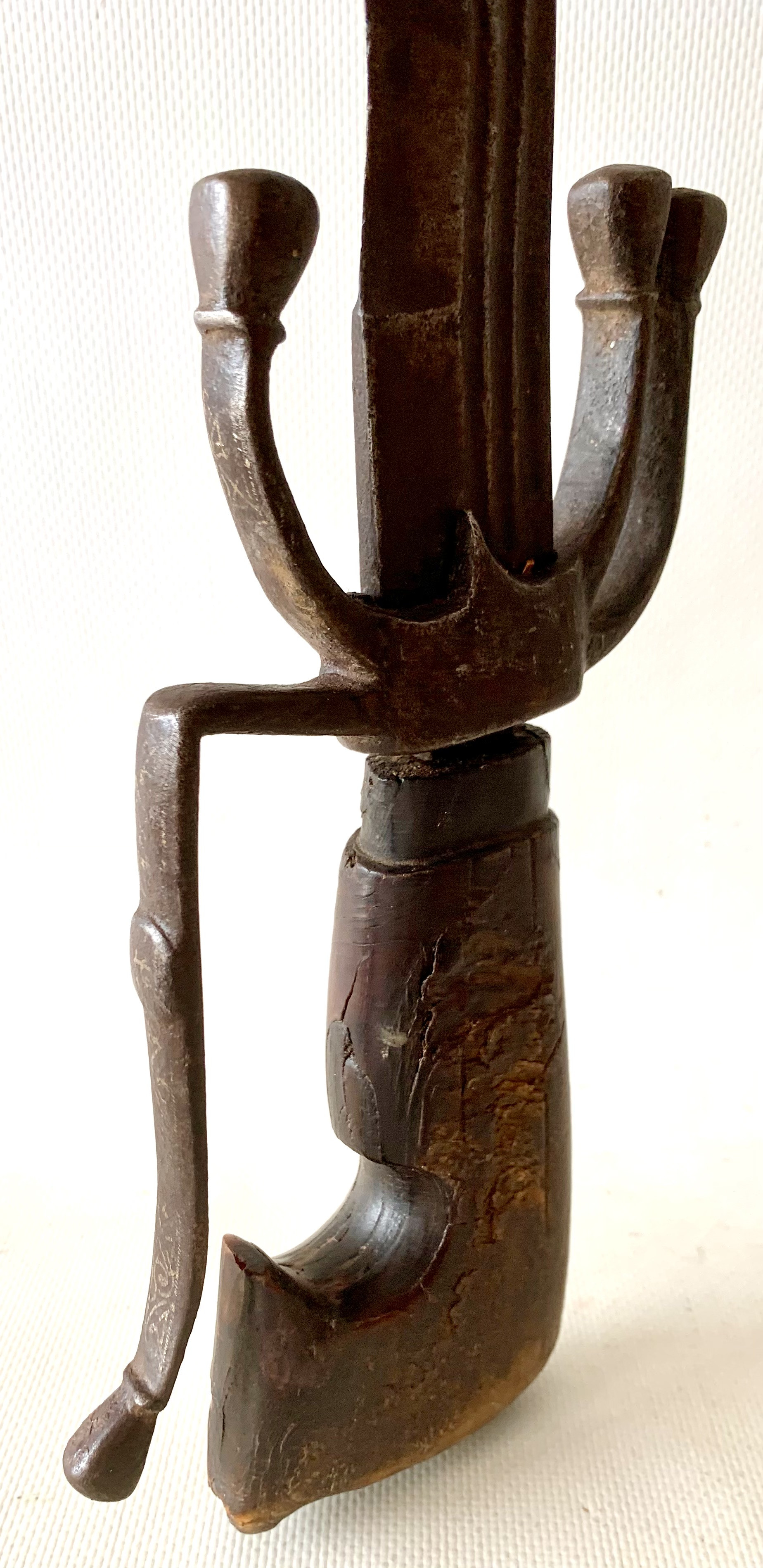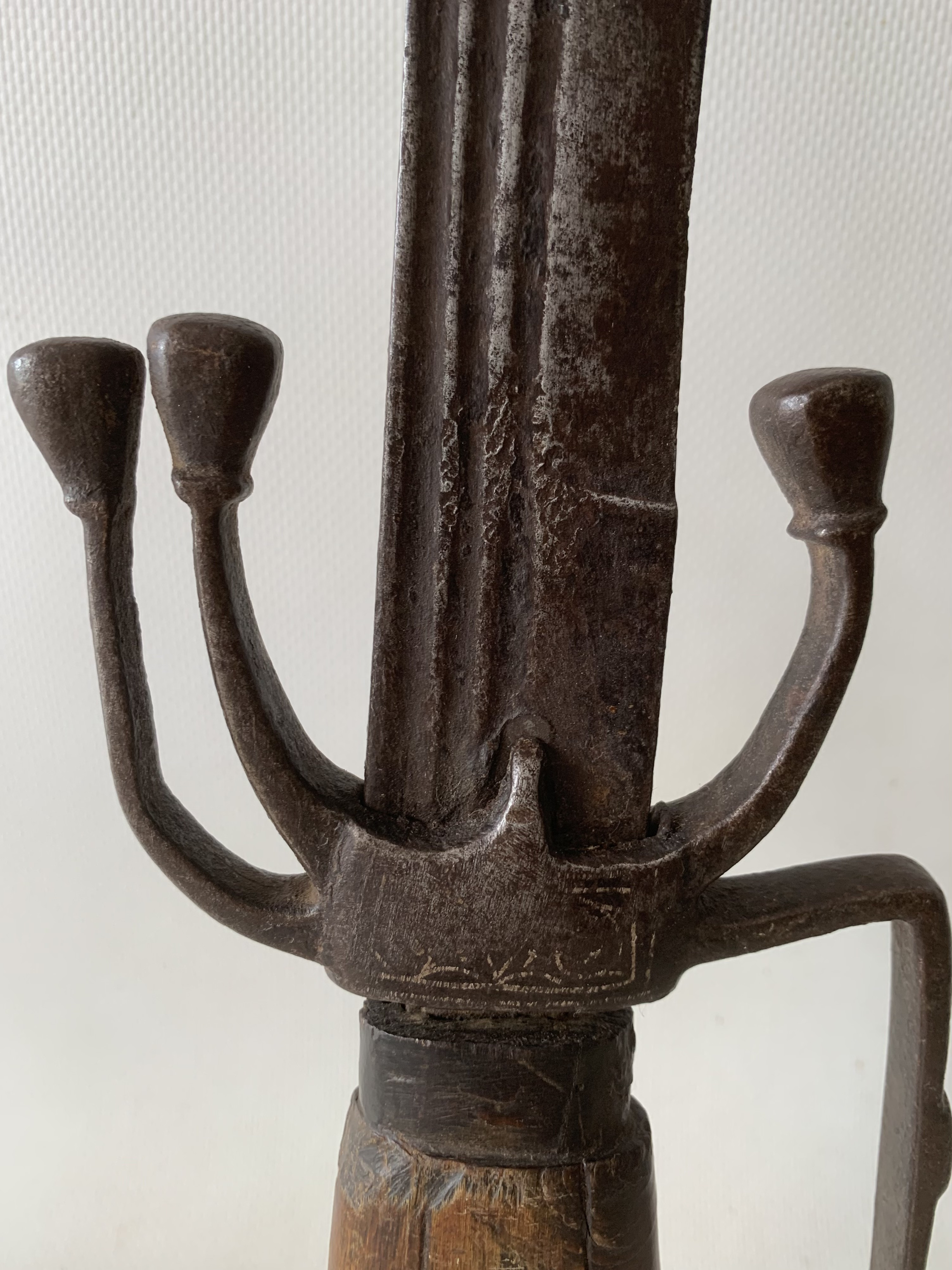 Sabre nimcha, Maruecos mitad del siglo XIX, bonita hoja de acero de triple canaladura y nombres grabados en ambas partes, guardia damasquinada en plata, empuñadura de asta (cuerno) tallada.