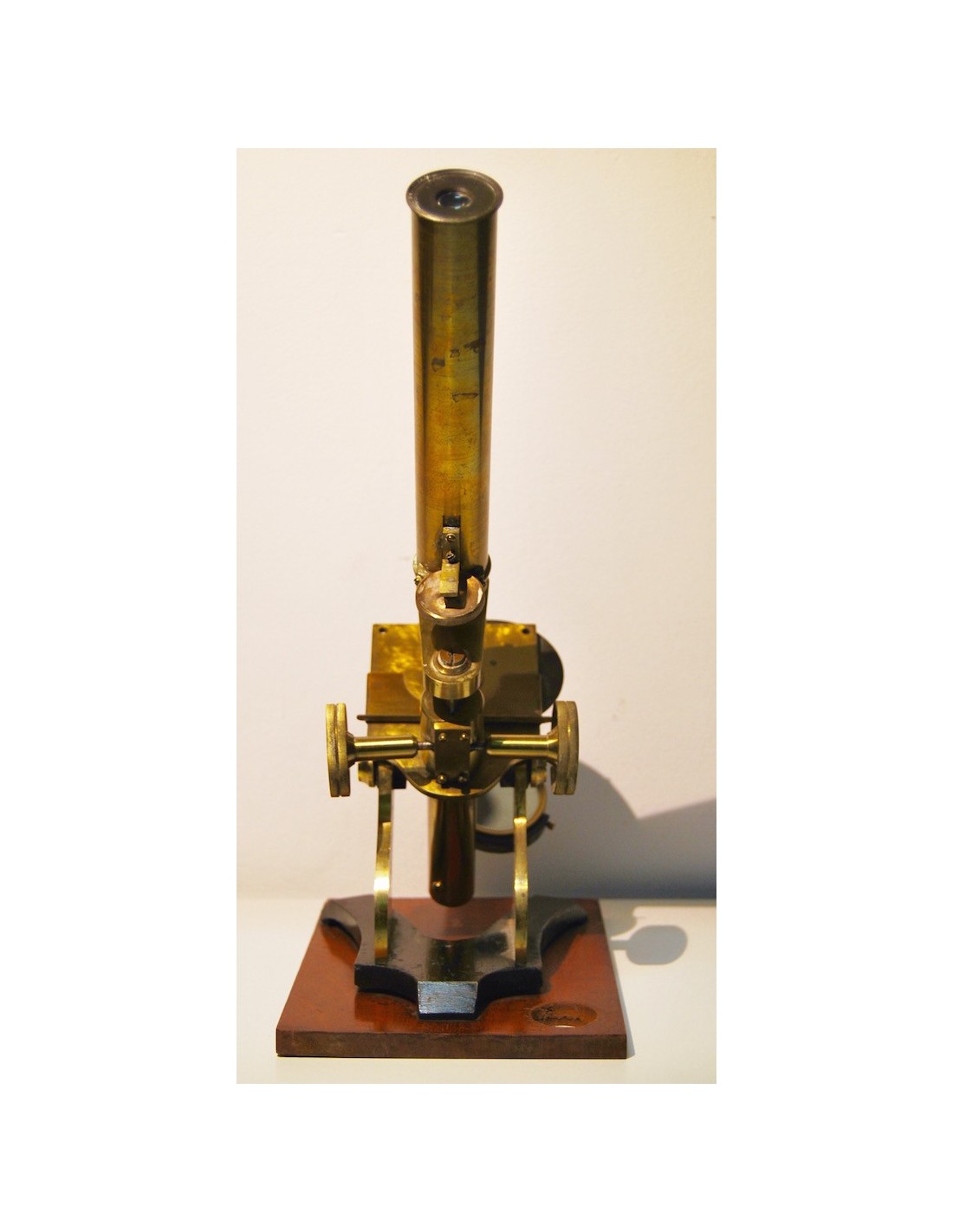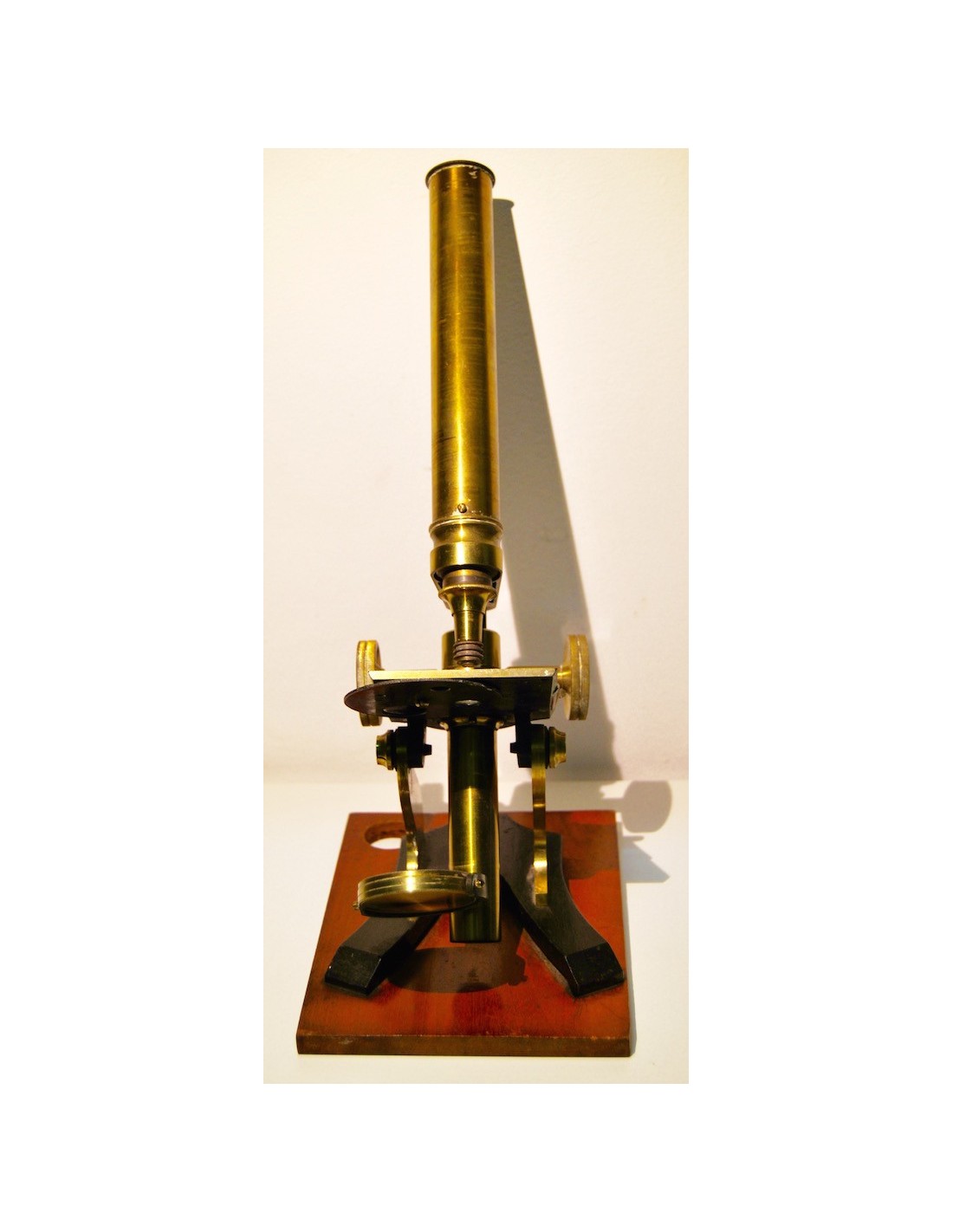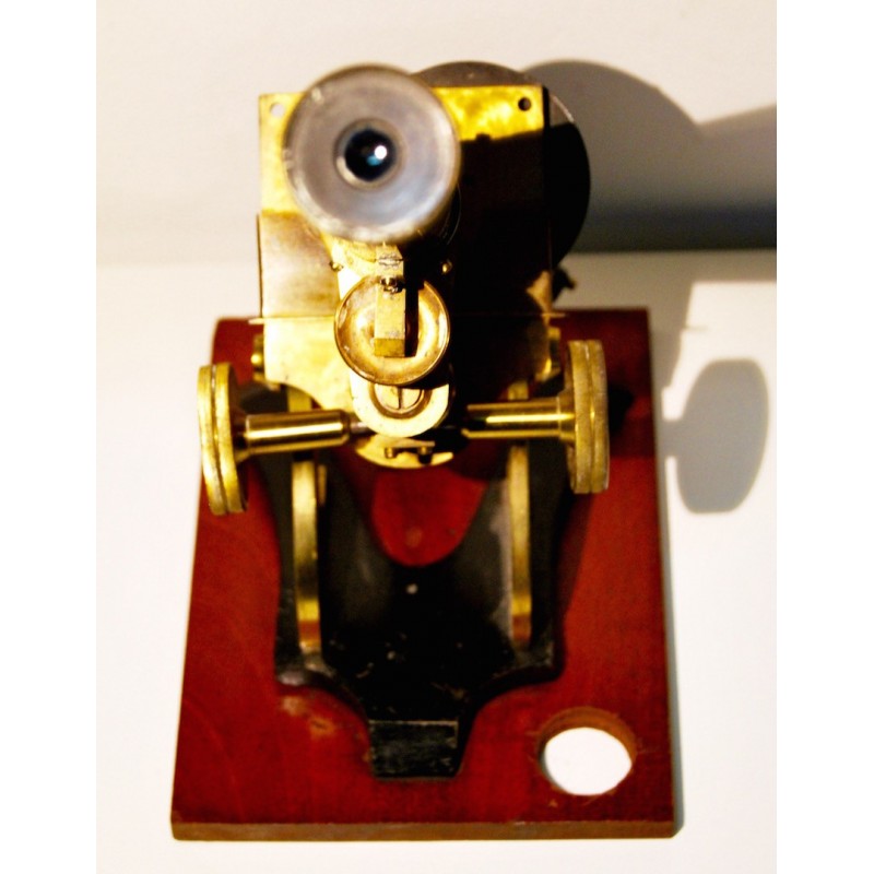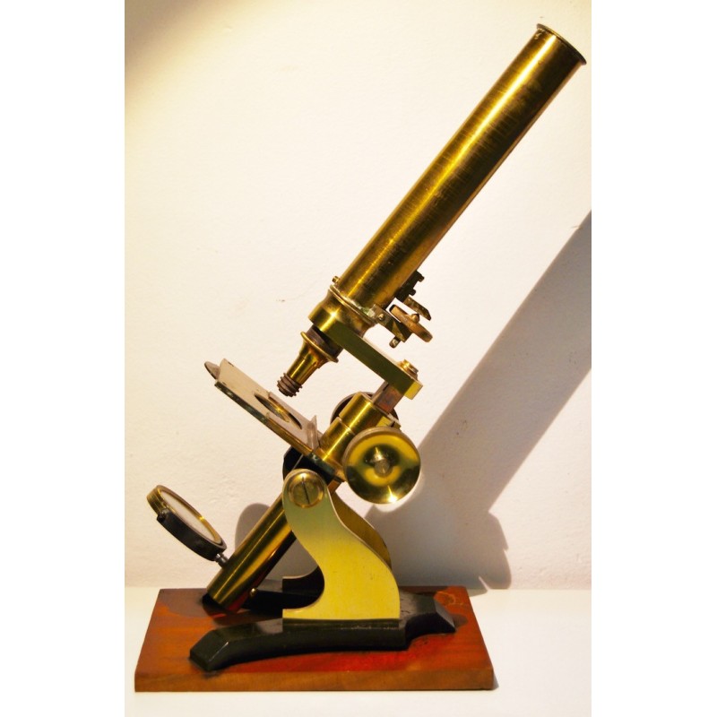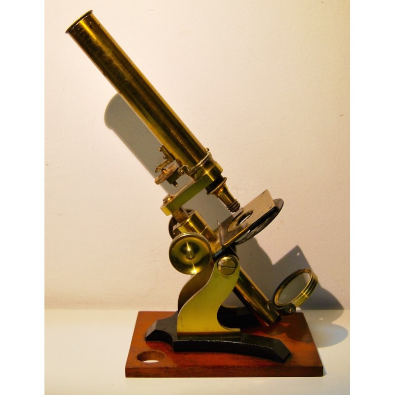 Antiguo microscopio inglés de finales del siglo XIX (1880-1890), base de madera a la cual se ancla el soporte de hierro fundido lacado negro, las demás partes del microscopio son de latón, sus tornillos y mecánicas se mueven correctamente.
