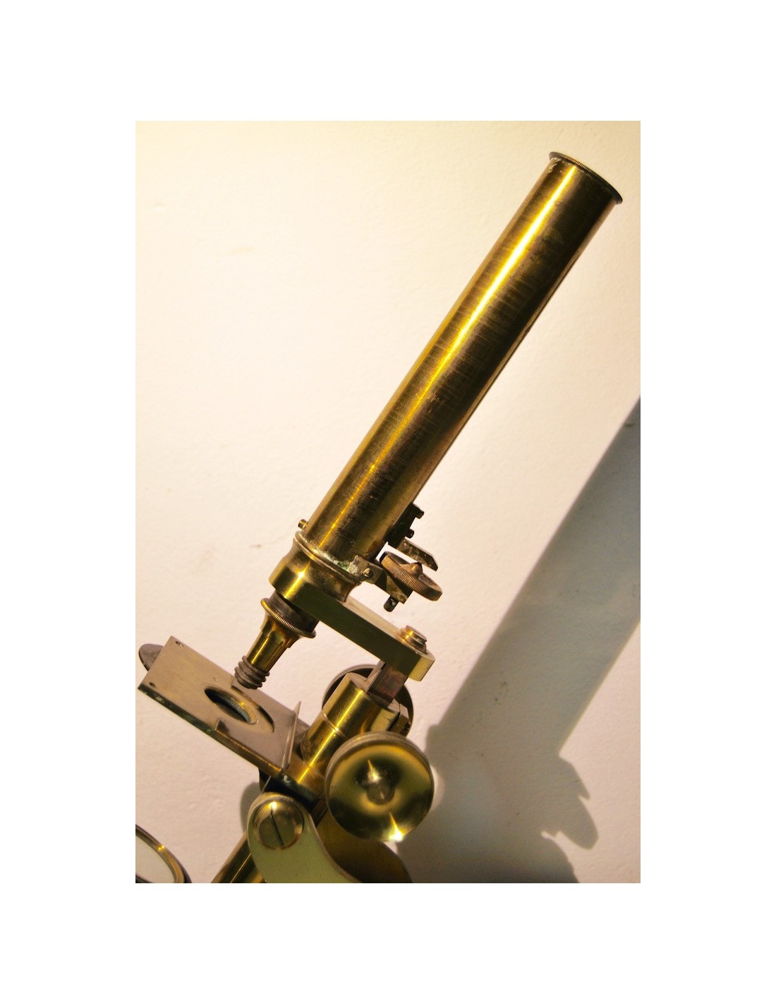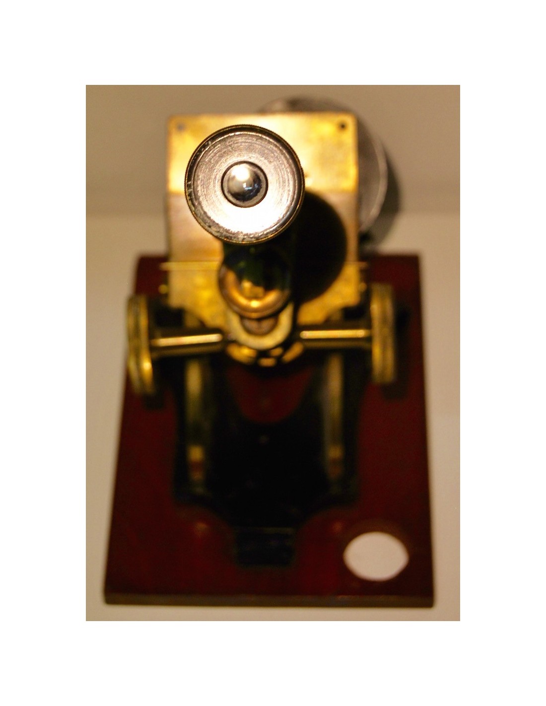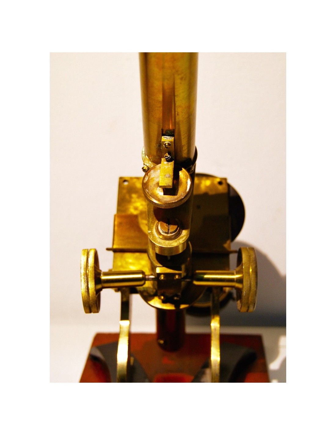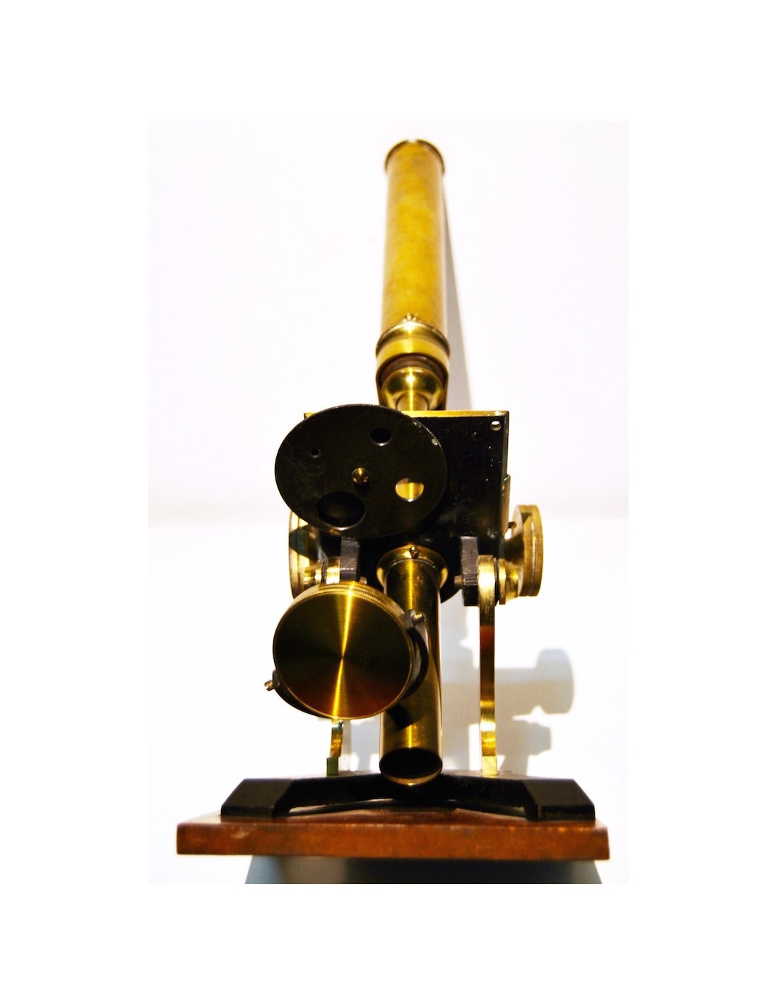 Antiguo microscopio inglés de finales del siglo XIX (1880-1890), base de madera a la cual se ancla el soporte de hierro fundido lacado negro, las demás partes del microscopio son de latón, sus tornillos y mecánicas se mueven correctamente.