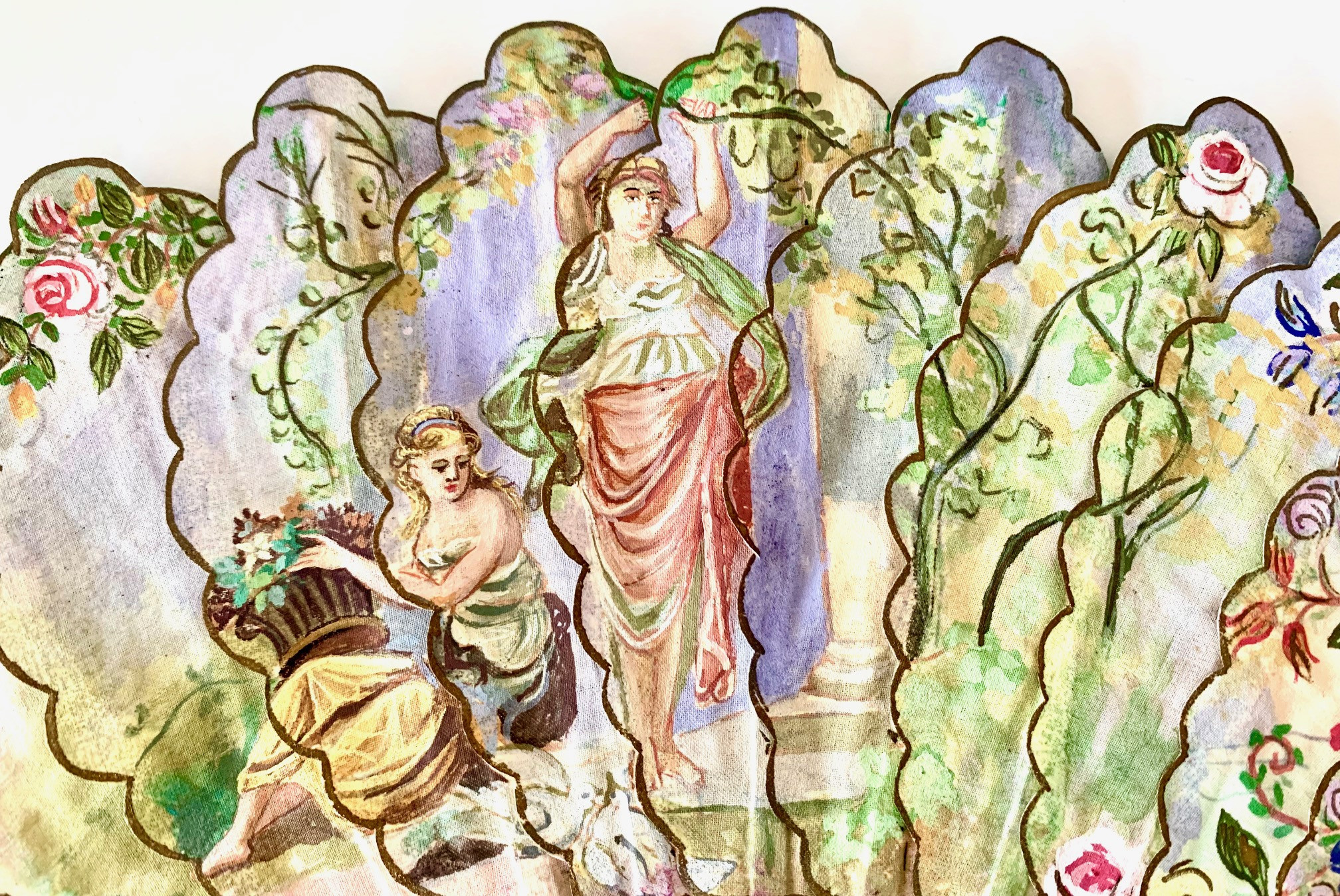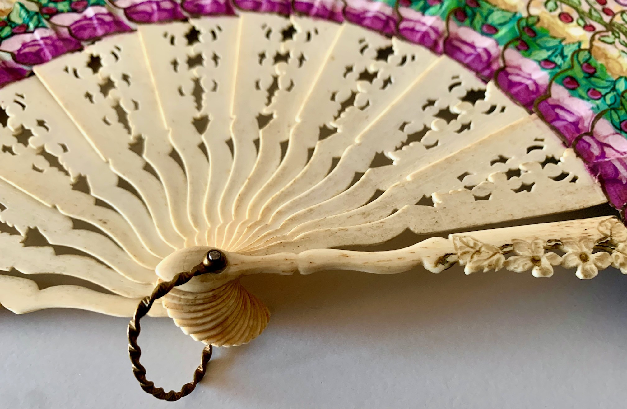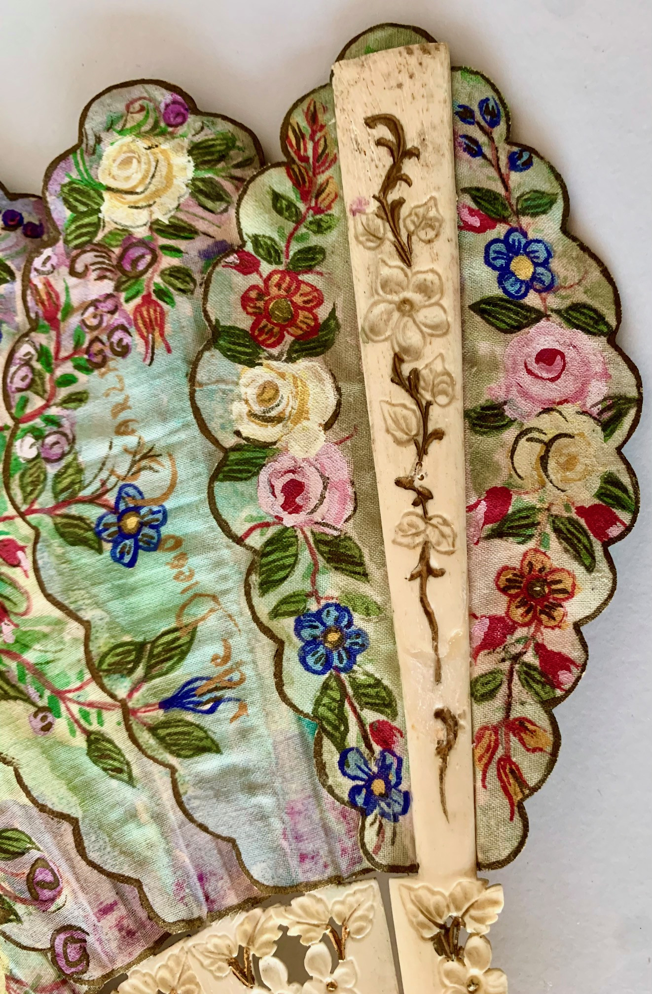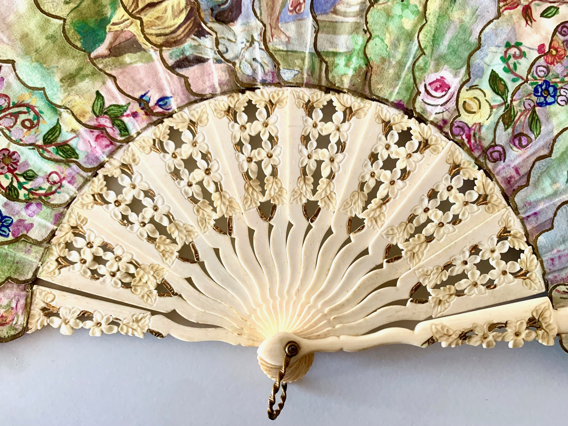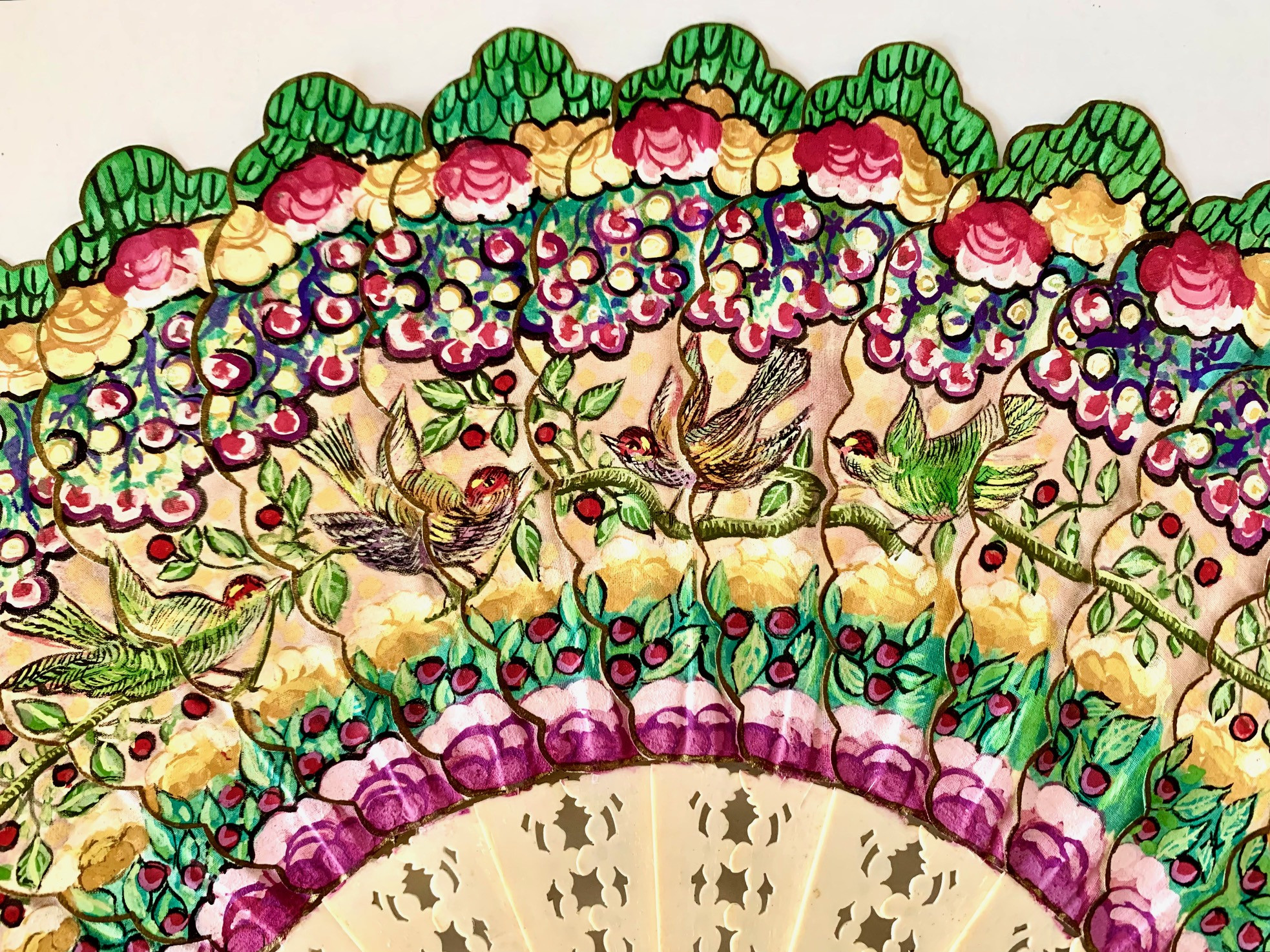 Abanico modernista finales siglo XIX principios del siglo XX, varillaje de hueso tallado y dorado, país de tela pintada con escena con figuras femeninas y flores por un lado y aves y flores por el otro lado. Bonita y rara forma polilobada de cada tela correspondiente a su varilla.