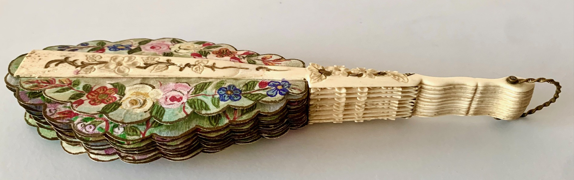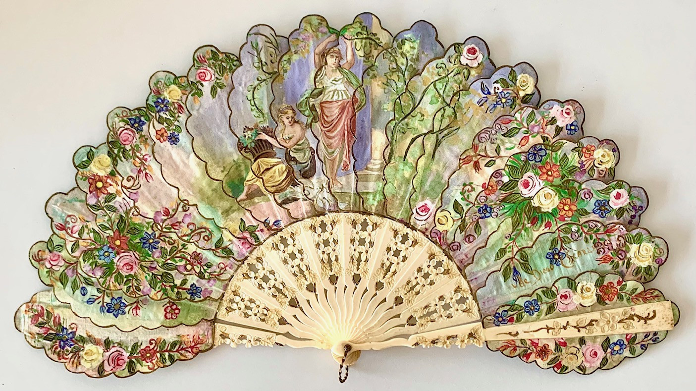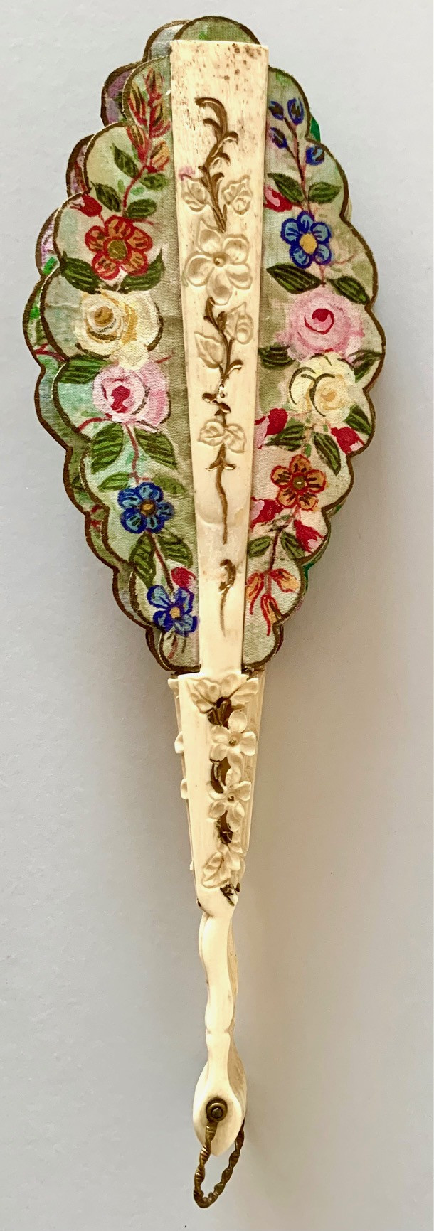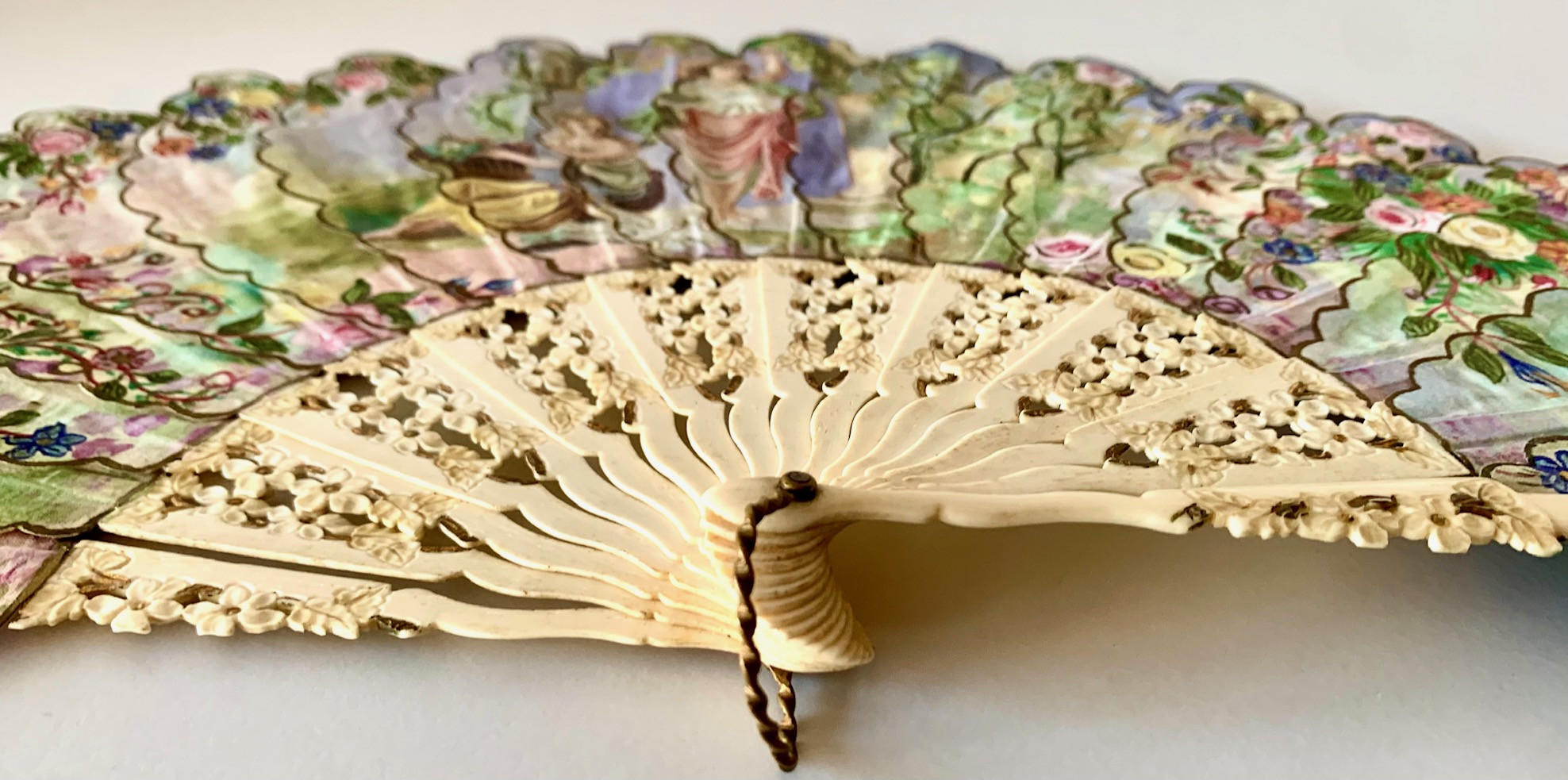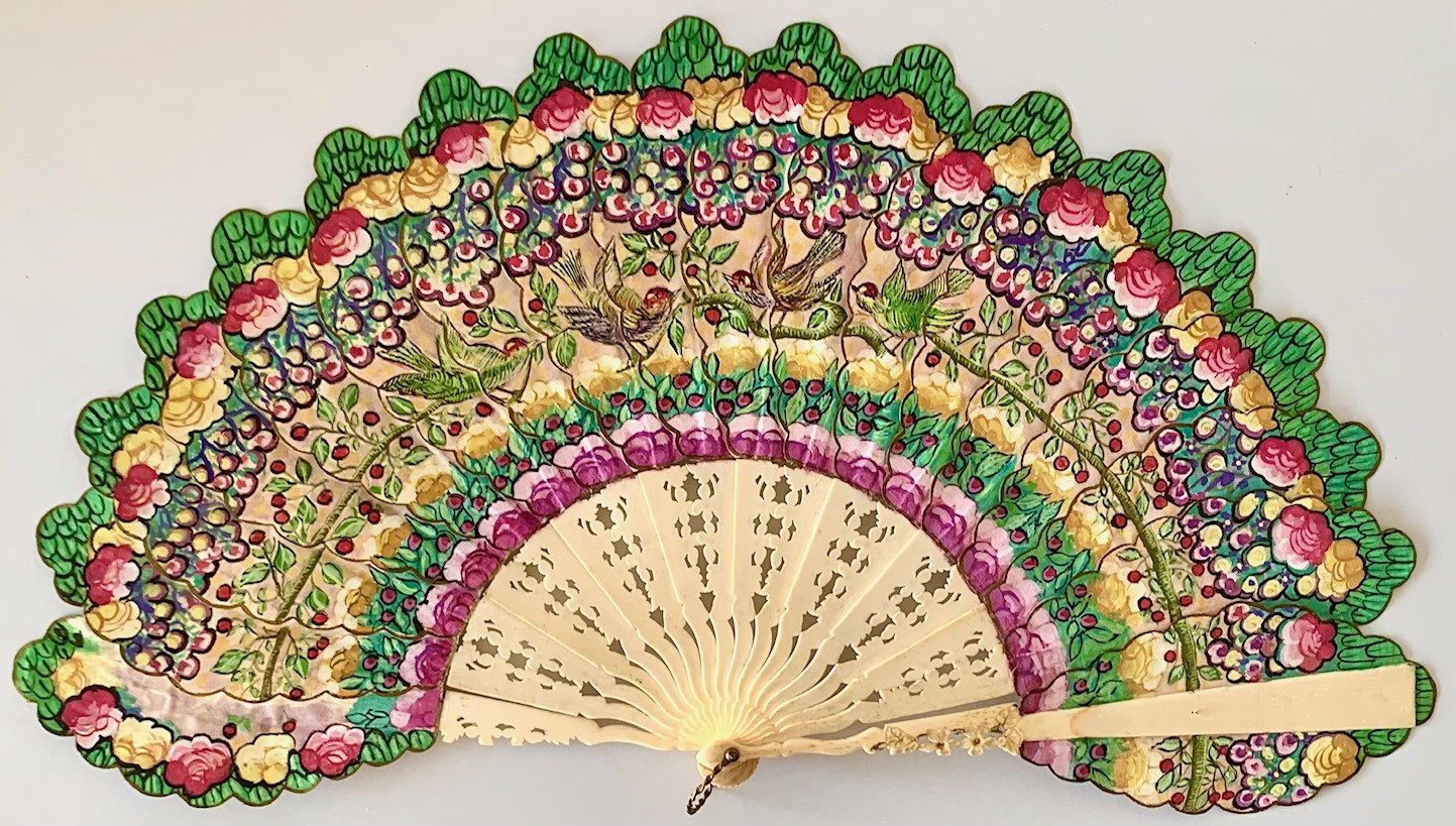 Abanico modernista finales siglo XIX principios del siglo XX, varillaje de hueso tallado y dorado, país de tela pintada con escena con figuras femeninas y flores por un lado y aves y flores por el otro lado. Bonita y rara forma polilobada de cada tela correspondiente a su varilla.