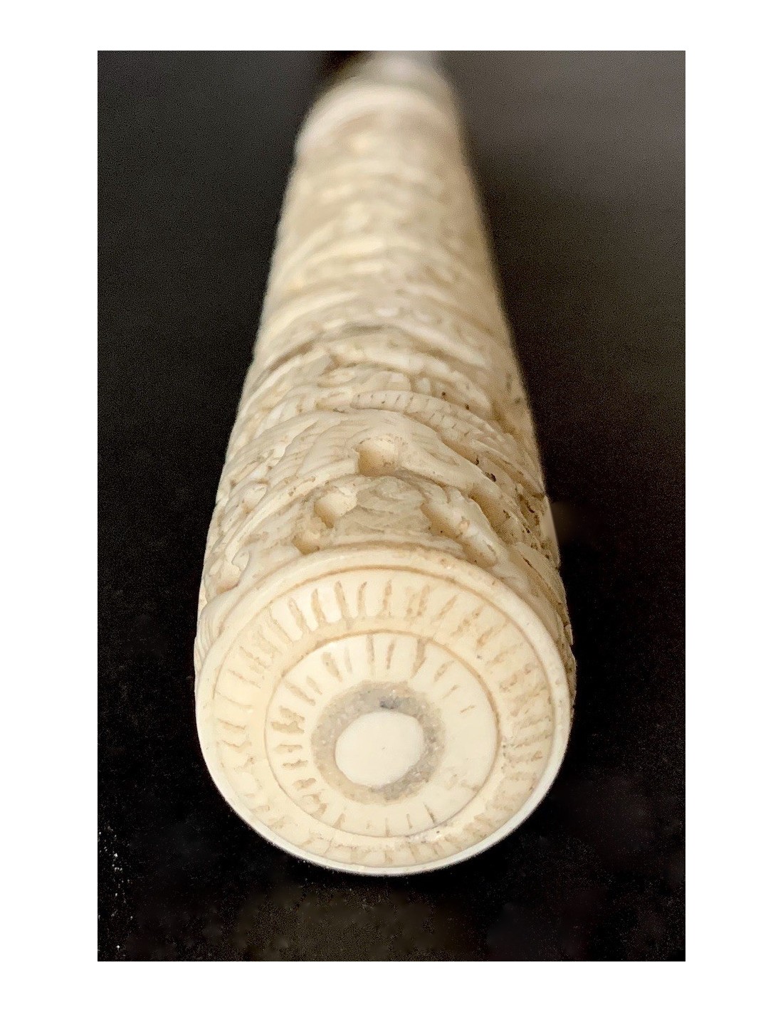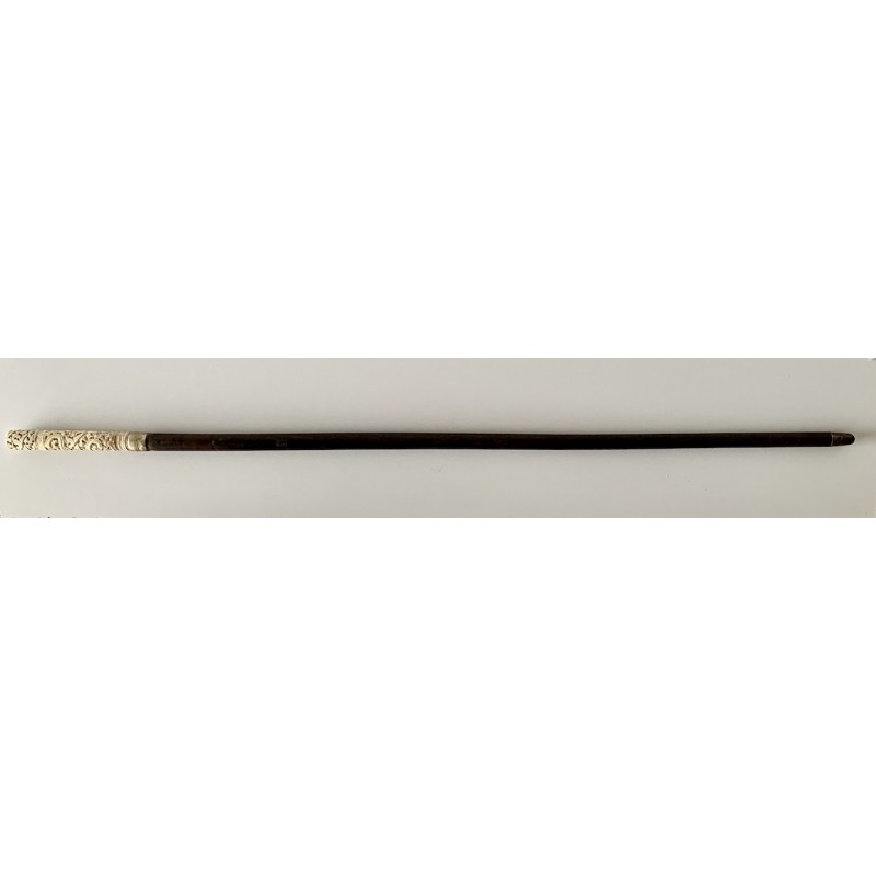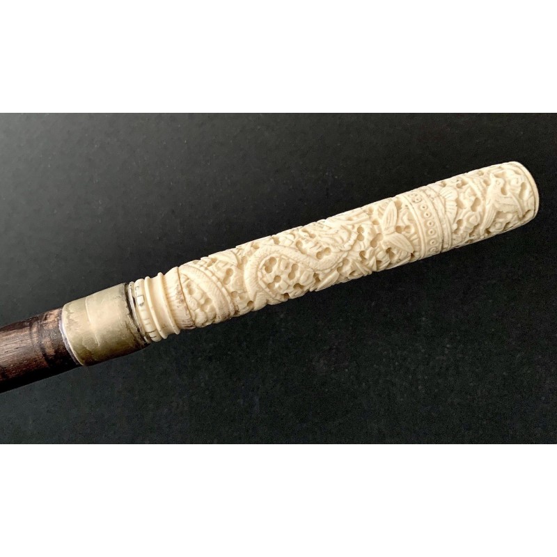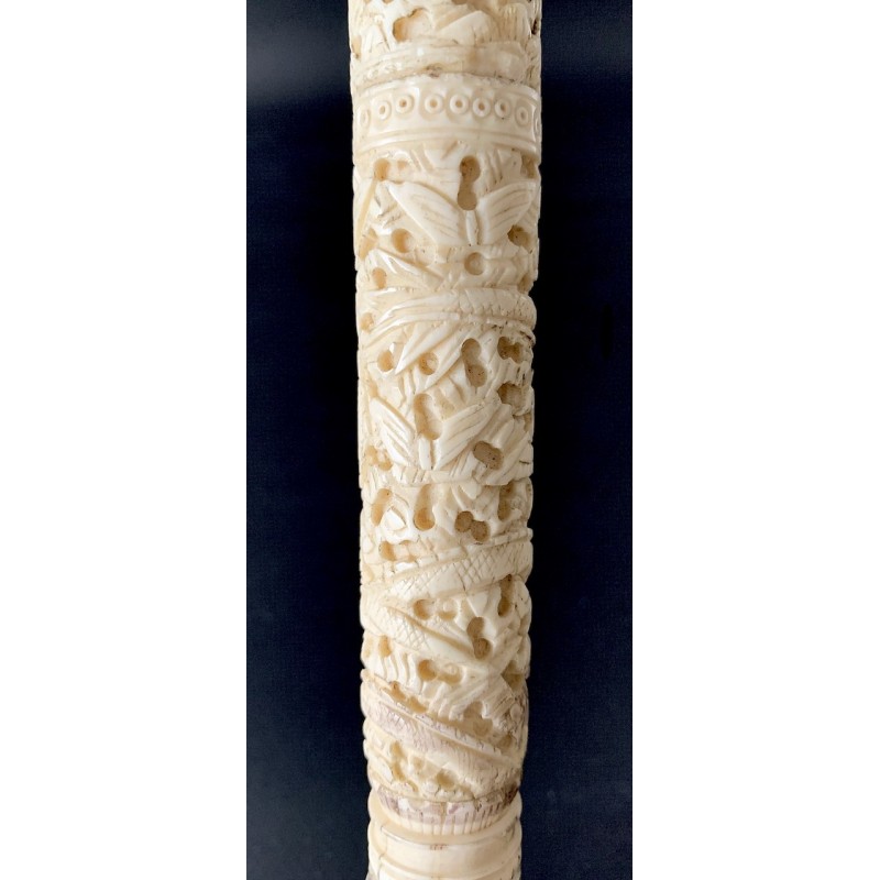 Bastón de paseo con empuñadura en hueso finemente tallado finales del siglo XIX, con decoraciones y escenas con dragón mariposas y aves. La empuñadura se desenrosca guardando en su interior utensilios de hueso para la costura, puntero de metal, buen estado de conservación.
