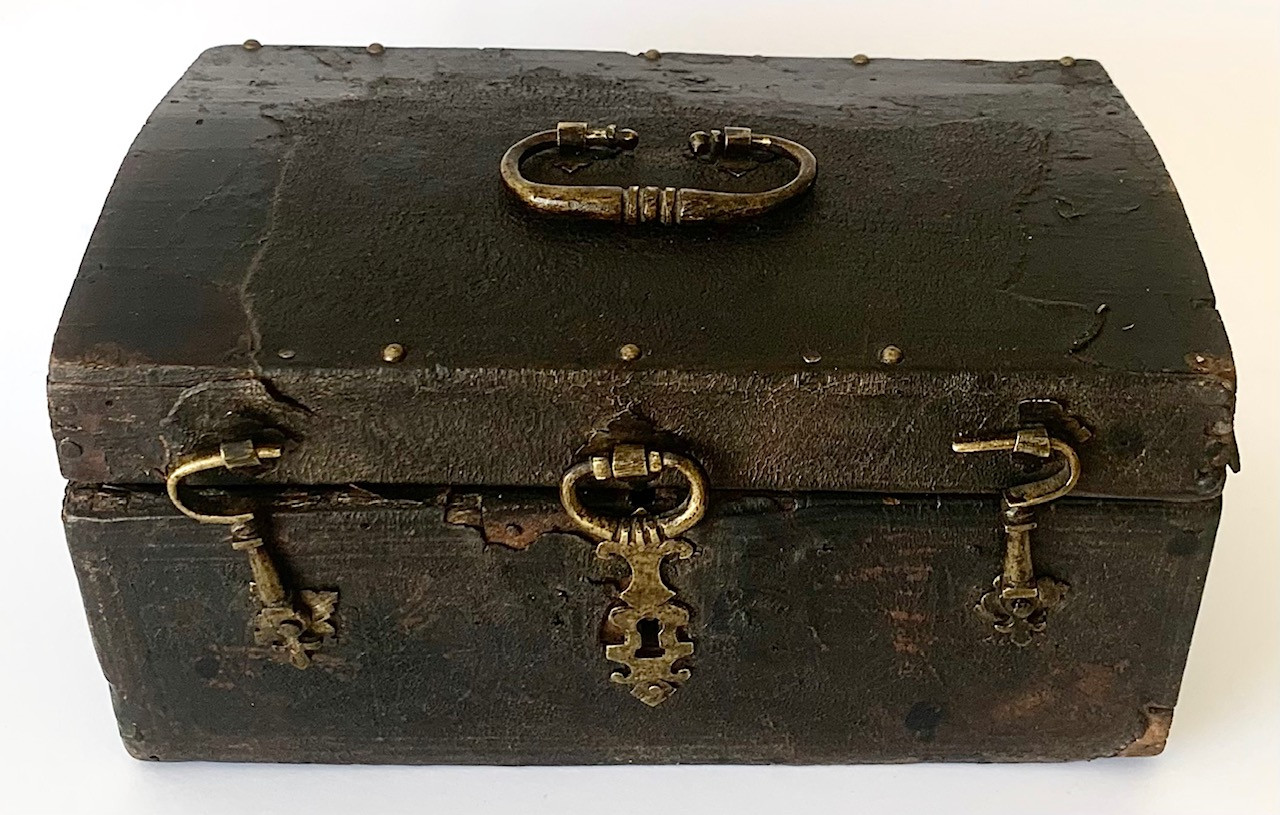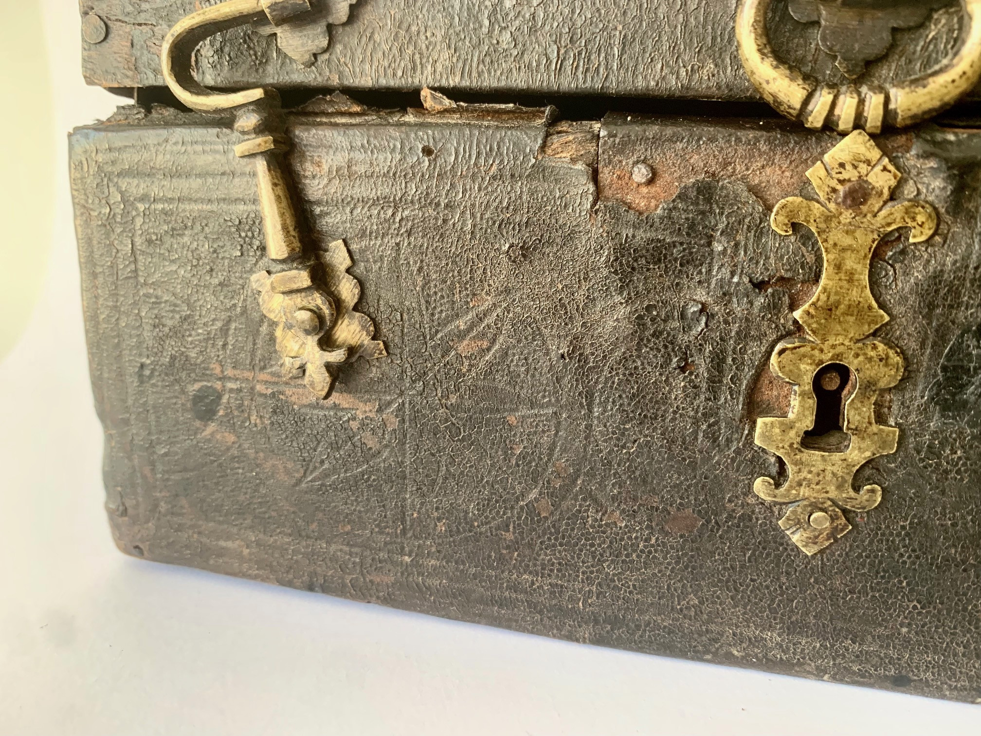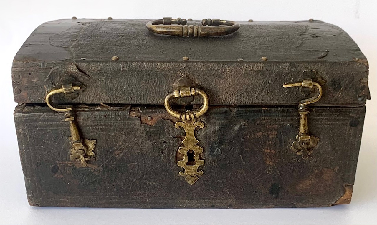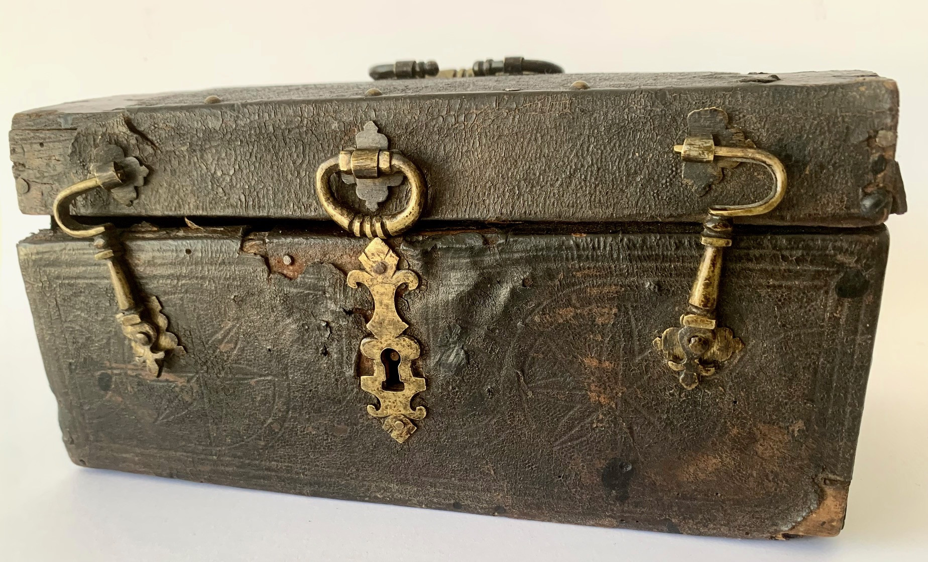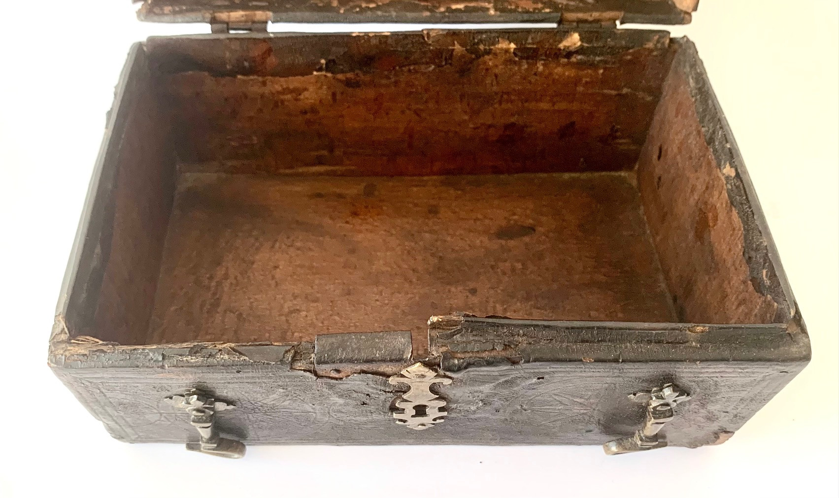 Arqueta, cofre de finales del siglo XVII, Francia época Luis XIV. Estructura de madera forrada en piel repujada con decoraciones geométricas. Herrajes originales de bronce. Estructura en buen estados, algunas faltas de la piel normales por el curso de los años.