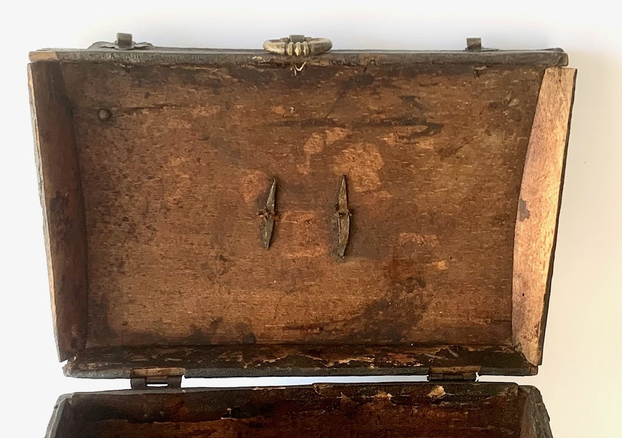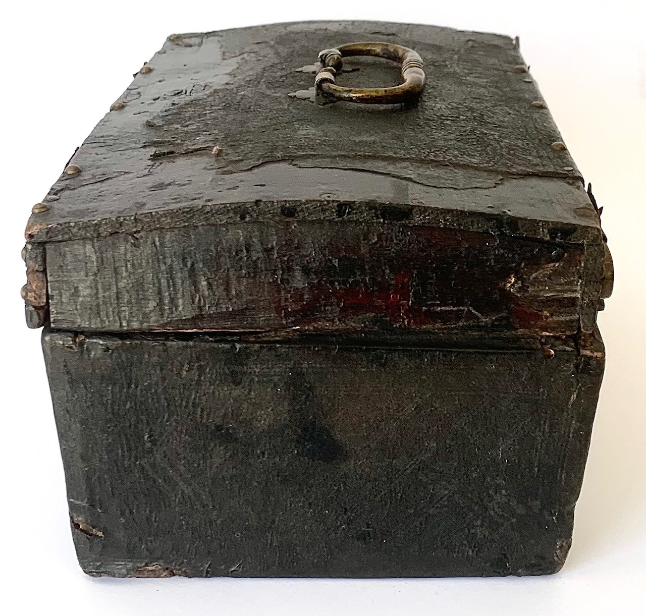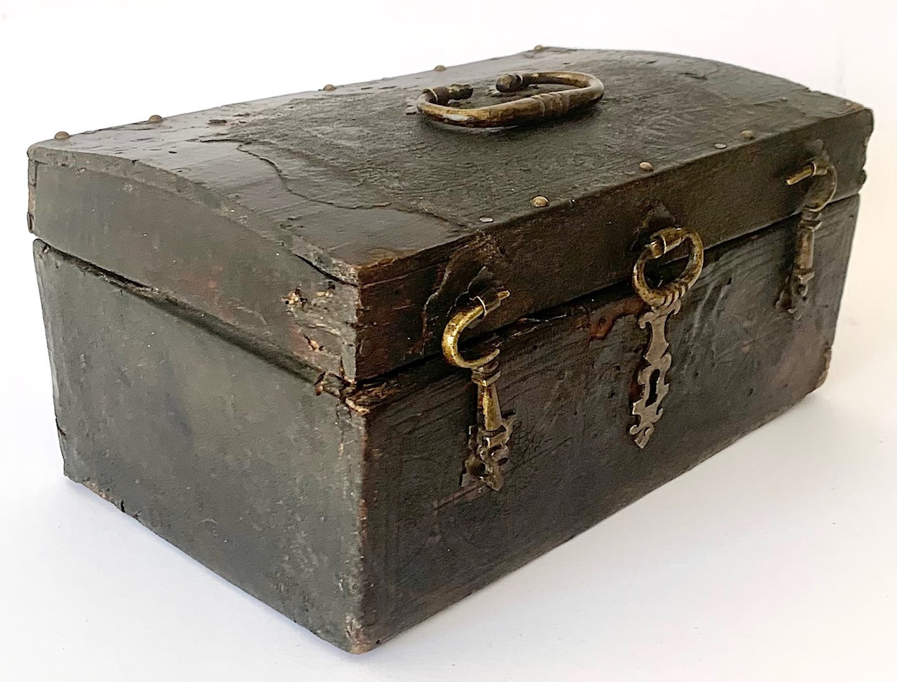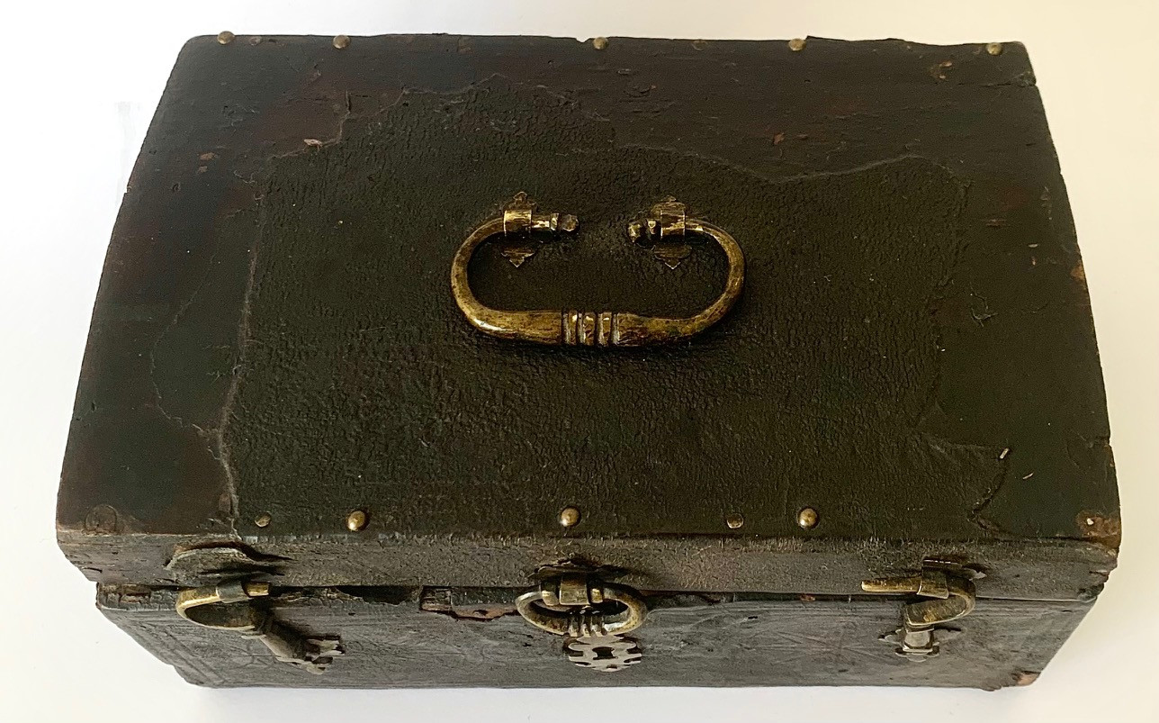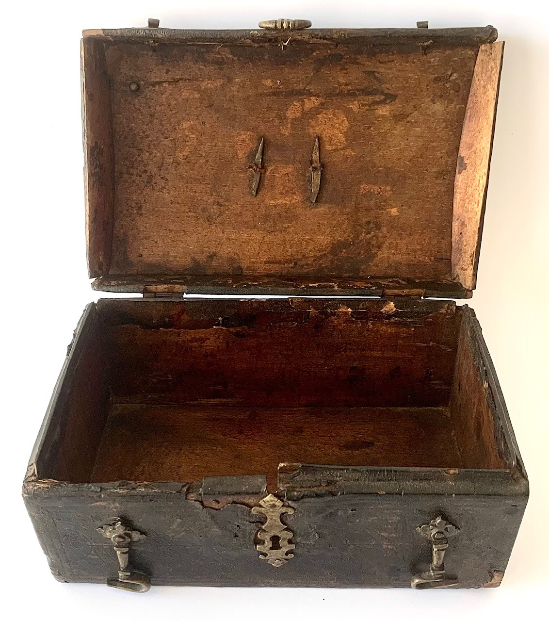 Arqueta, cofre de finales del siglo XVII, Francia época Luis XIV. Estructura de madera forrada en piel repujada con decoraciones geométricas. Herrajes originales de bronce. Estructura en buen estados, algunas faltas de la piel normales por el curso de los años.