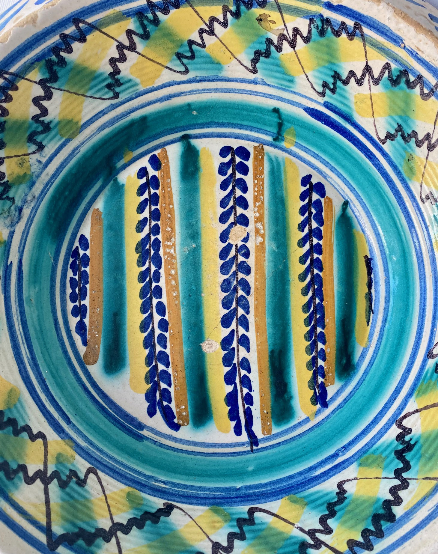 Esmaltado con decoraciones geométricas azul, amarillo y verde.