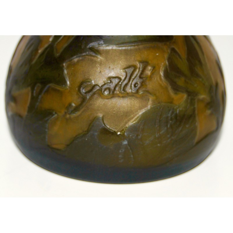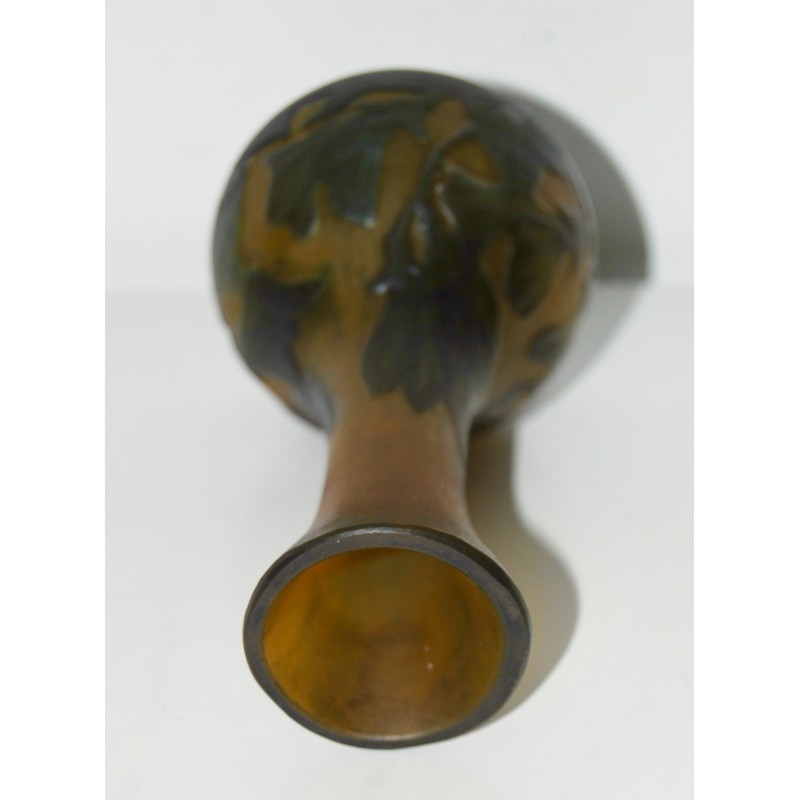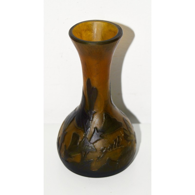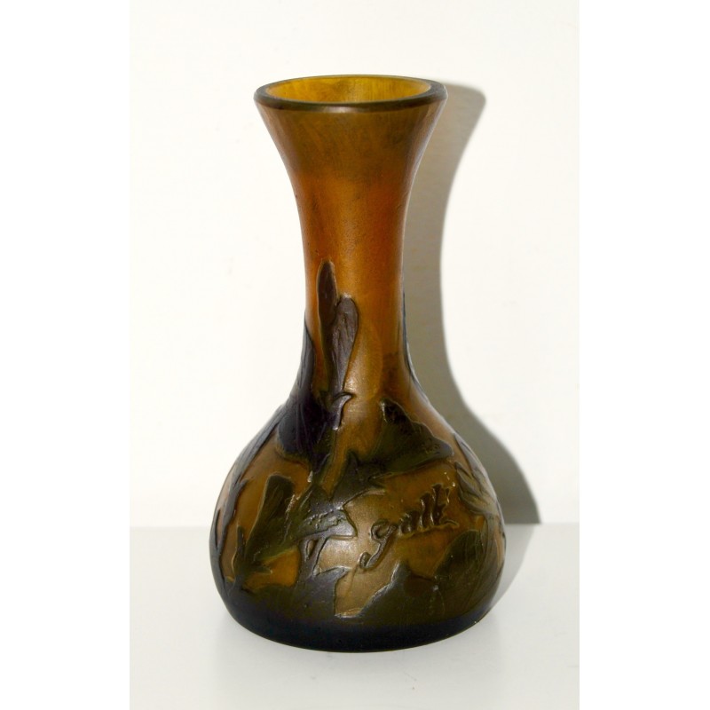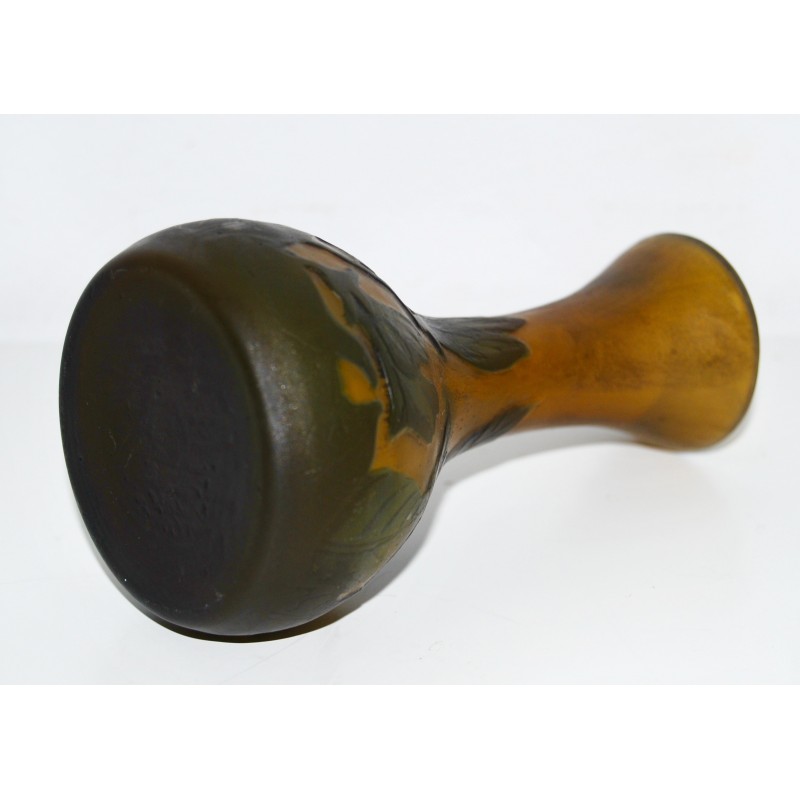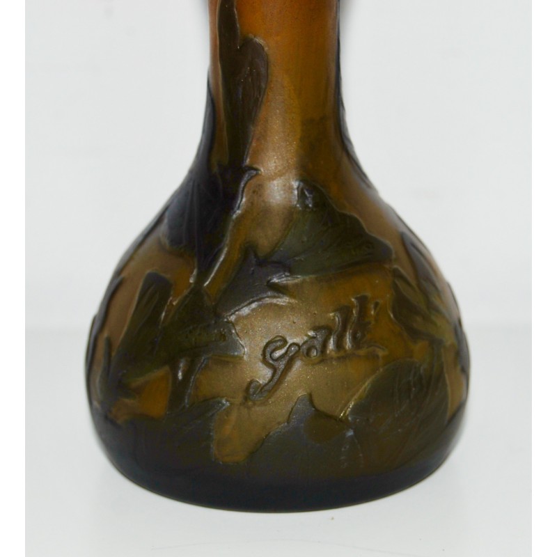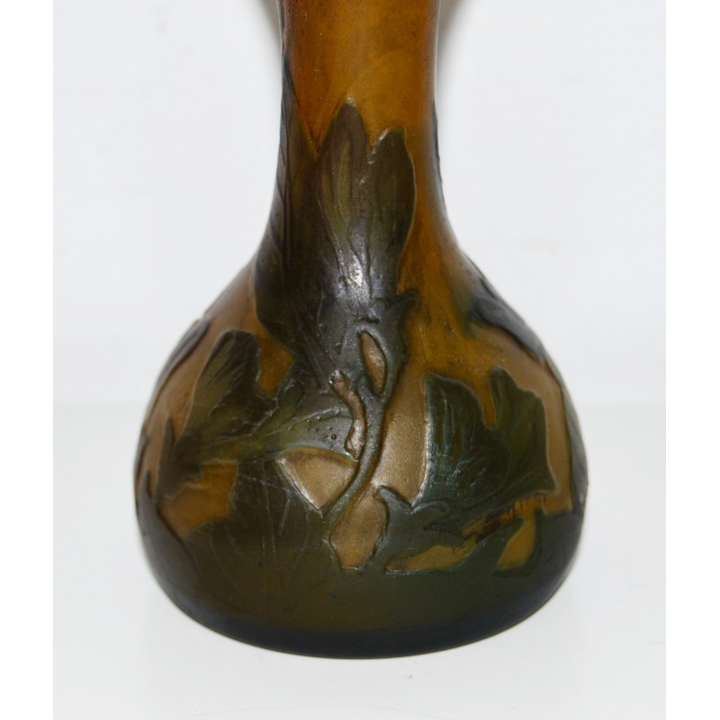 Jarrón Emile Gallé soliflor, ultima decada del siglo XIX, de tonalidad marrón sobre fondo ocre naranjado grabado al acido, firmado en la zona inferior, buen estado de conservación.