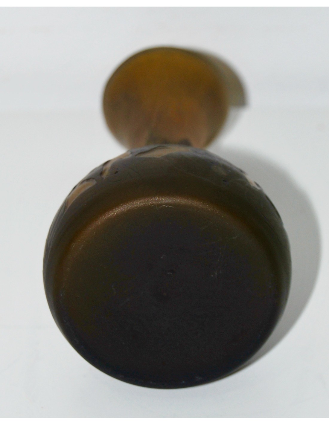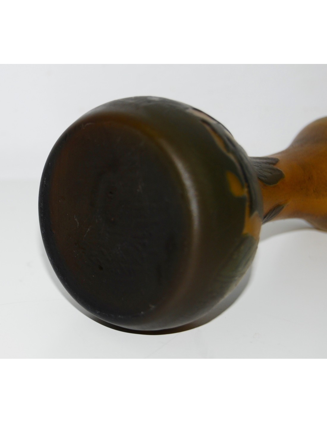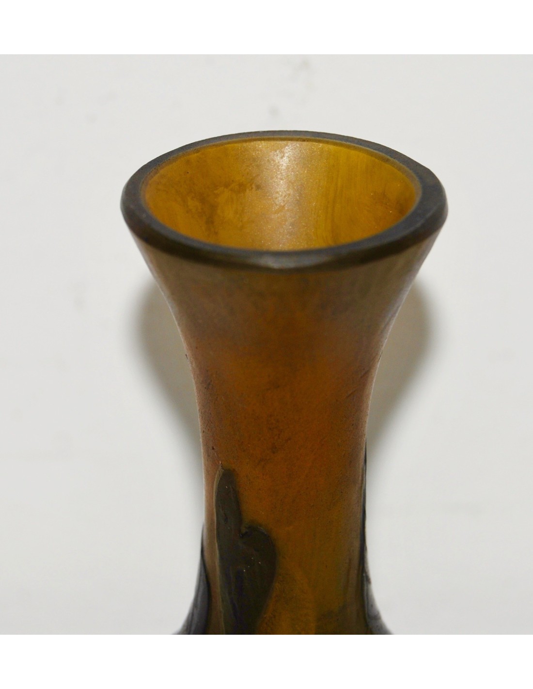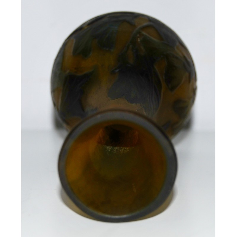Jarrón Emile Gallé soliflor, ultima decada del siglo XIX, de tonalidad marrón sobre fondo ocre naranjado grabado al acido, firmado en la zona inferior, buen estado de conservación.