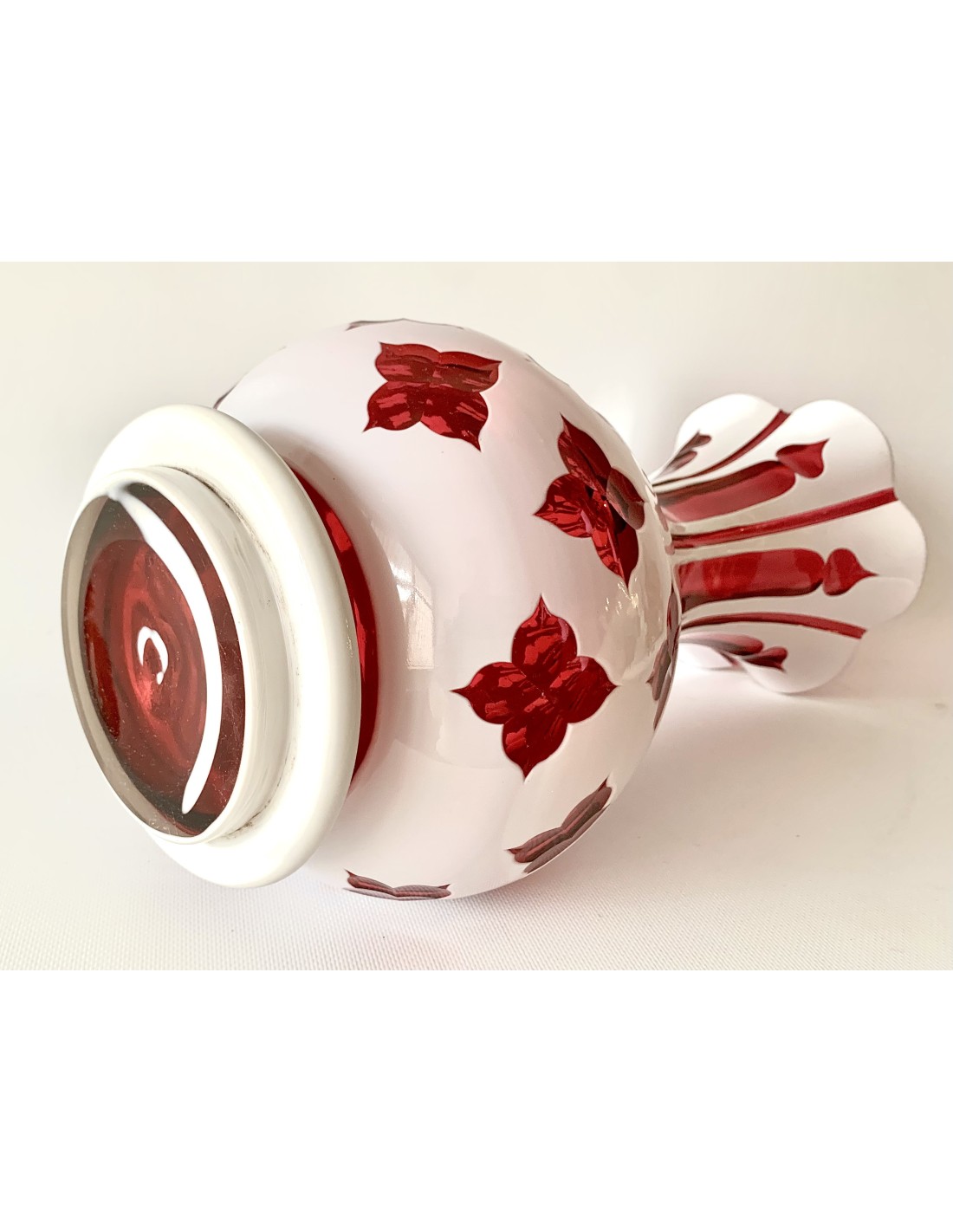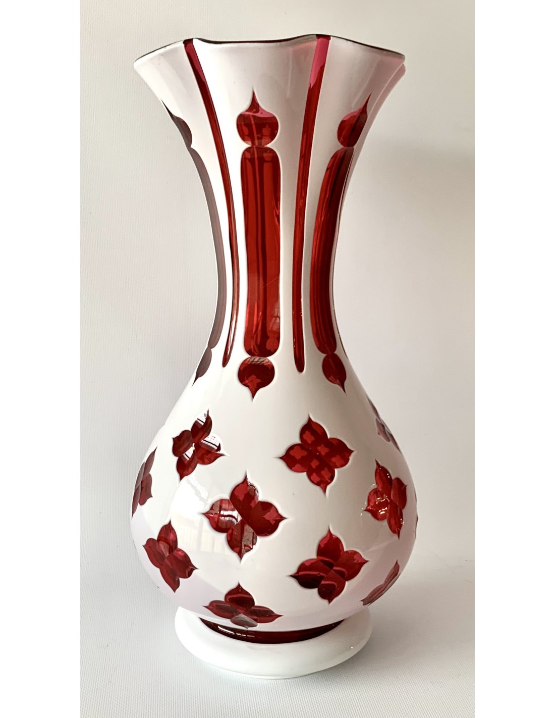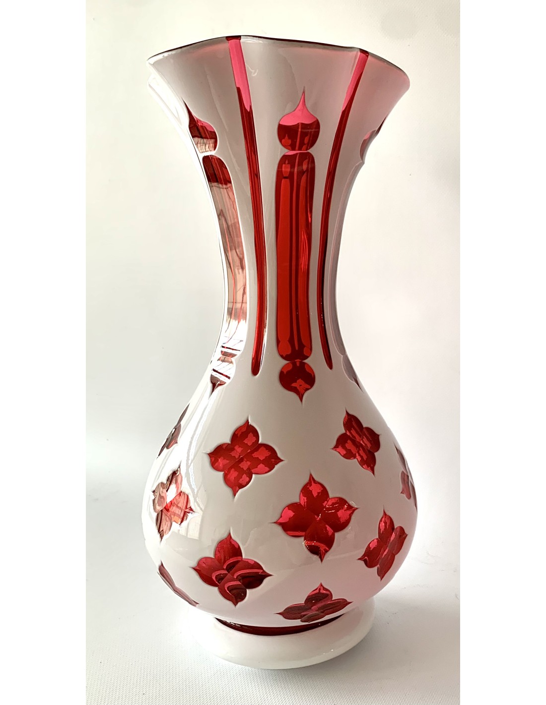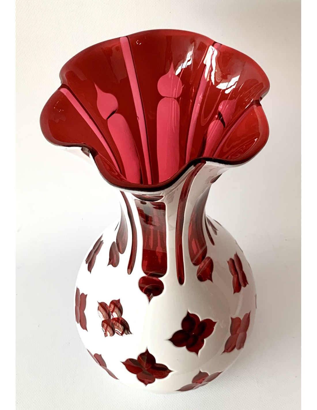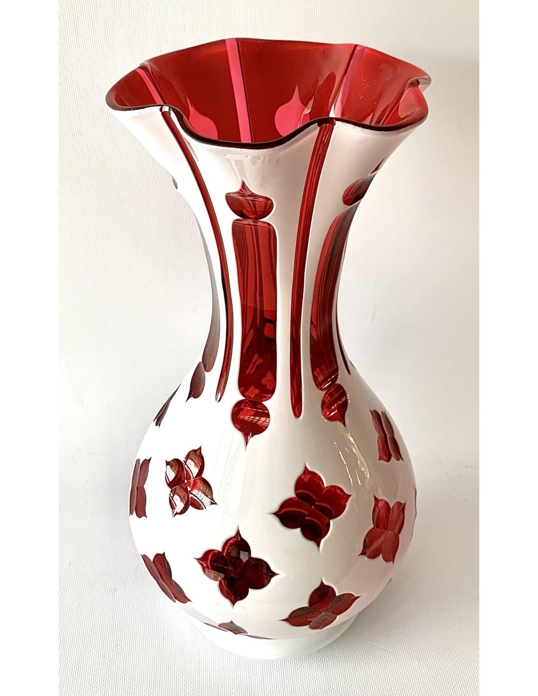 Jarrón de cristal Bohemia (Actual Repubblica Checa) de finales del siglo XIX. Dos capas superpuestas, la primera rojo rubí y la segunda exterior blanca. Esta última fue tallada y pulida con mucha precisión a motivos geométricos dando un efecto de transparencias. Perfecto estado de conservación.