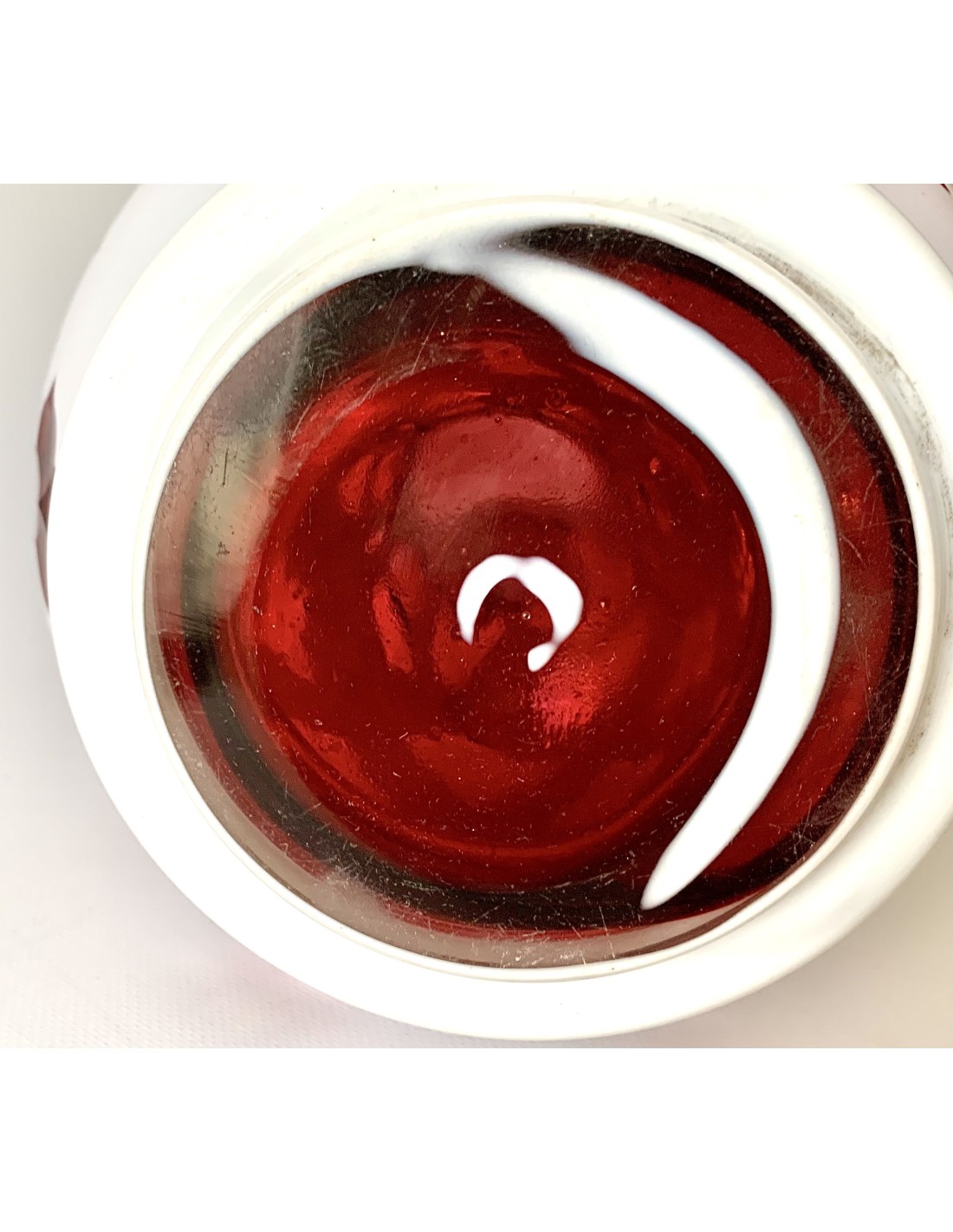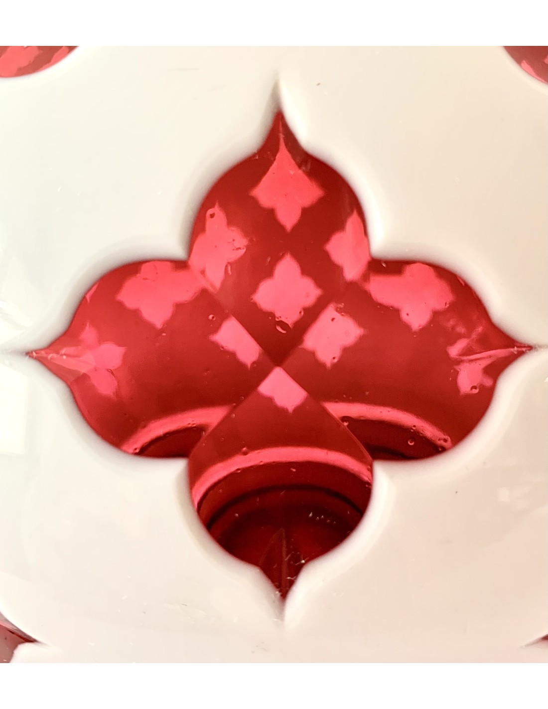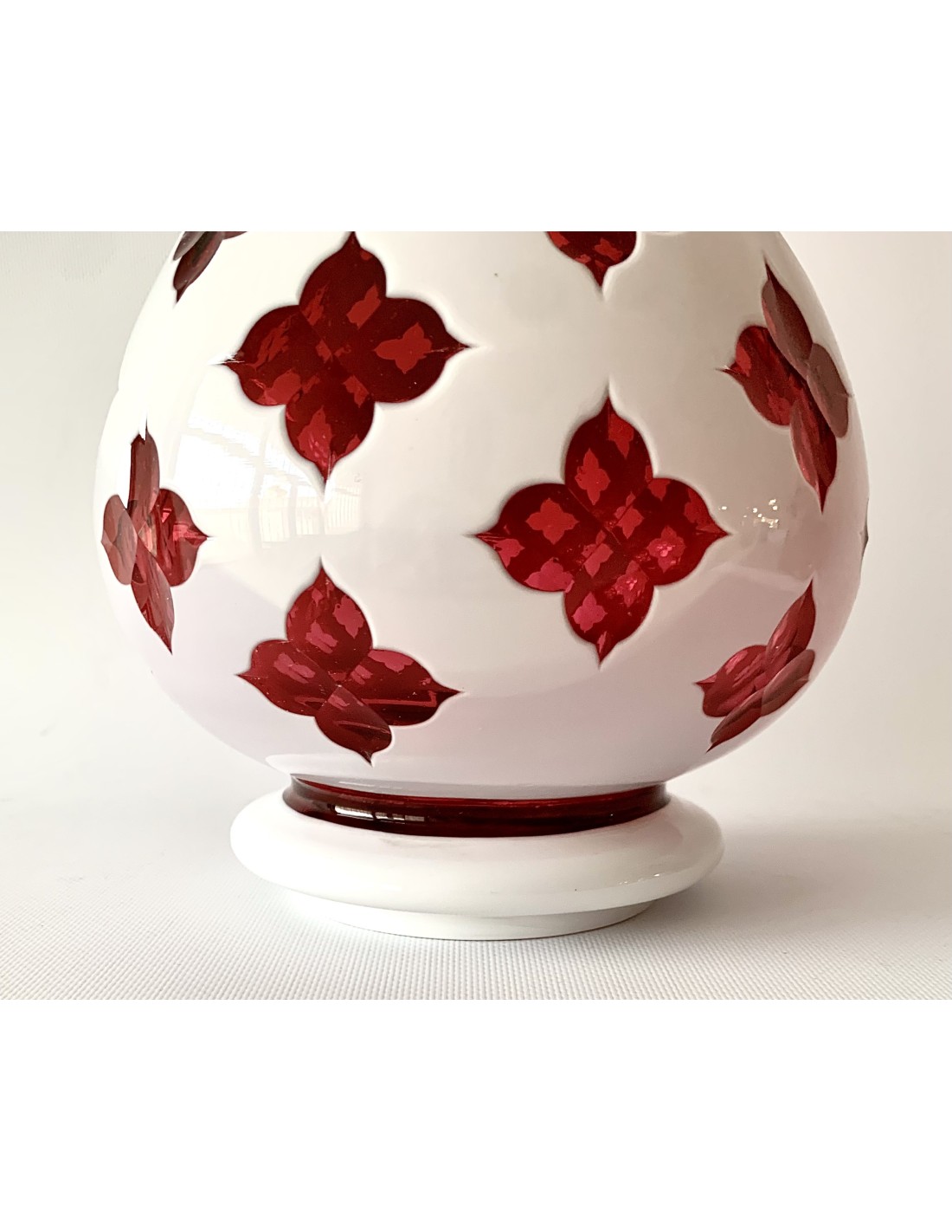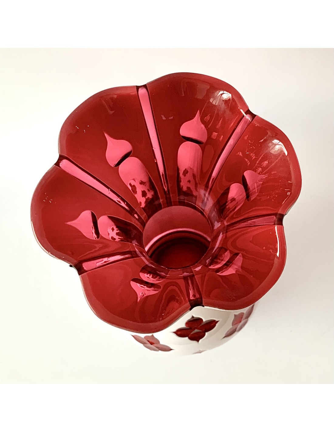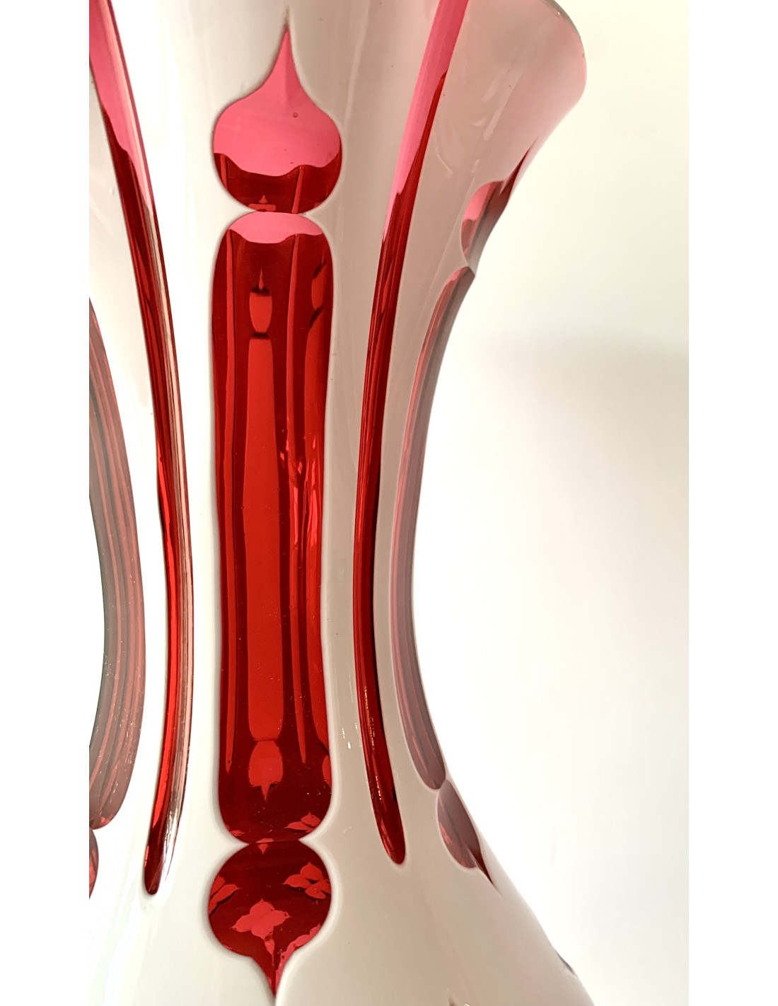 Jarrón de cristal Bohemia (Actual Repubblica Checa) de finales del siglo XIX. Dos capas superpuestas, la primera rojo rubí y la segunda exterior blanca. Esta última fue tallada y pulida con mucha precisión a motivos geométricos dando un efecto de transparencias. Perfecto estado de conservación.