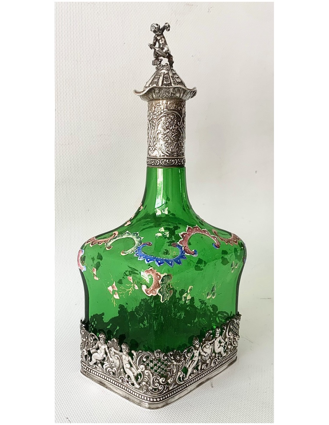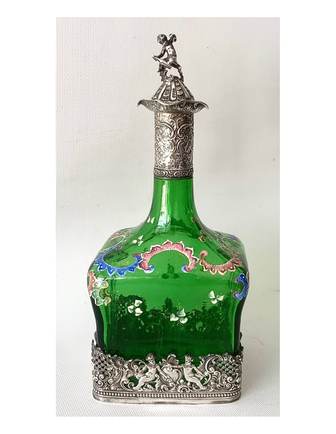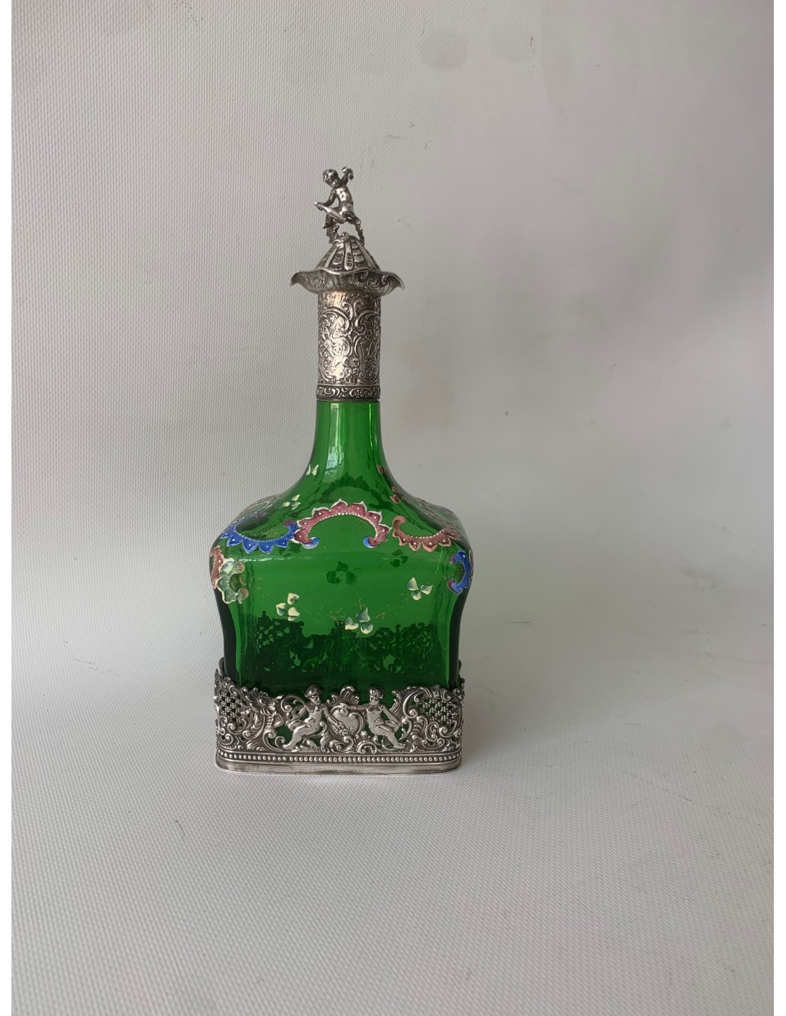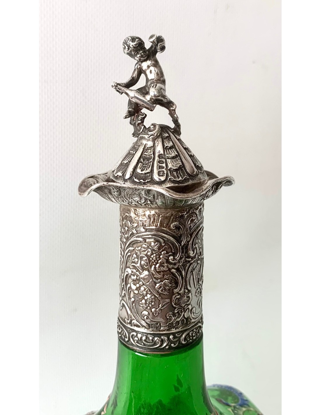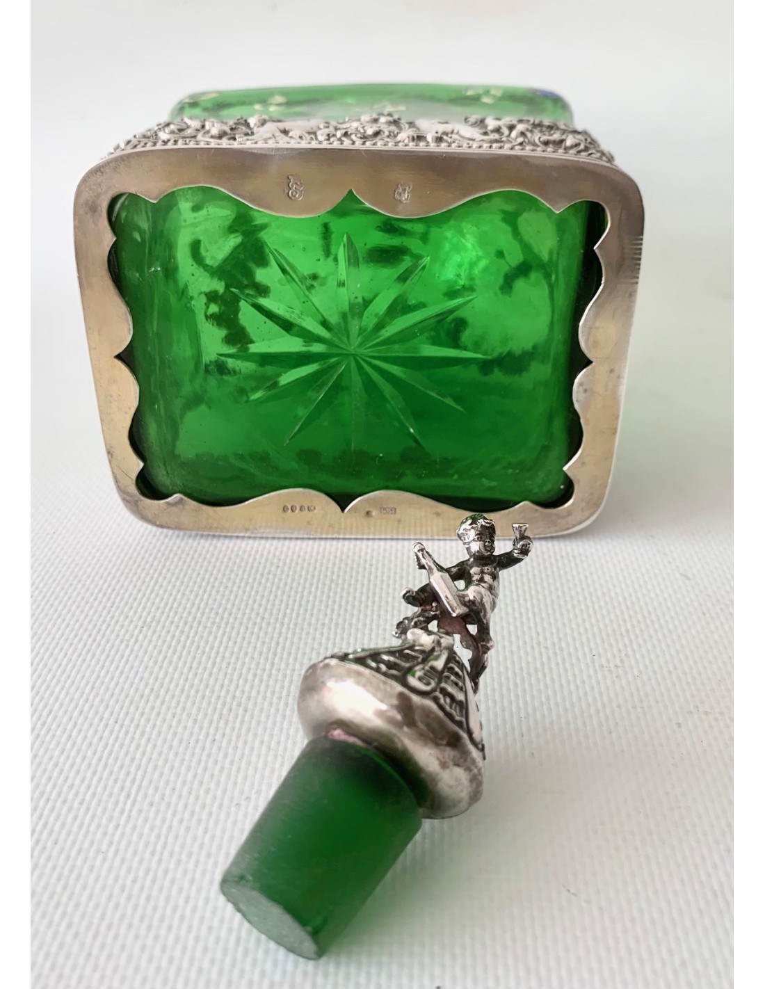 Botella licorera de vidrio tallado de color verde con decoraciones pintadas a mano. La base , el cuello y el tapón en plata de ley cincelada. En la parte superior del tapón querubín con botella y vaso en las manos. Marcas contrastadas de plata de Londres de 1895. Buen estado de conservación.