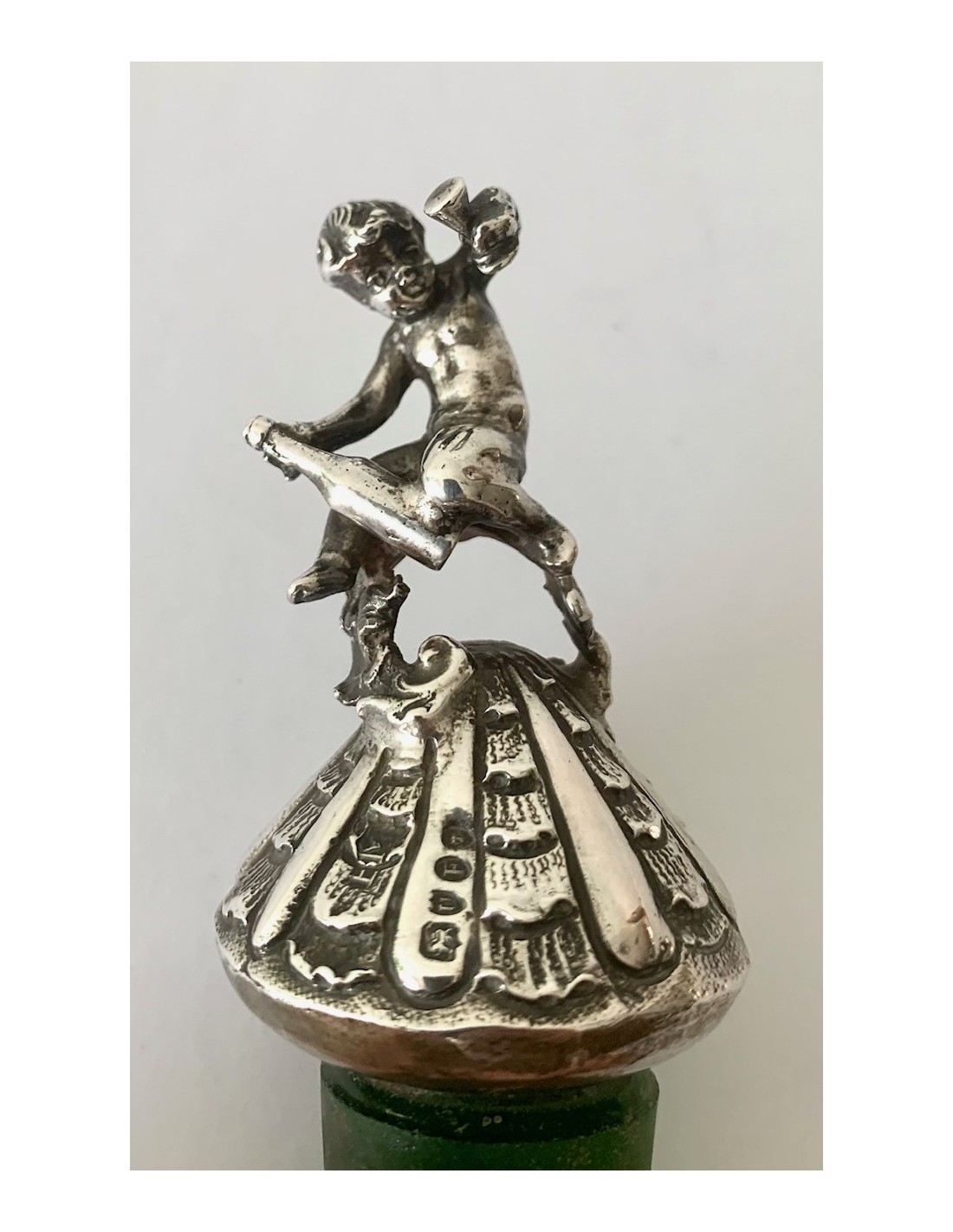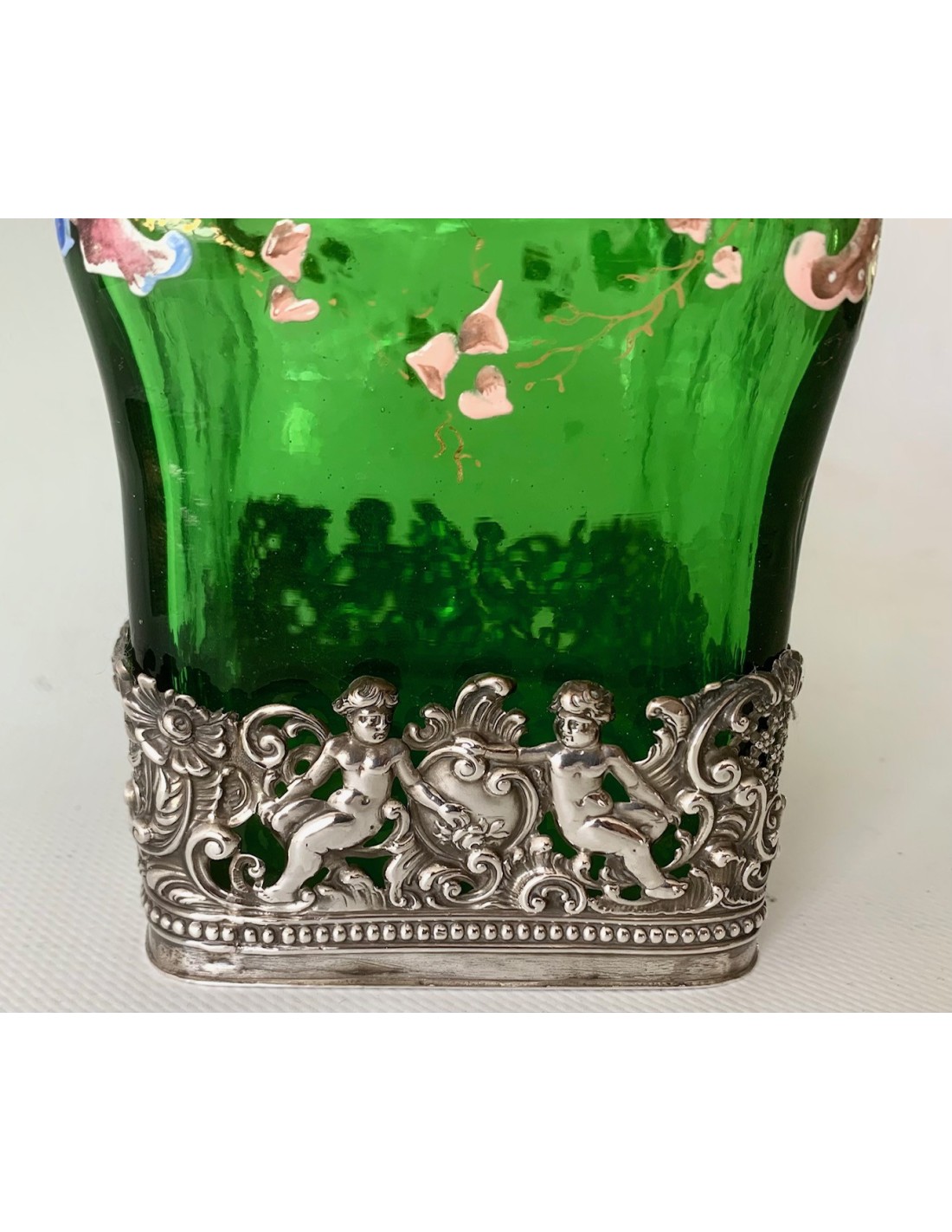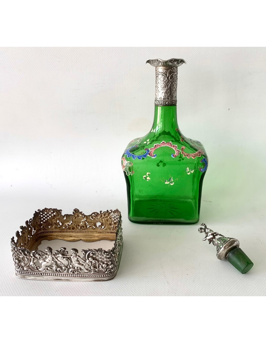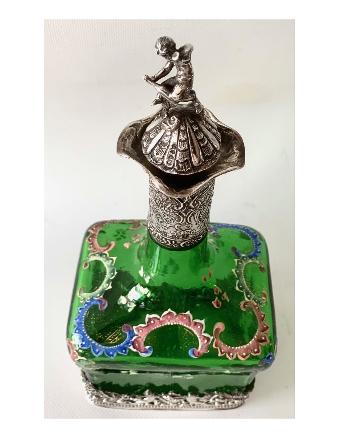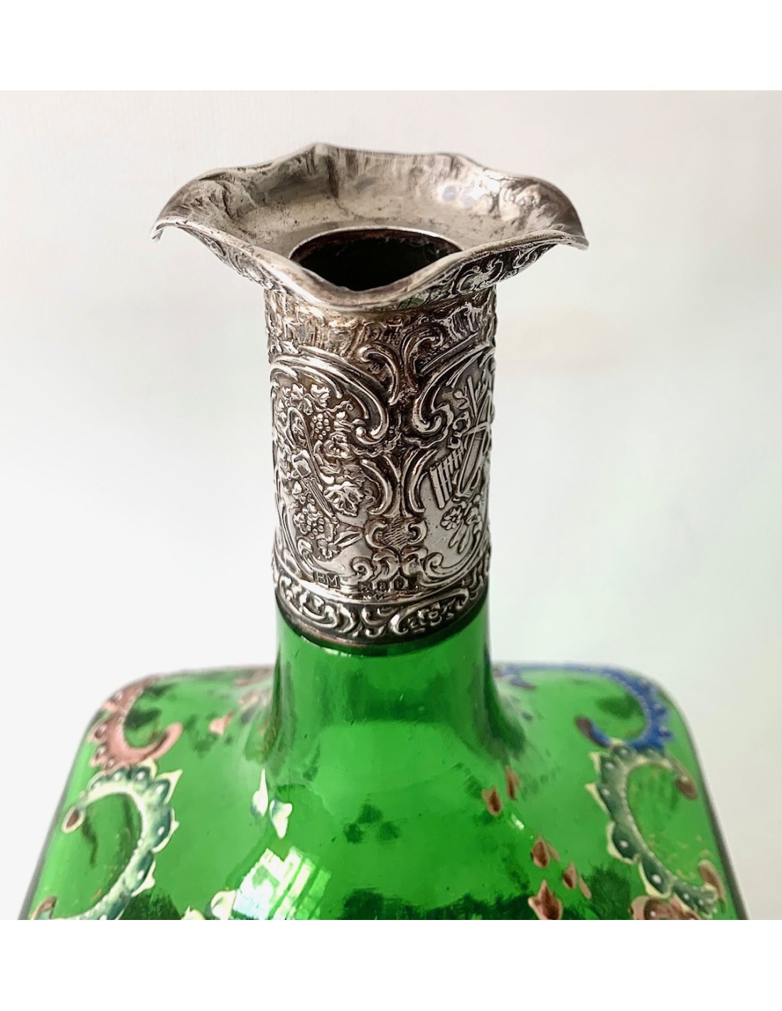 Botella licorera de vidrio tallado de color verde con decoraciones pintadas a mano. La base , el cuello y el tapón en plata de ley cincelada. En la parte superior del tapón querubín con botella y vaso en las manos. Marcas contrastadas de plata de Londres de 1895. Buen estado de conservación.