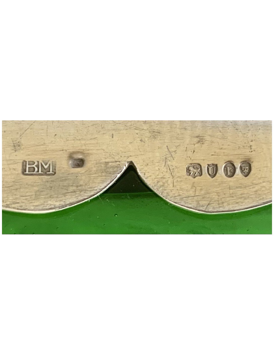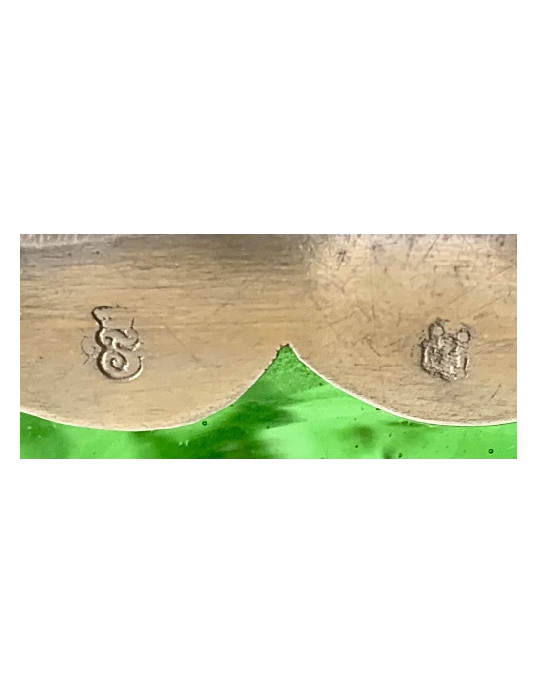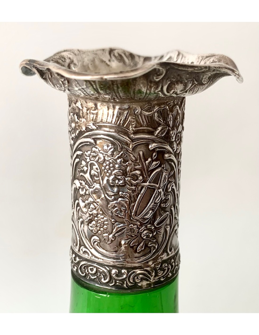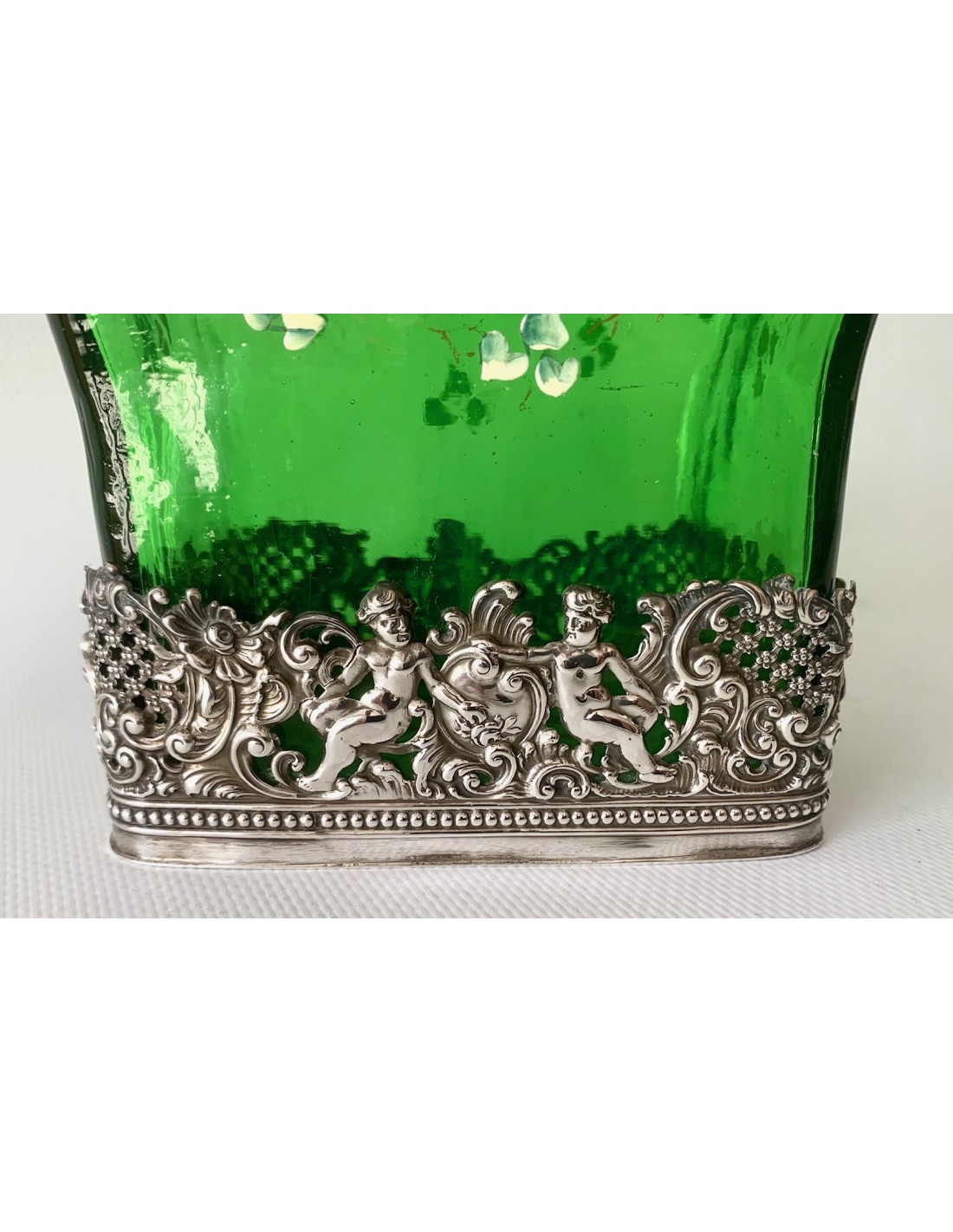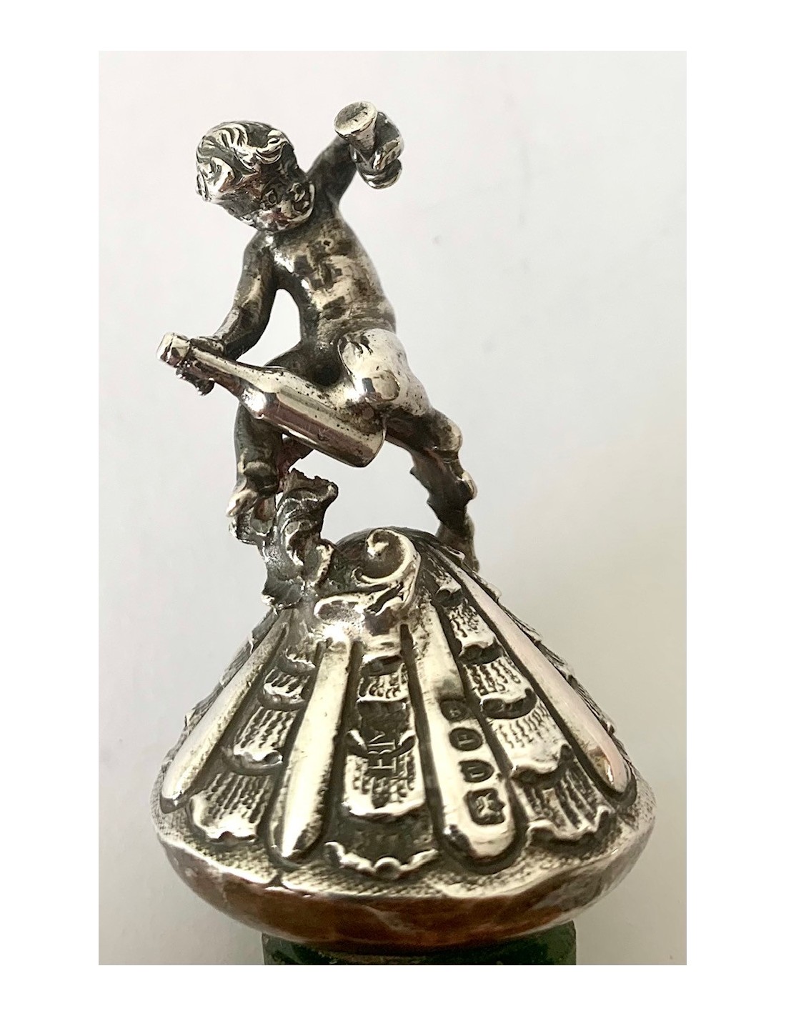 Botella licorera de vidrio tallado de color verde con decoraciones pintadas a mano. La base , el cuello y el tapón en plata de ley cincelada. En la parte superior del tapón querubín con botella y vaso en las manos. Marcas contrastadas de plata de Londres de 1895. Buen estado de conservación.
