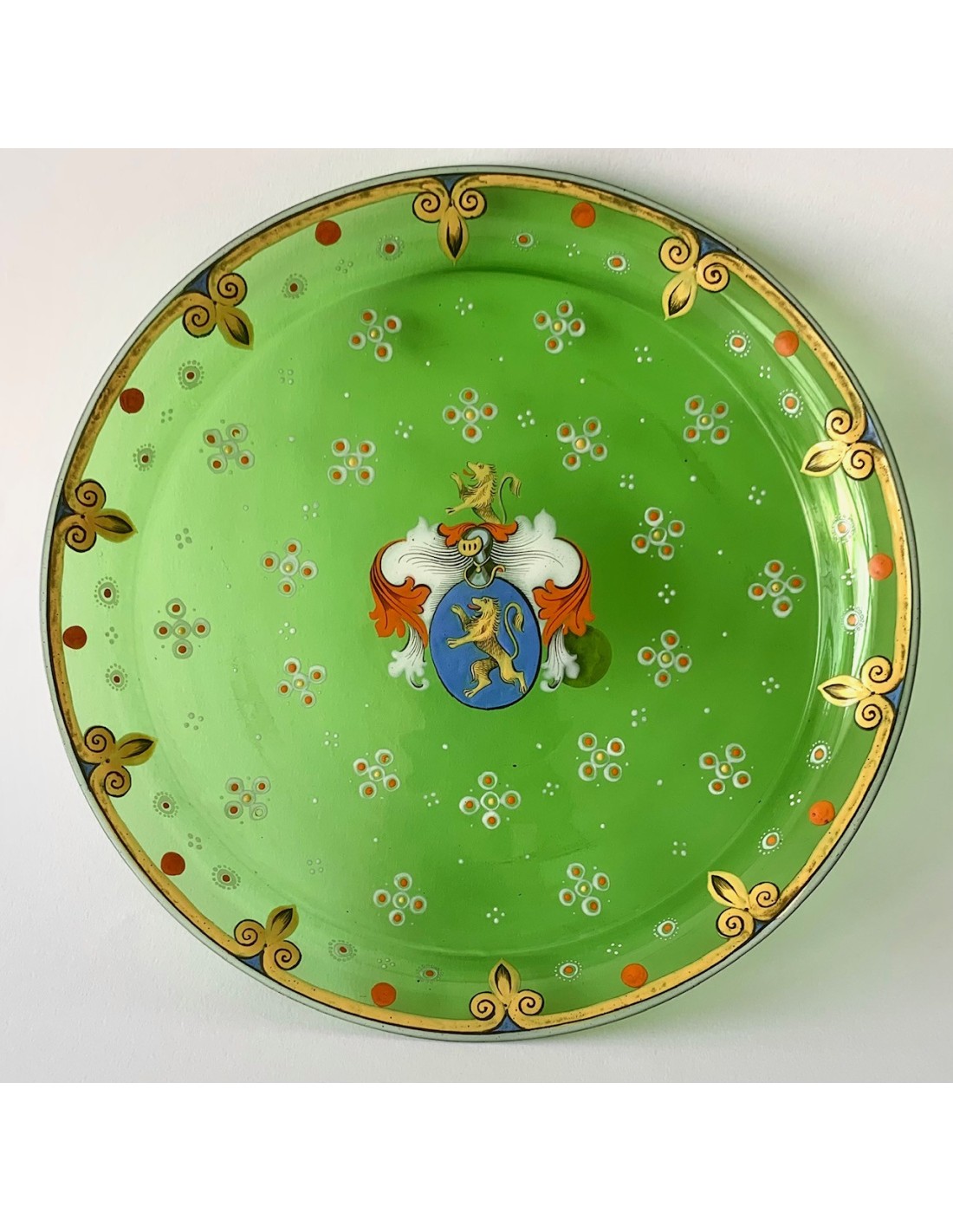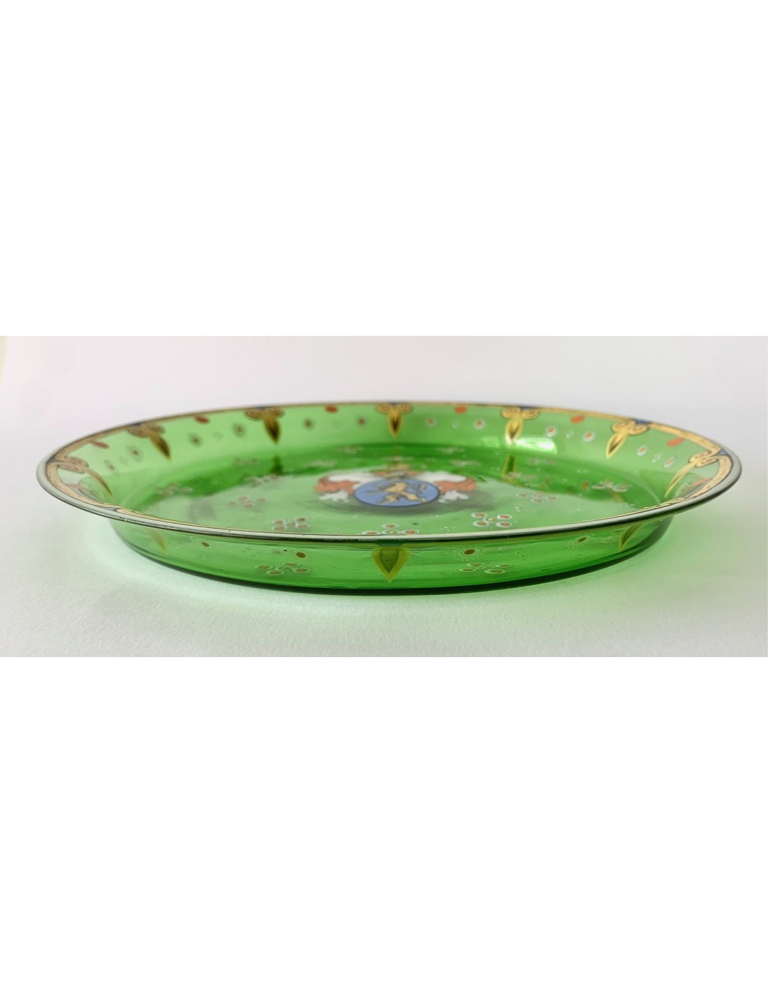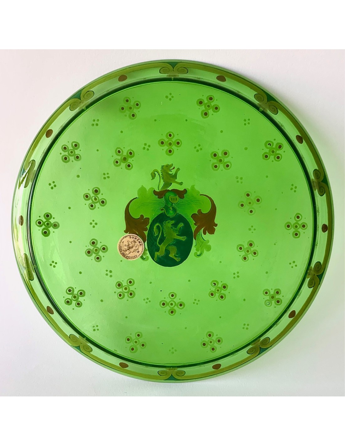 Plato bandeja redonda de cristal Bohemio, finales del siglo XIX. Cristal verde esmaltado con decoraciones en su perimetro y escudo heráldico en el centro, etiqueta de papel original de época en le lado trasero.