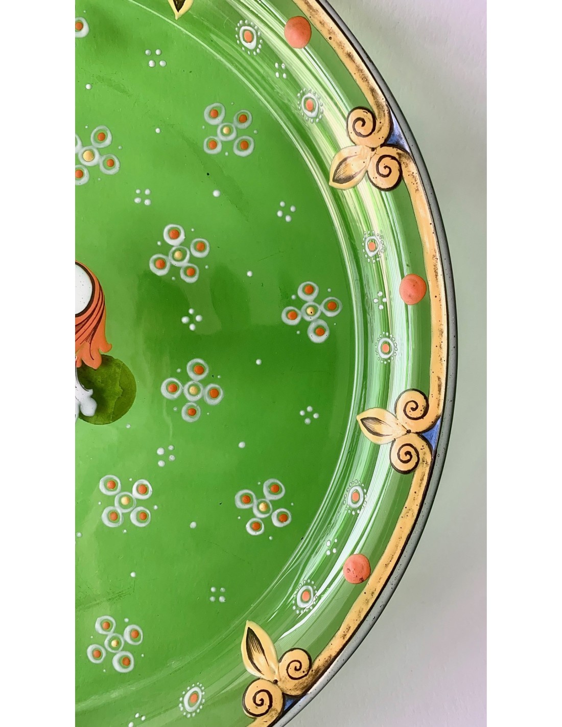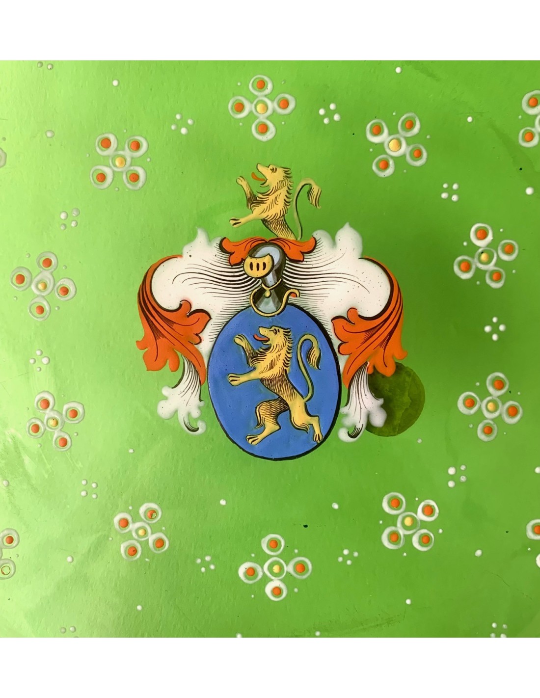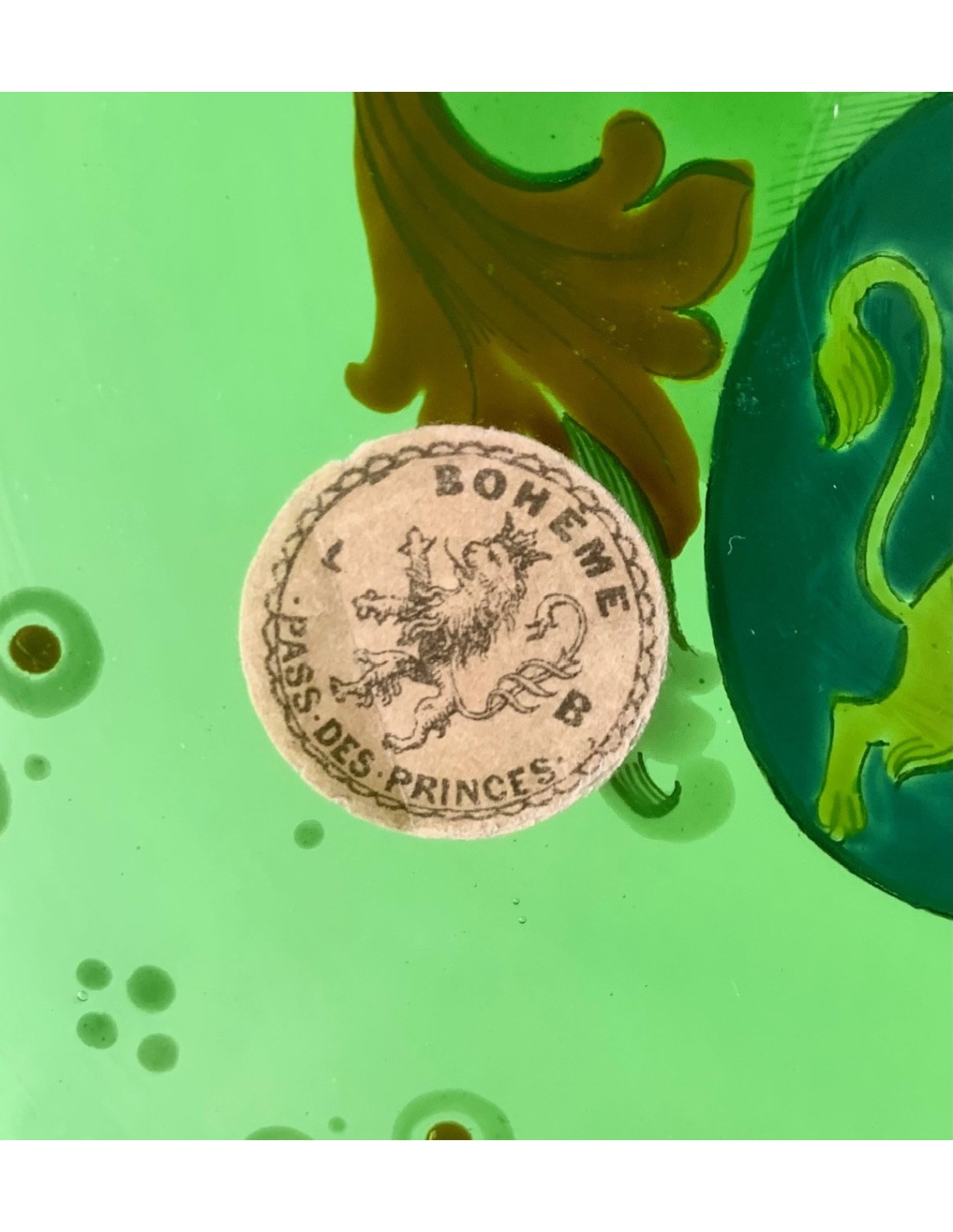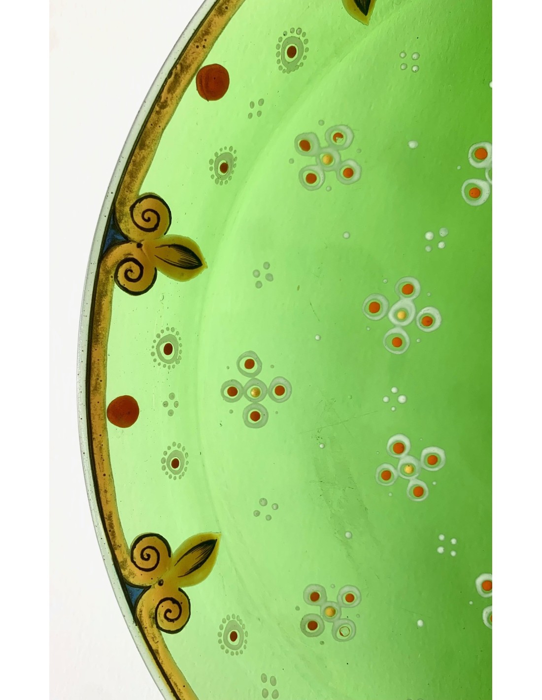 Plato bandeja redonda de cristal Bohemio, finales del siglo XIX. Cristal verde esmaltado con decoraciones en su perimetro y escudo heráldico en el centro, etiqueta de papel original de época en le lado trasero.