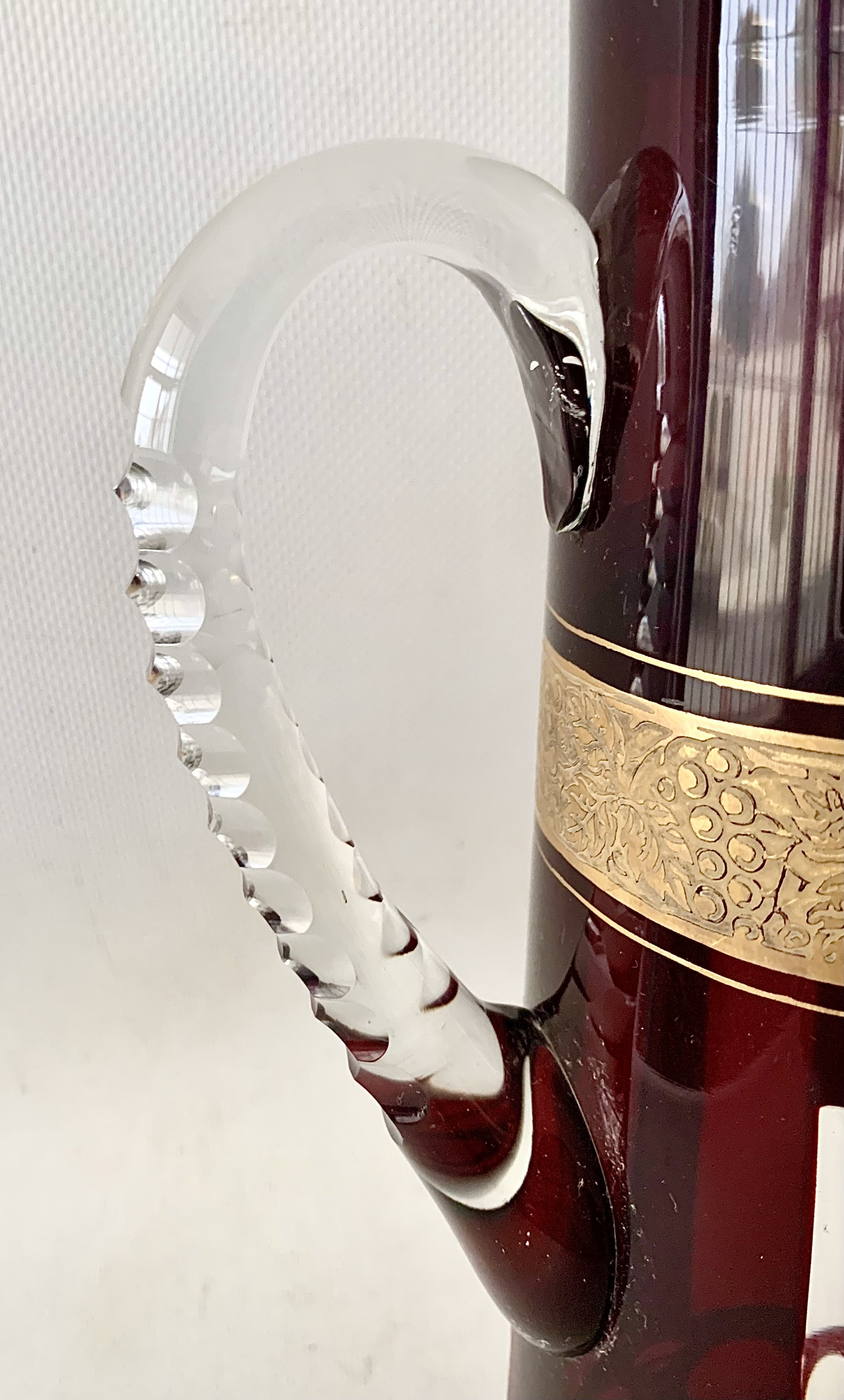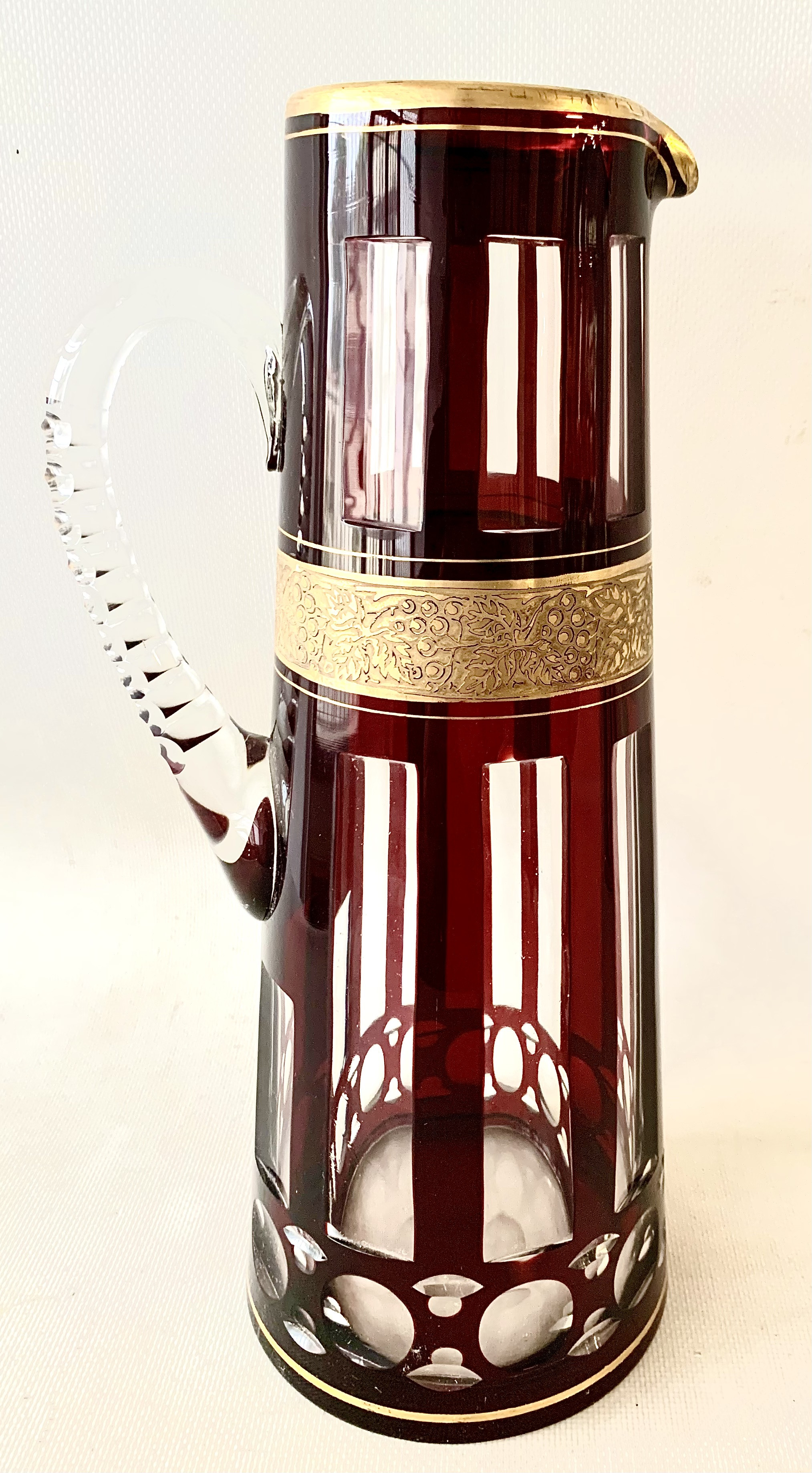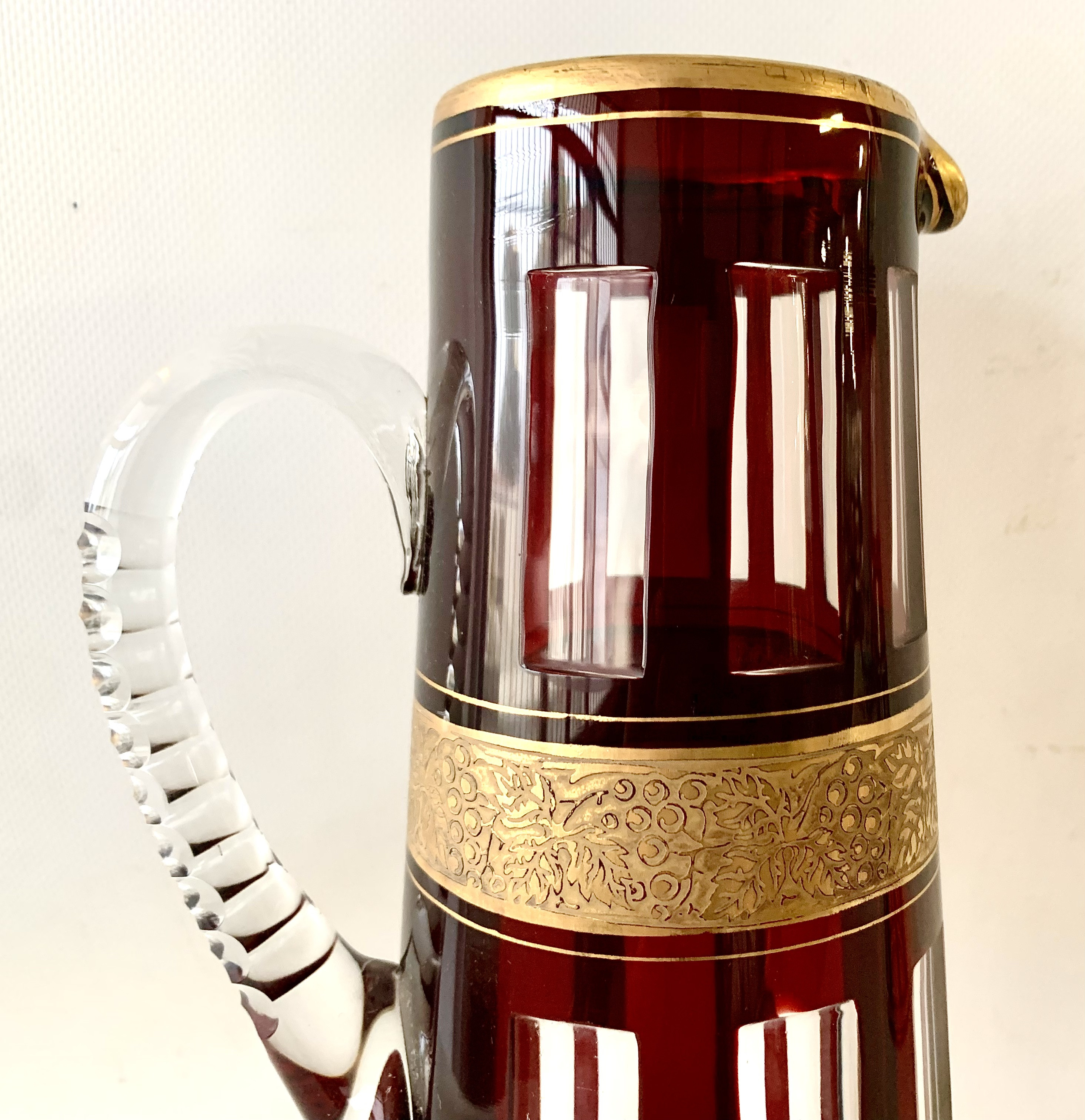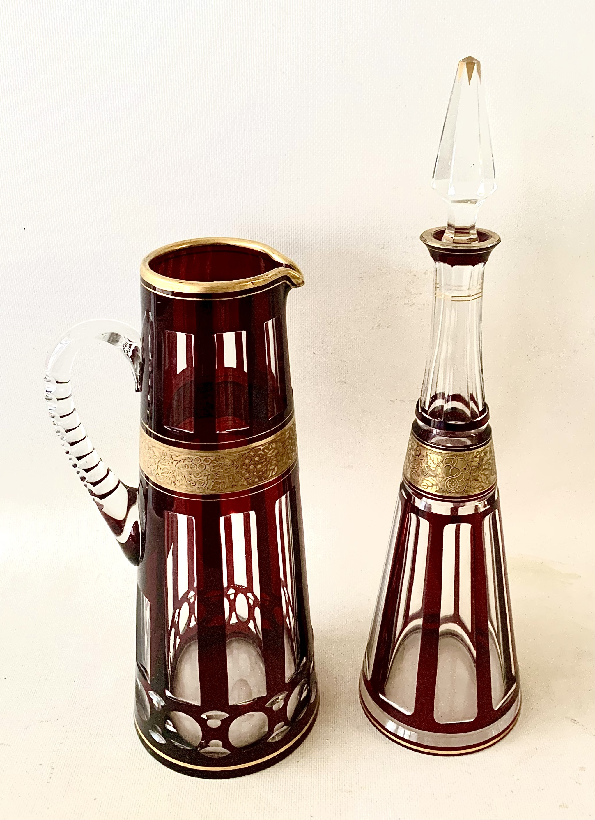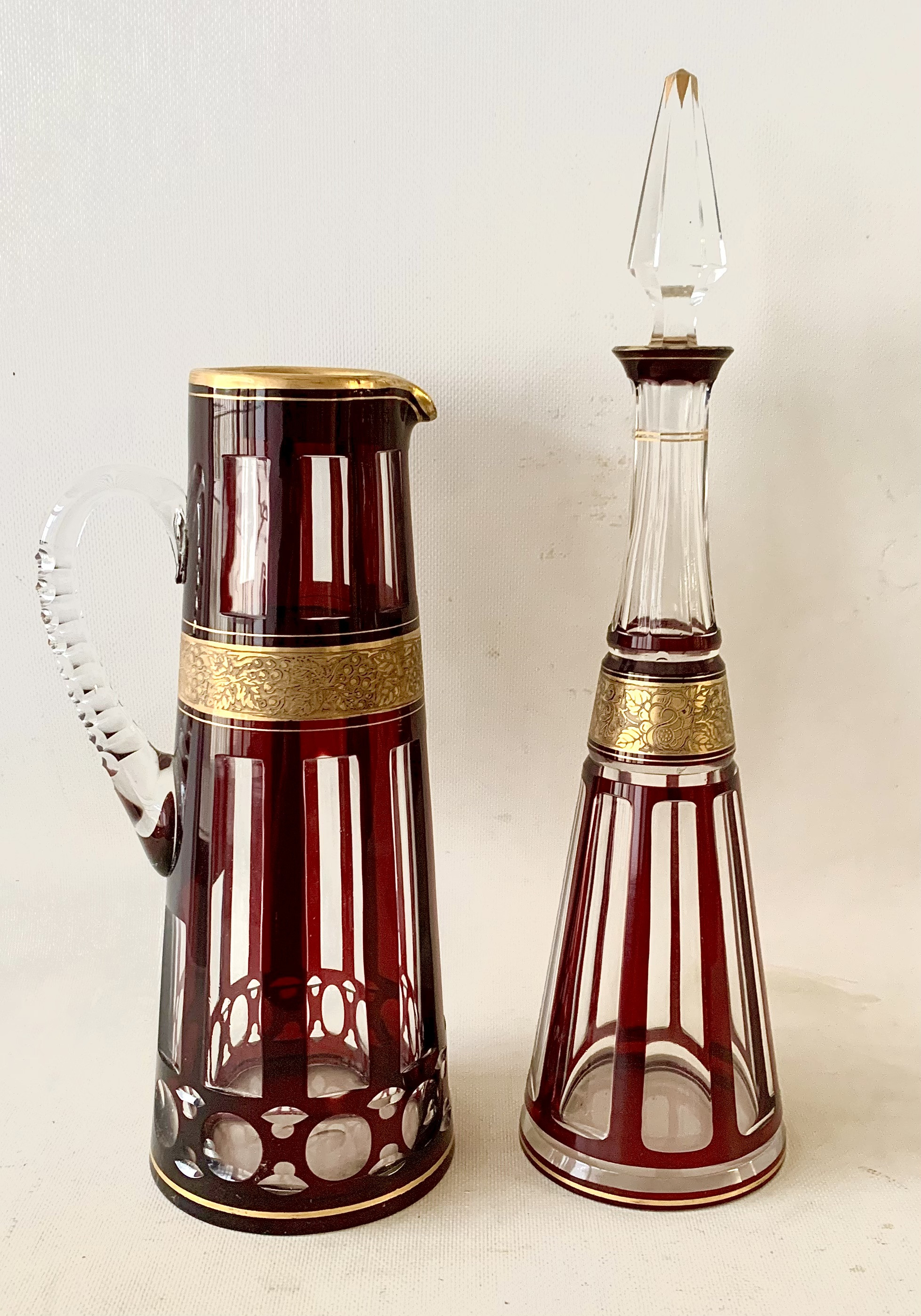 Pareja de botella licorera y jarra de cristal tallado, decó.