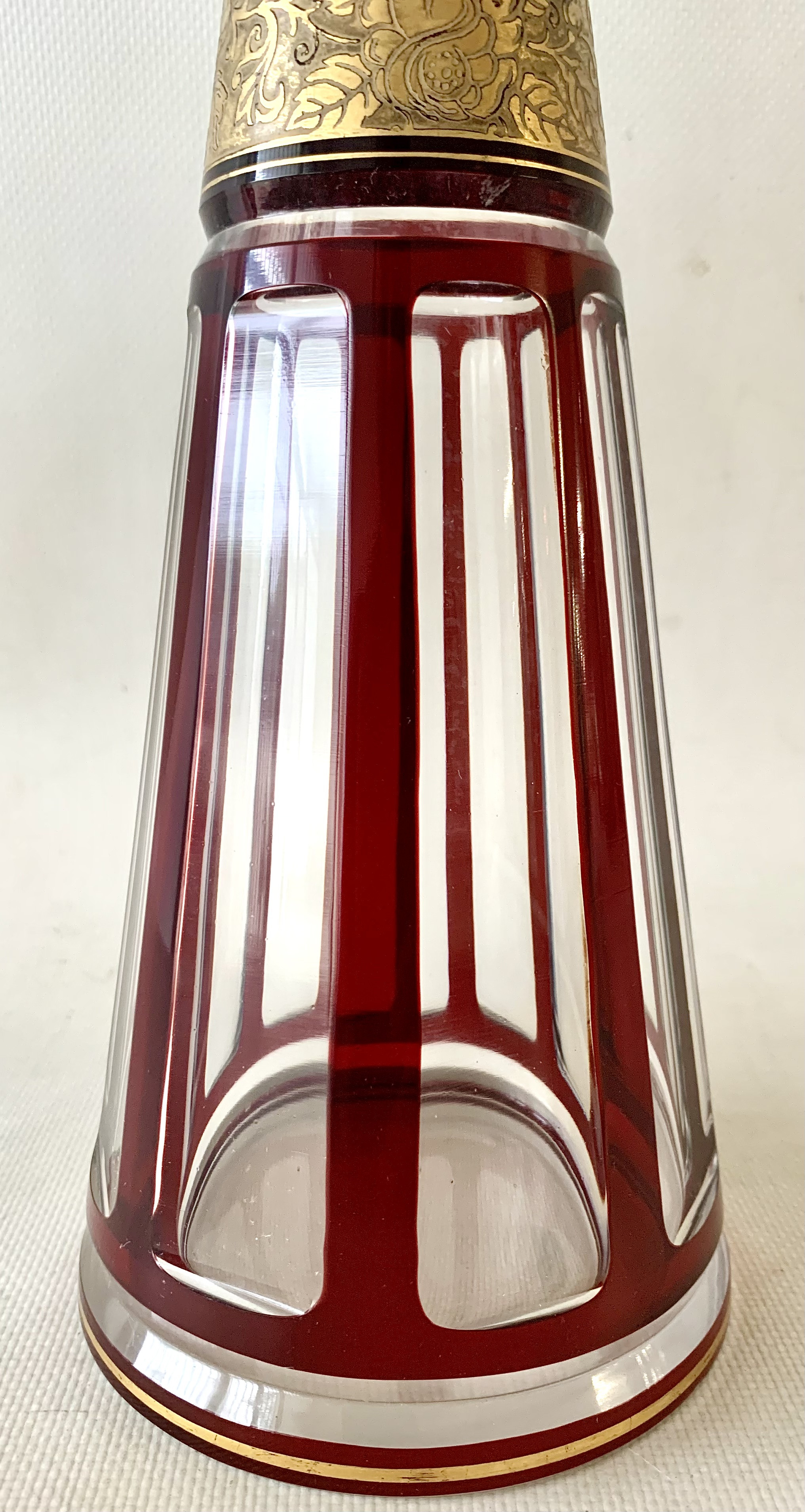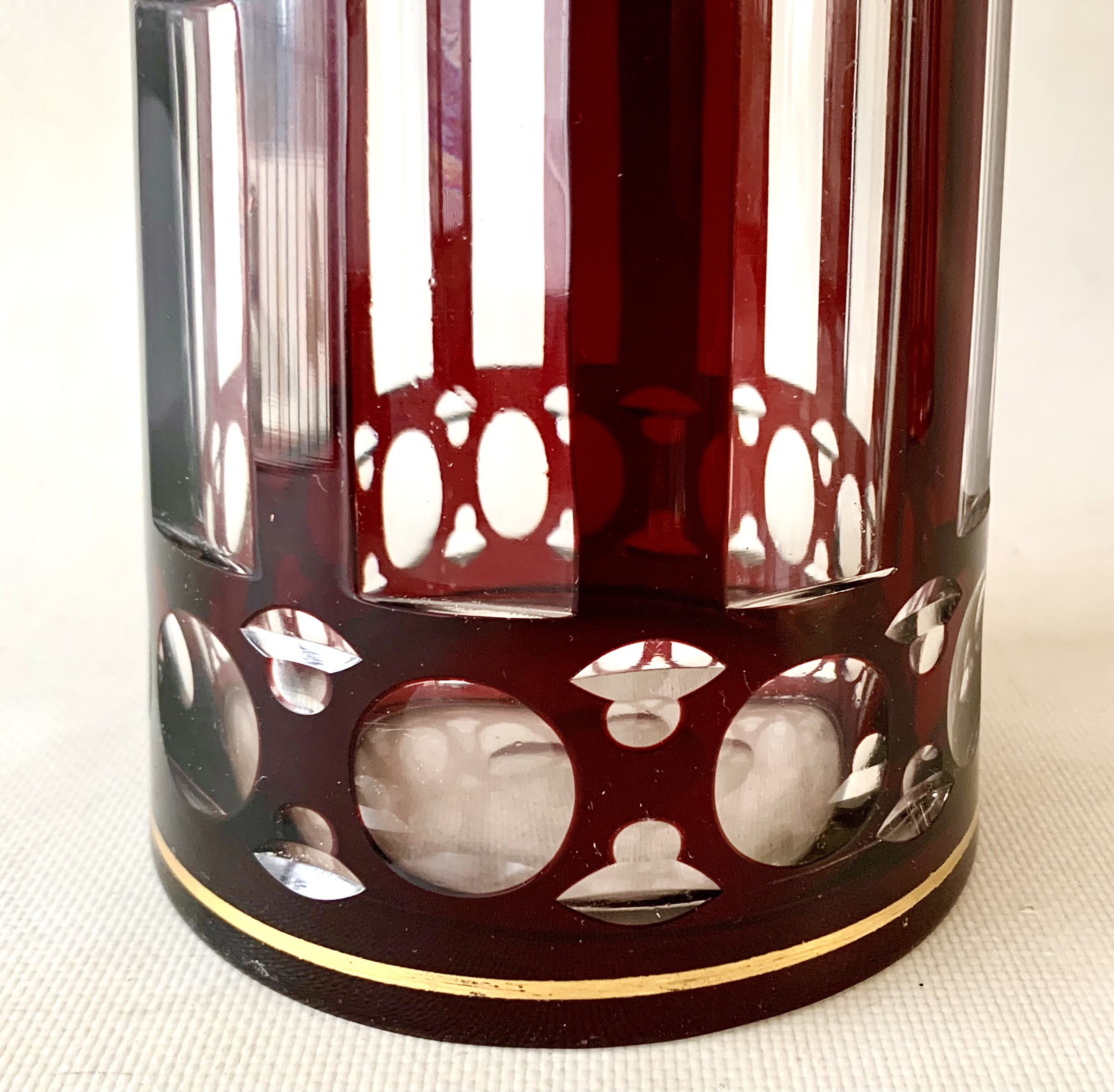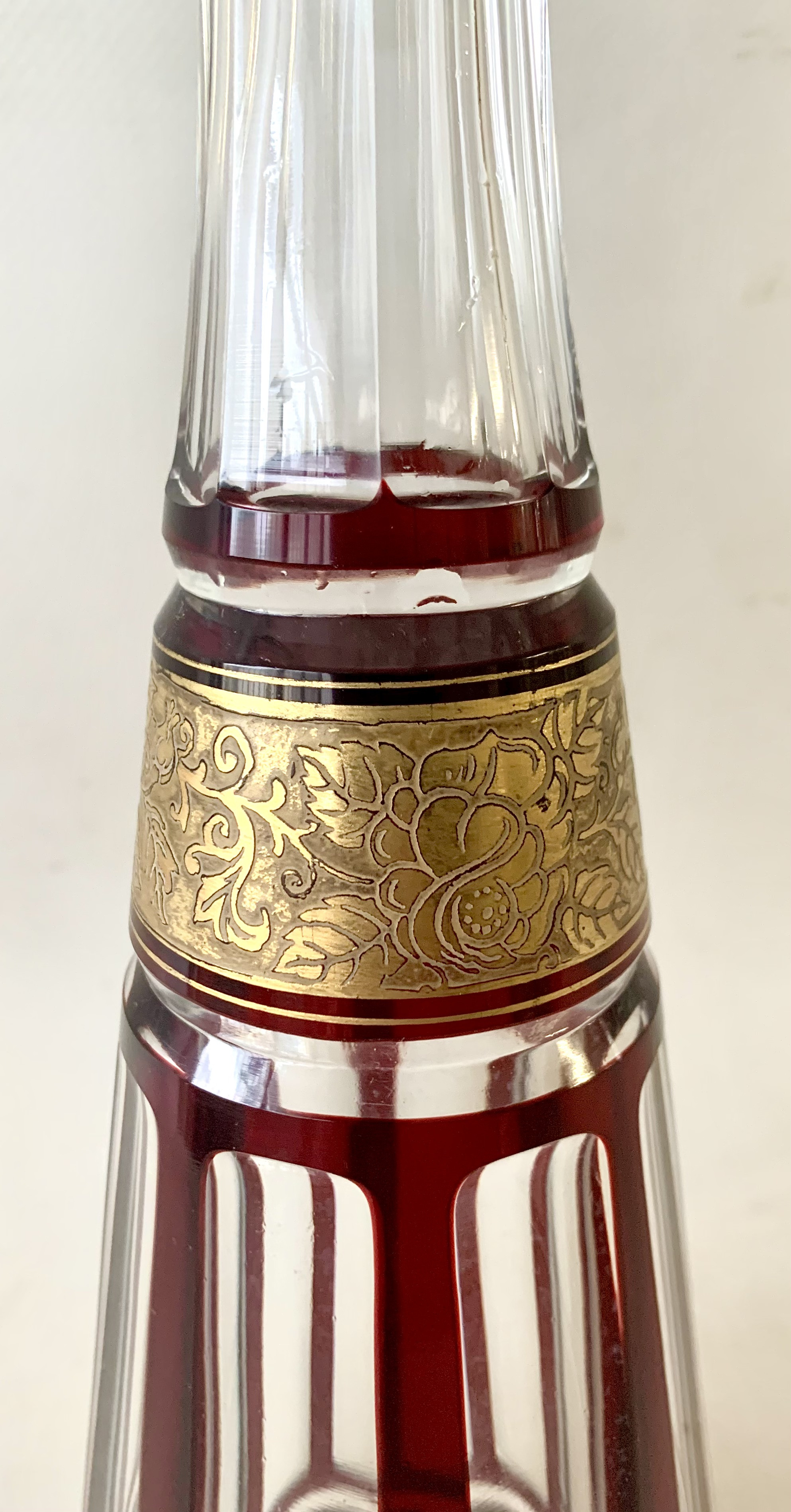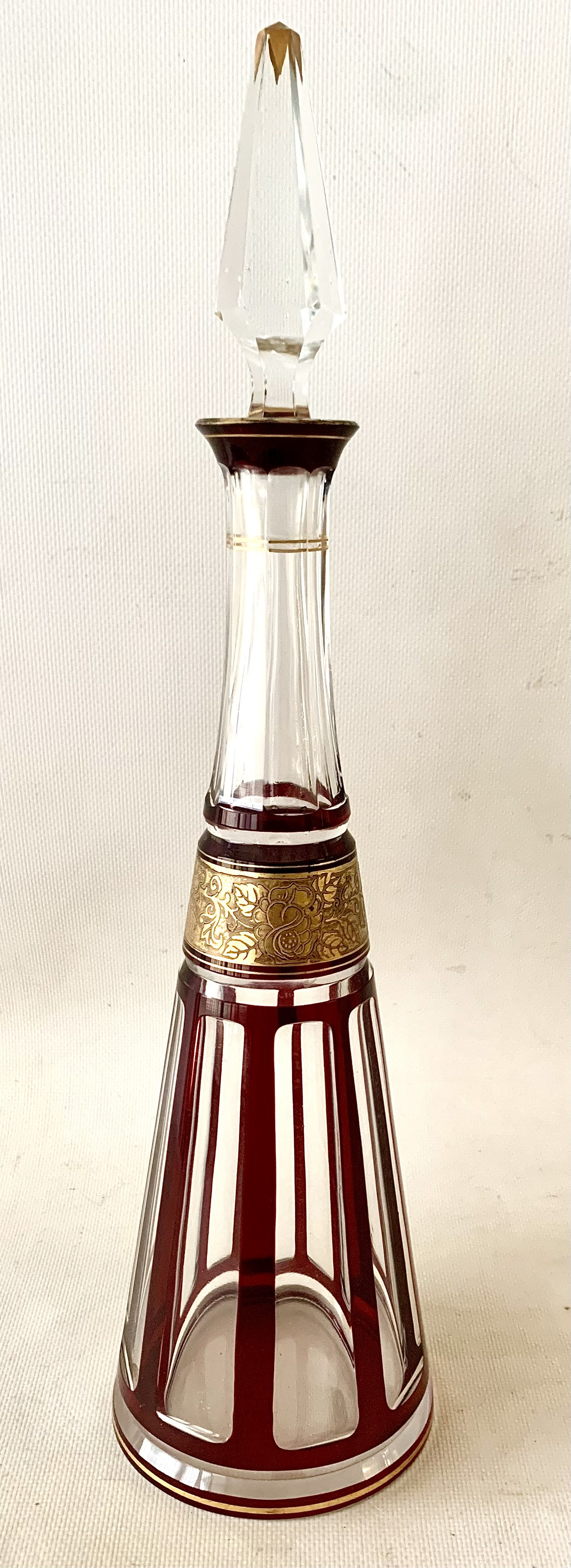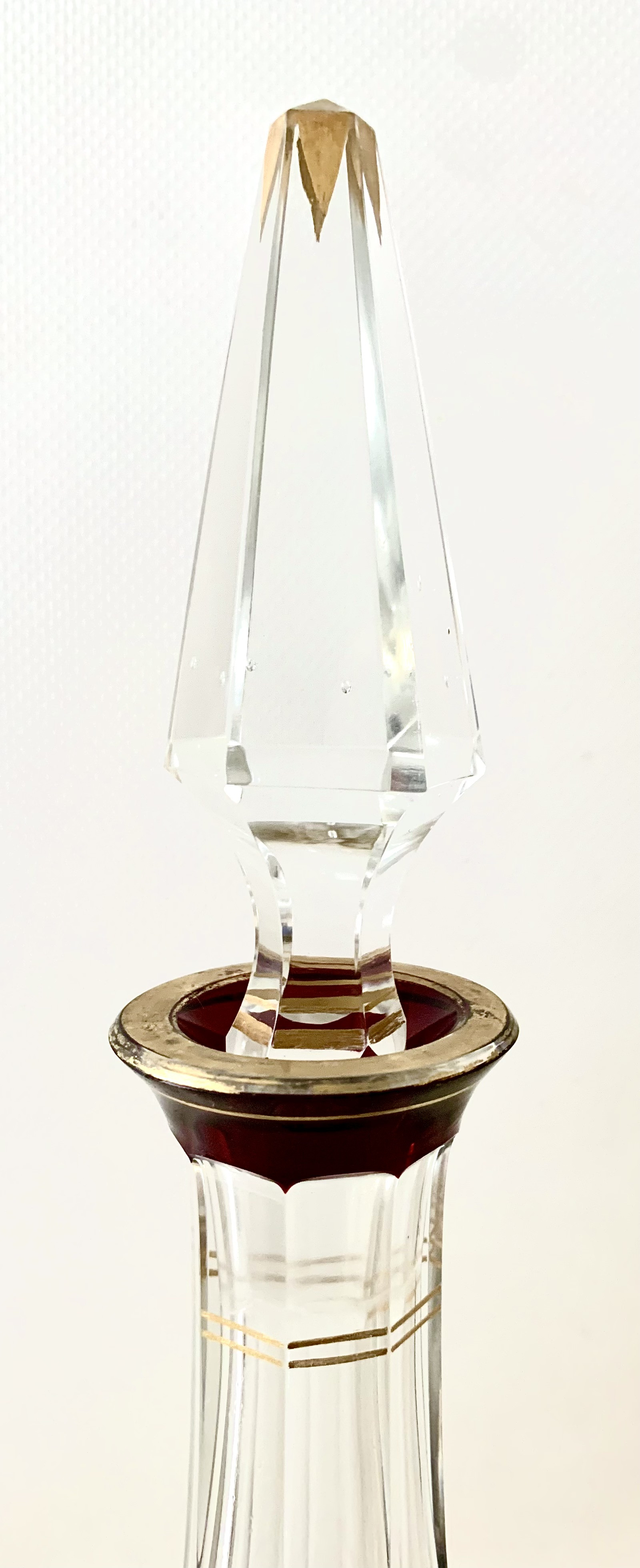 Pareja de botella licorera y jarra de cristal tallado, decó.