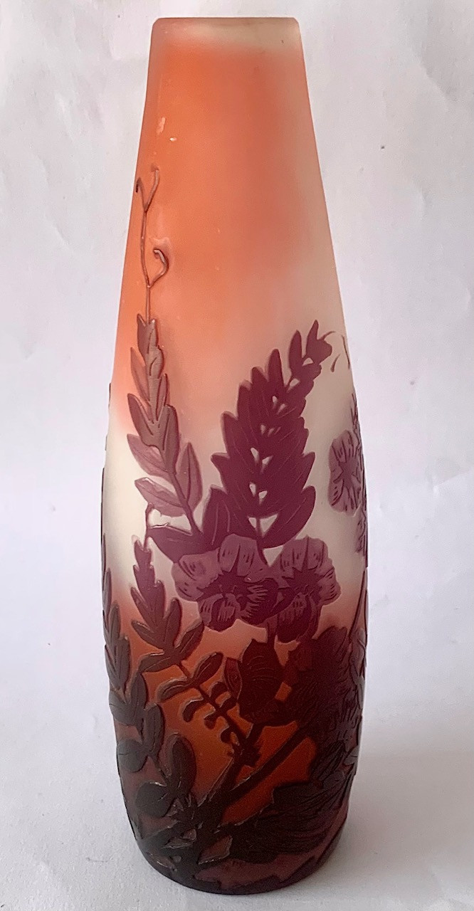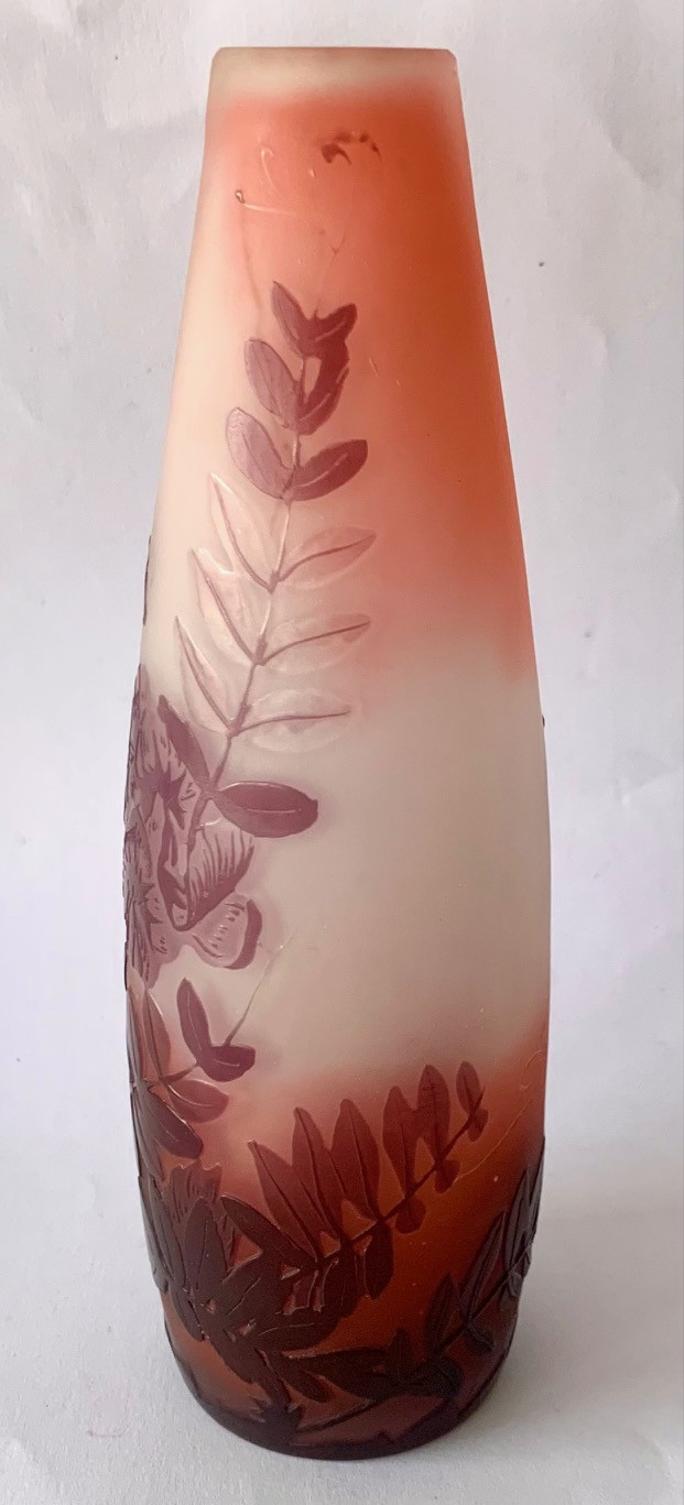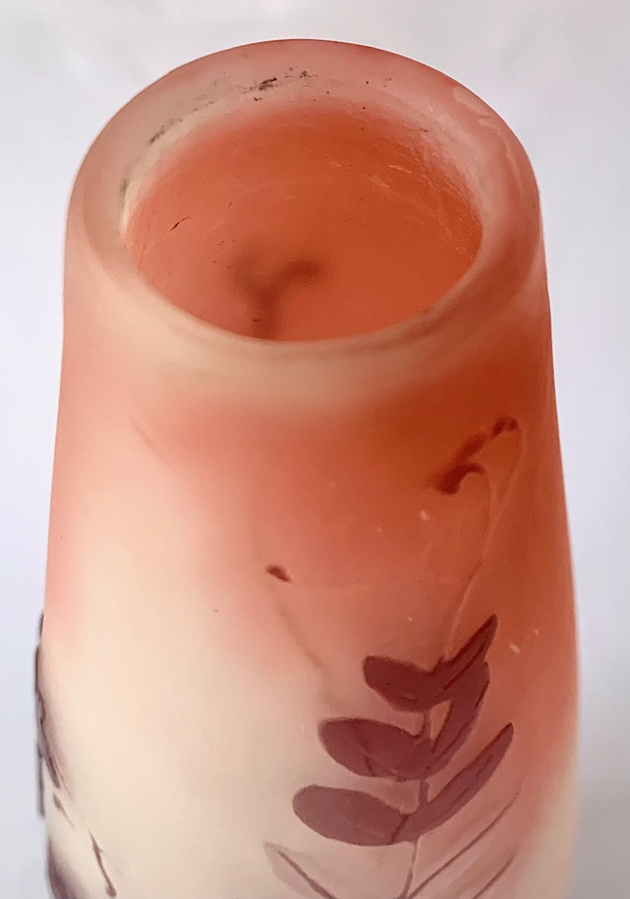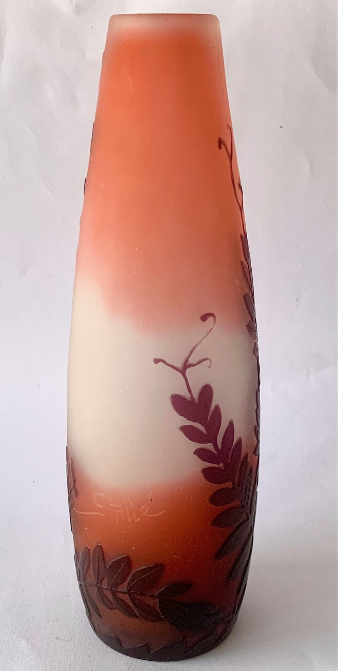 Jarrón de cristal Emile Gallé, Art Nouveau, de principios del Siglo XX. Grabado al ácido. Firmado.