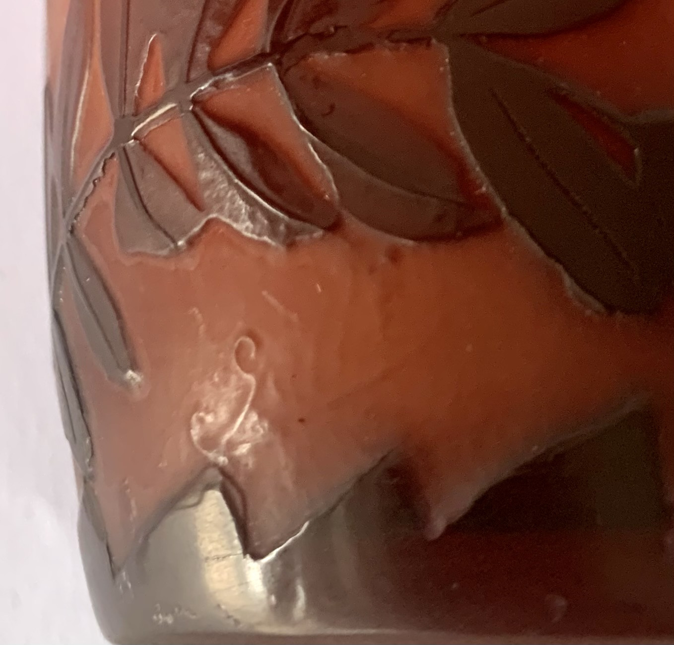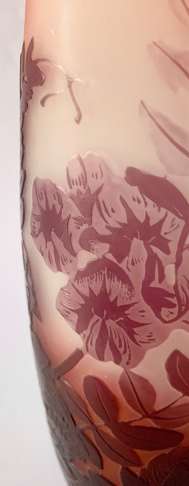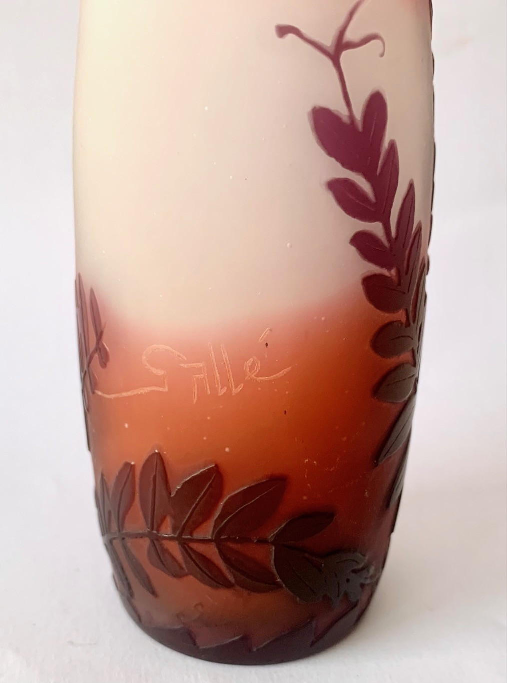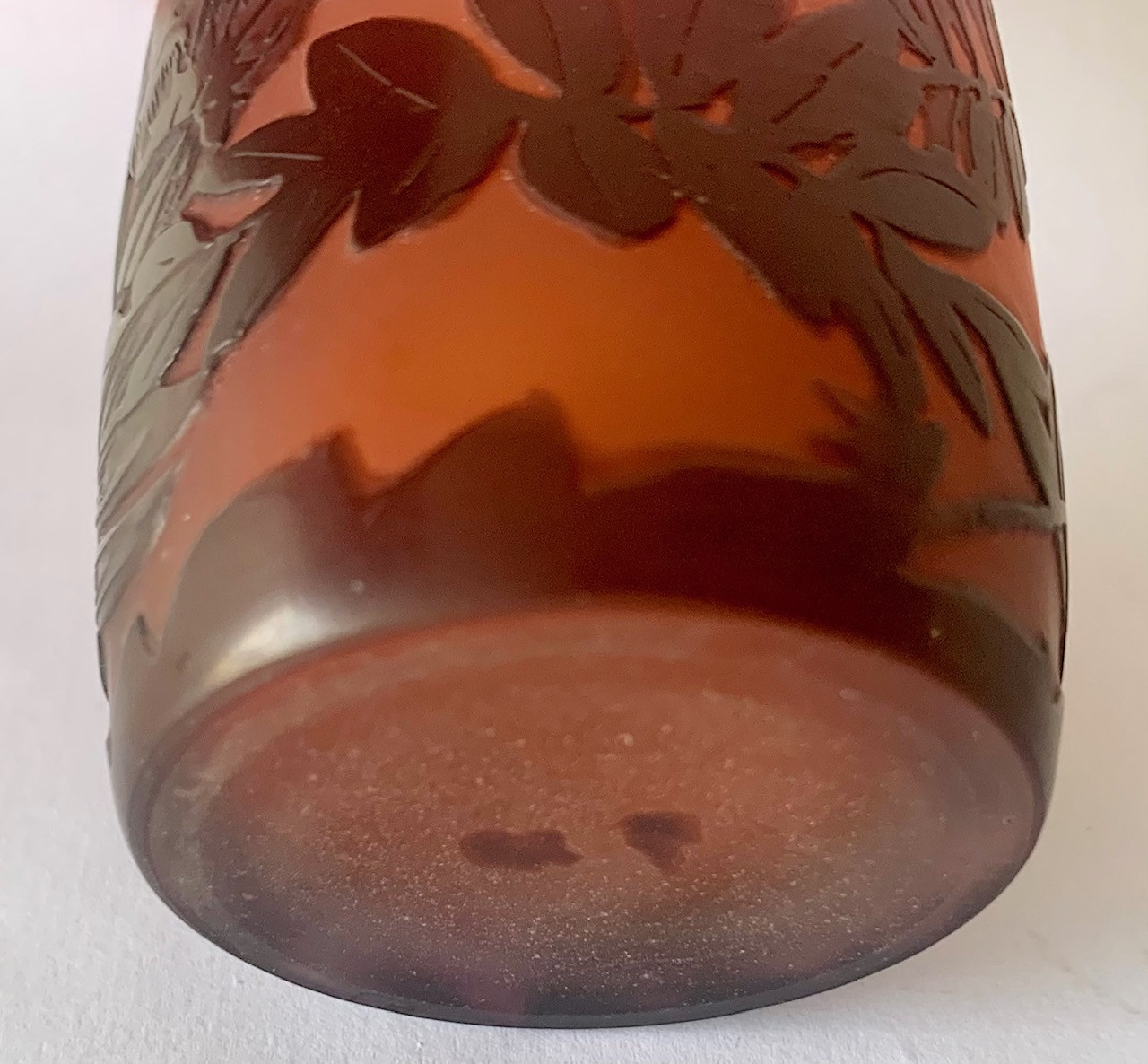 Jarrón de cristal Emile Gallé, Art Nouveau, de principios del Siglo XX. Grabado al ácido. Firmado.
