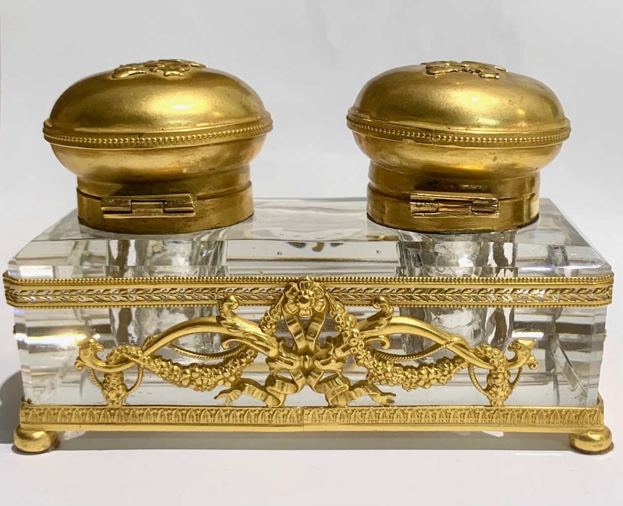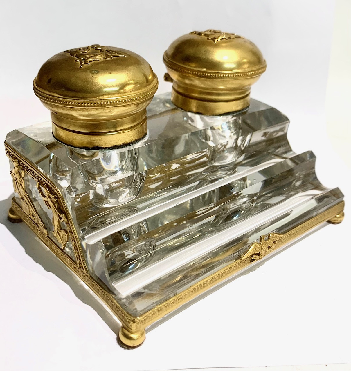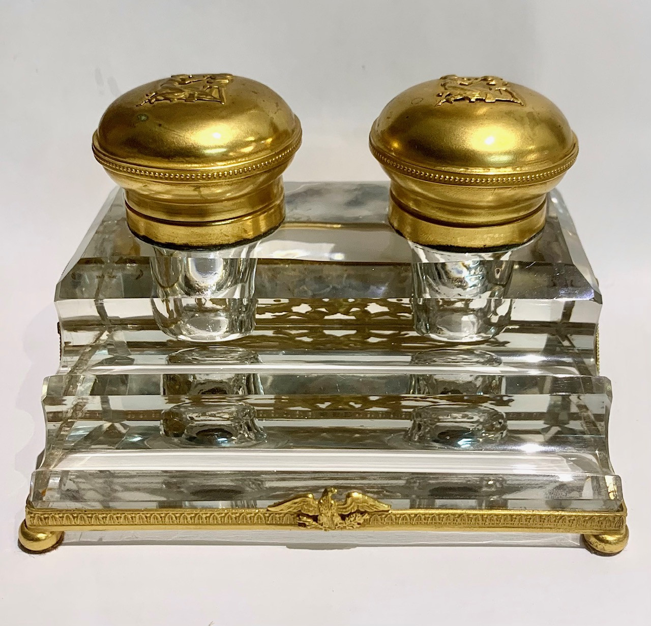 Tintero doble de bronce y cristal Imperio. Francia Siglo XIX.