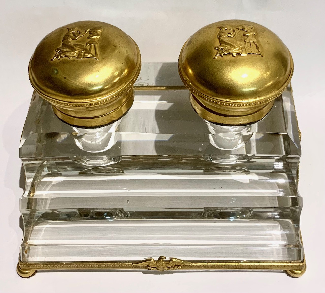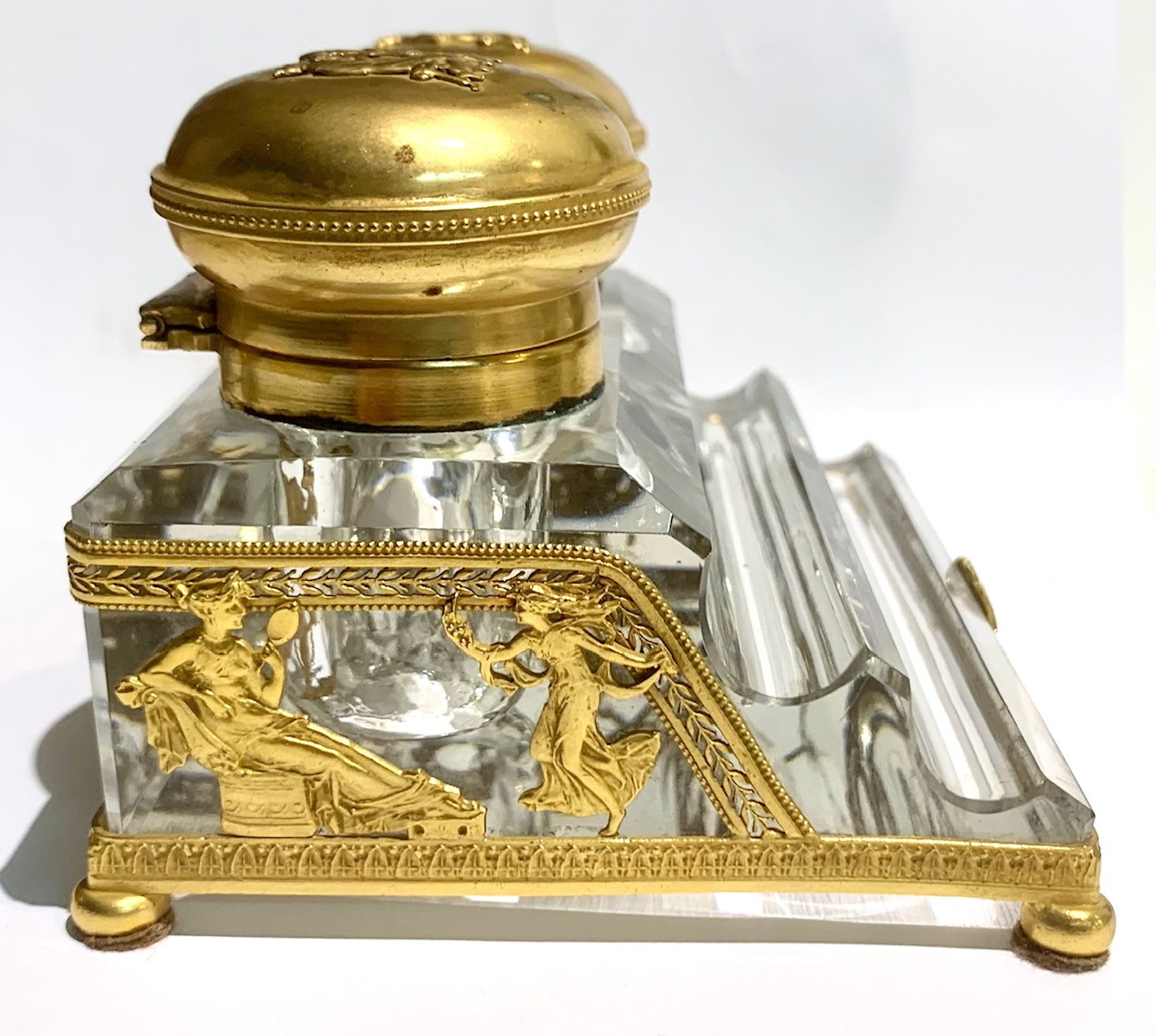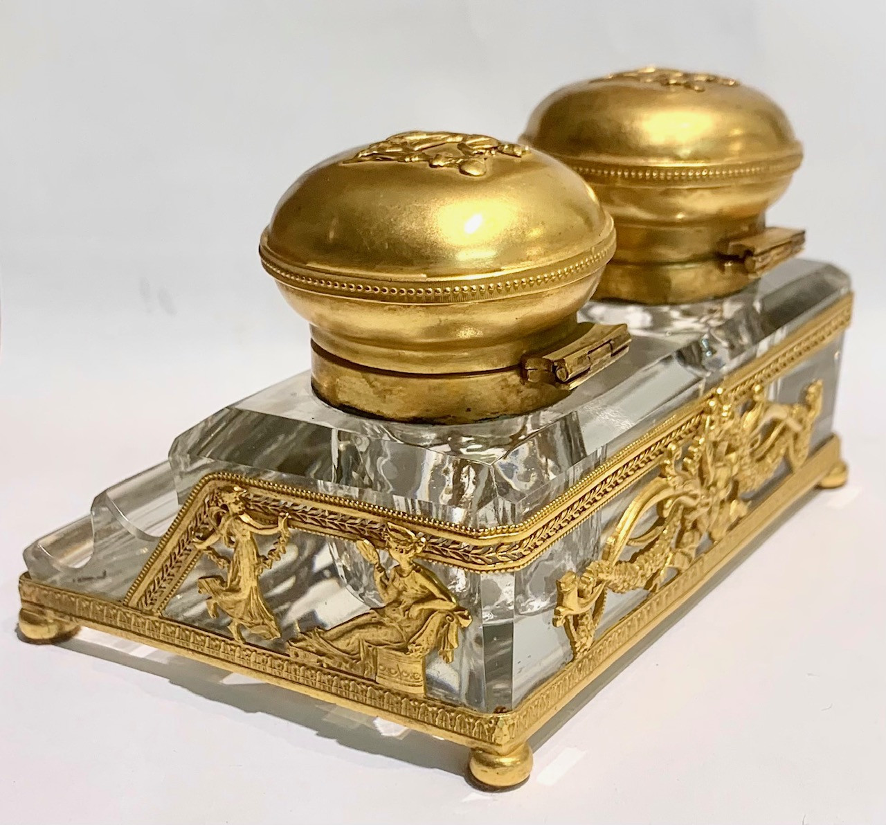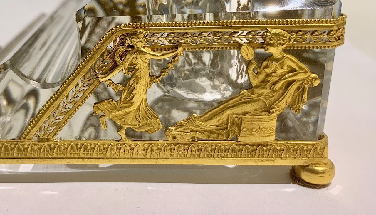 Tintero de cristal y bronce dorado, Periodo Imperio francés, circa 1860. De forma rectangular el cristal y escalonado para apoyar plumas, descansa sobre cuatro pies redondos de bronce, y en la parte superior, la pareja de tinteros de bronce dorados en relieve que representan las artes escultóricas. En la totalidad de su perímetro, decoración en bronce bajorrelieve con escenas clásicas. Estado de conservación muy bueno.