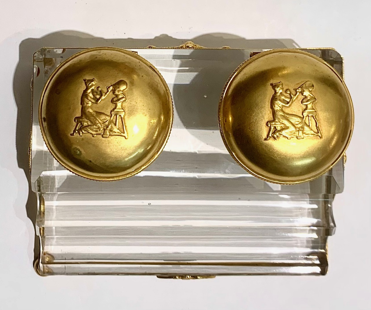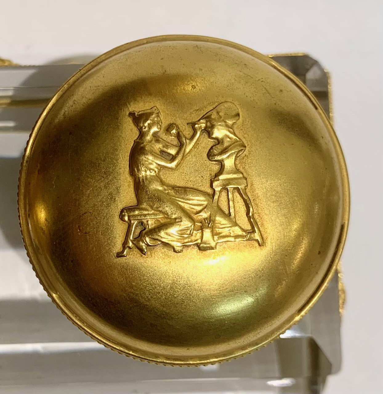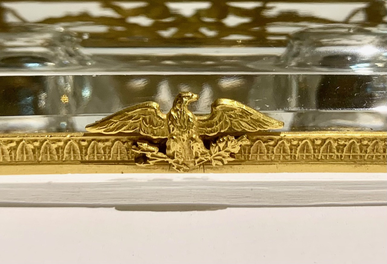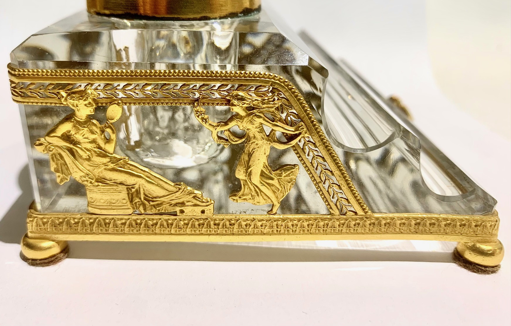 Tintero de cristal y bronce dorado, Periodo Imperio francés, circa 1860. De forma rectangular el cristal y escalonado para apoyar plumas, descansa sobre cuatro pies redondos de bronce, y en la parte superior, la pareja de tinteros de bronce dorados en relieve que representan las artes escultóricas. En la totalidad de su perímetro, decoración en bronce bajorrelieve con escenas clásicas. Estado de conservación muy bueno.