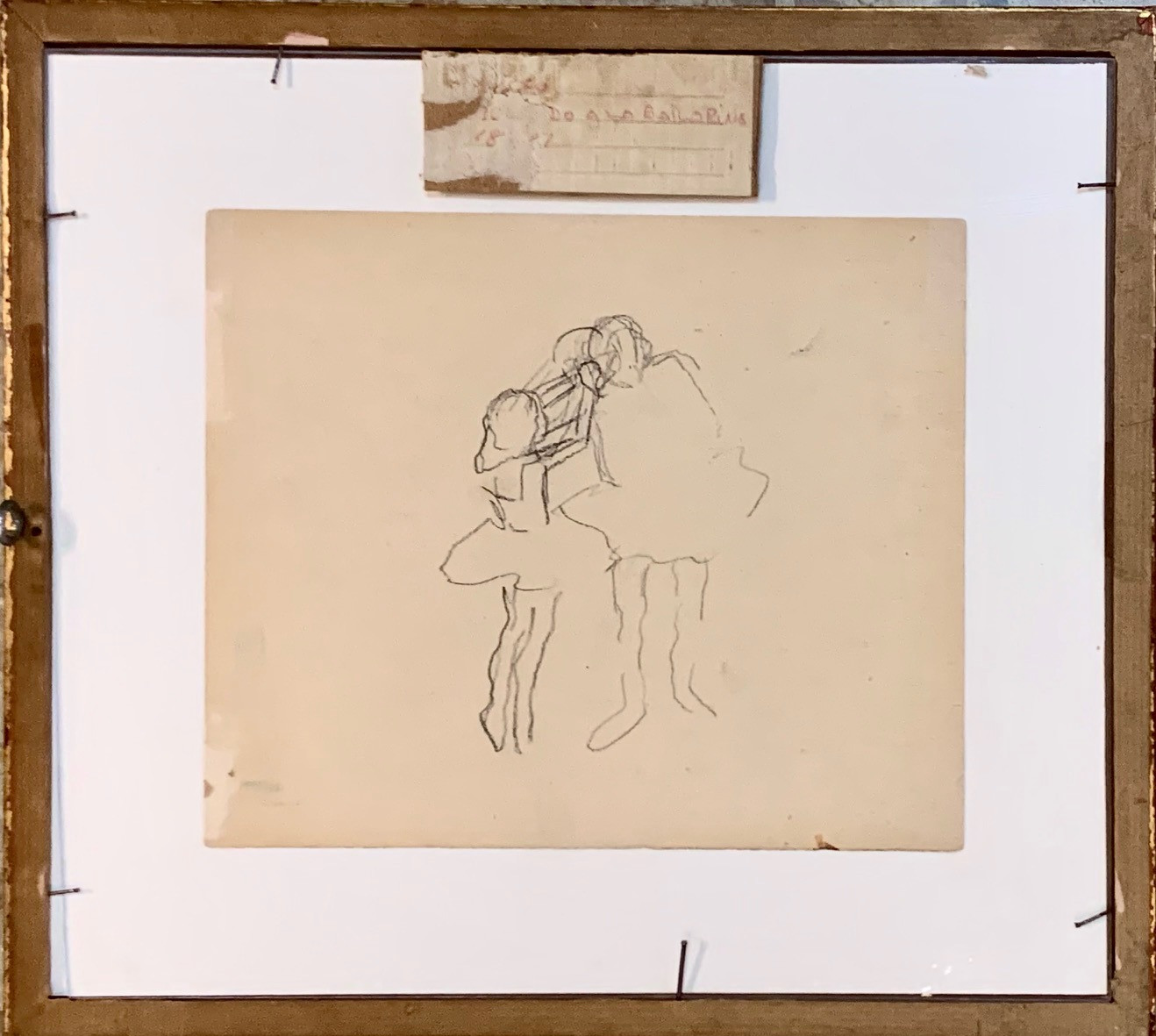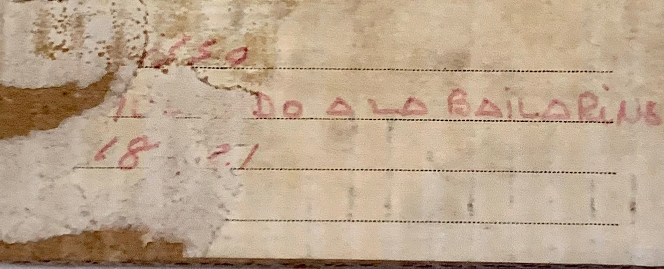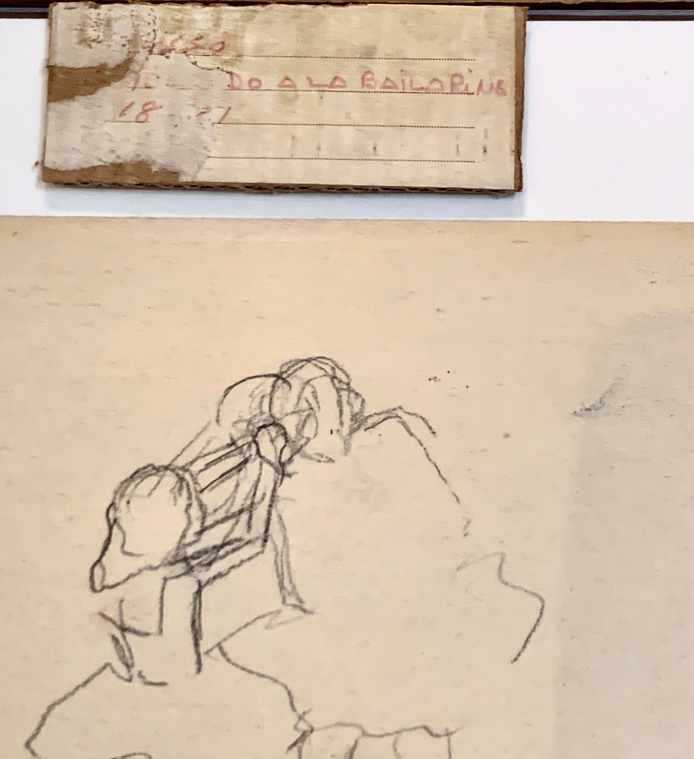 En el lado trasero dibujó un esbozo de las bailarinas, que luego acabó definitivamente en el otro lado. Firmado en el lado inferior derecho. También se conserva una vieja etiqueta de una exposición.