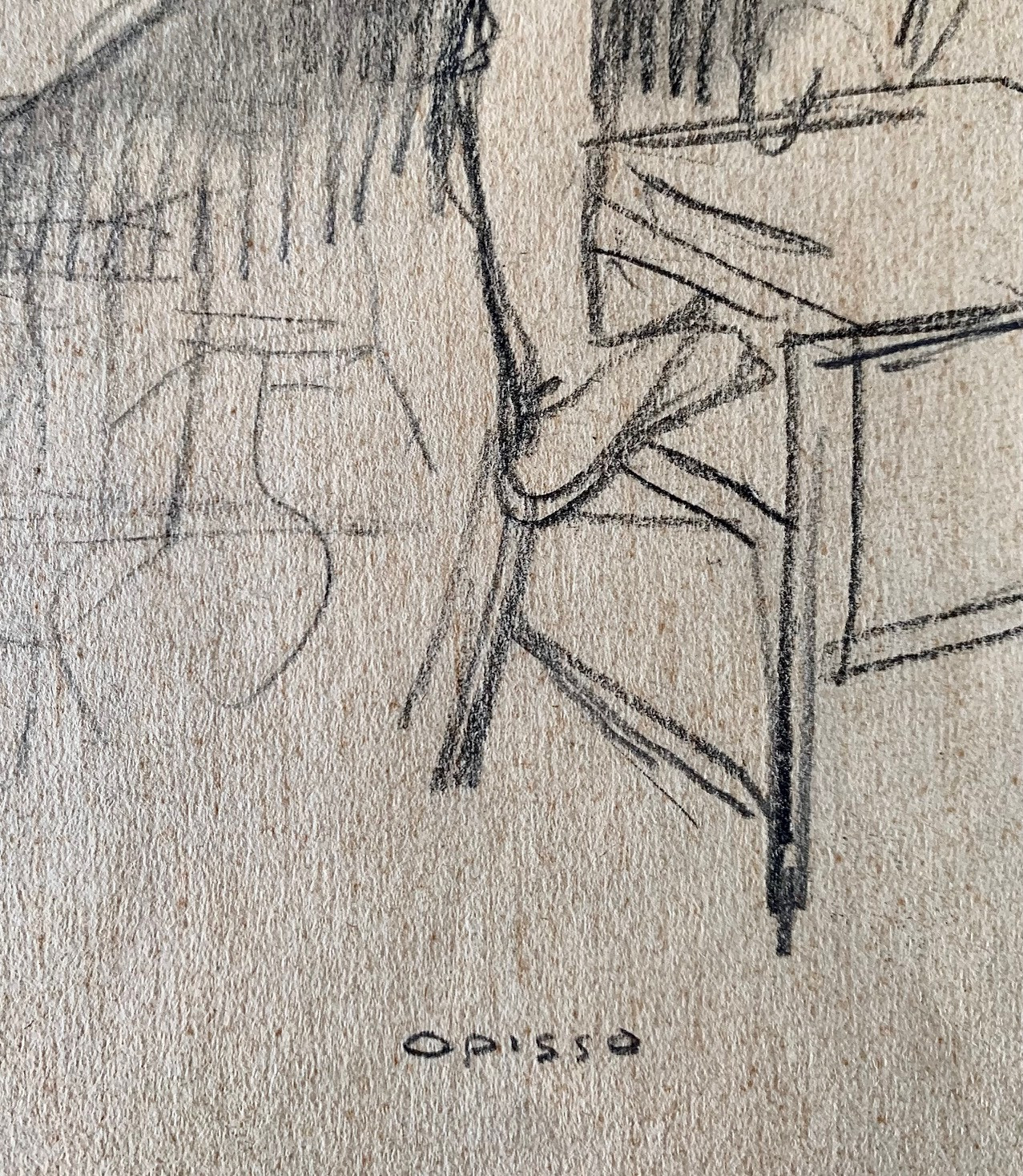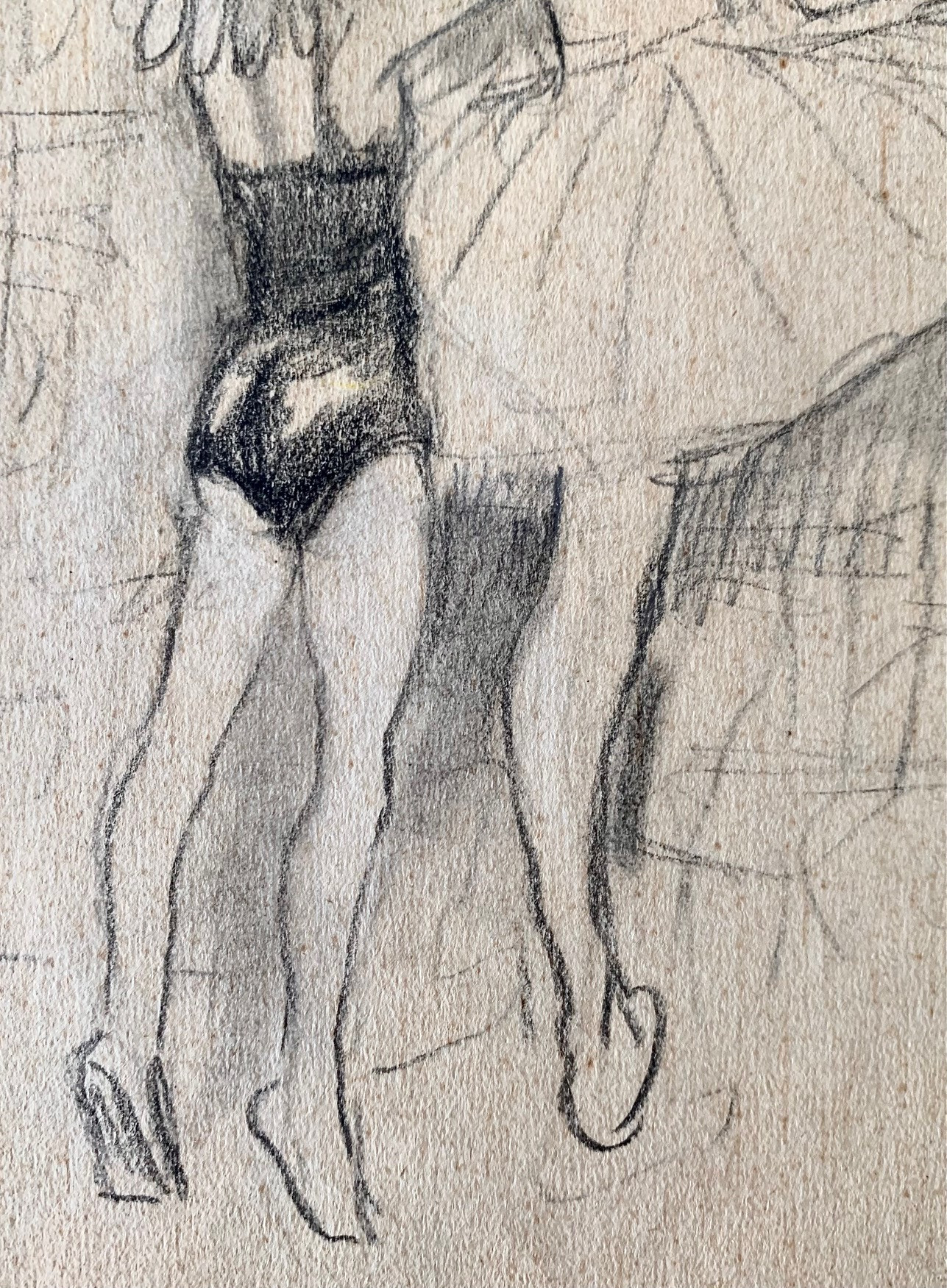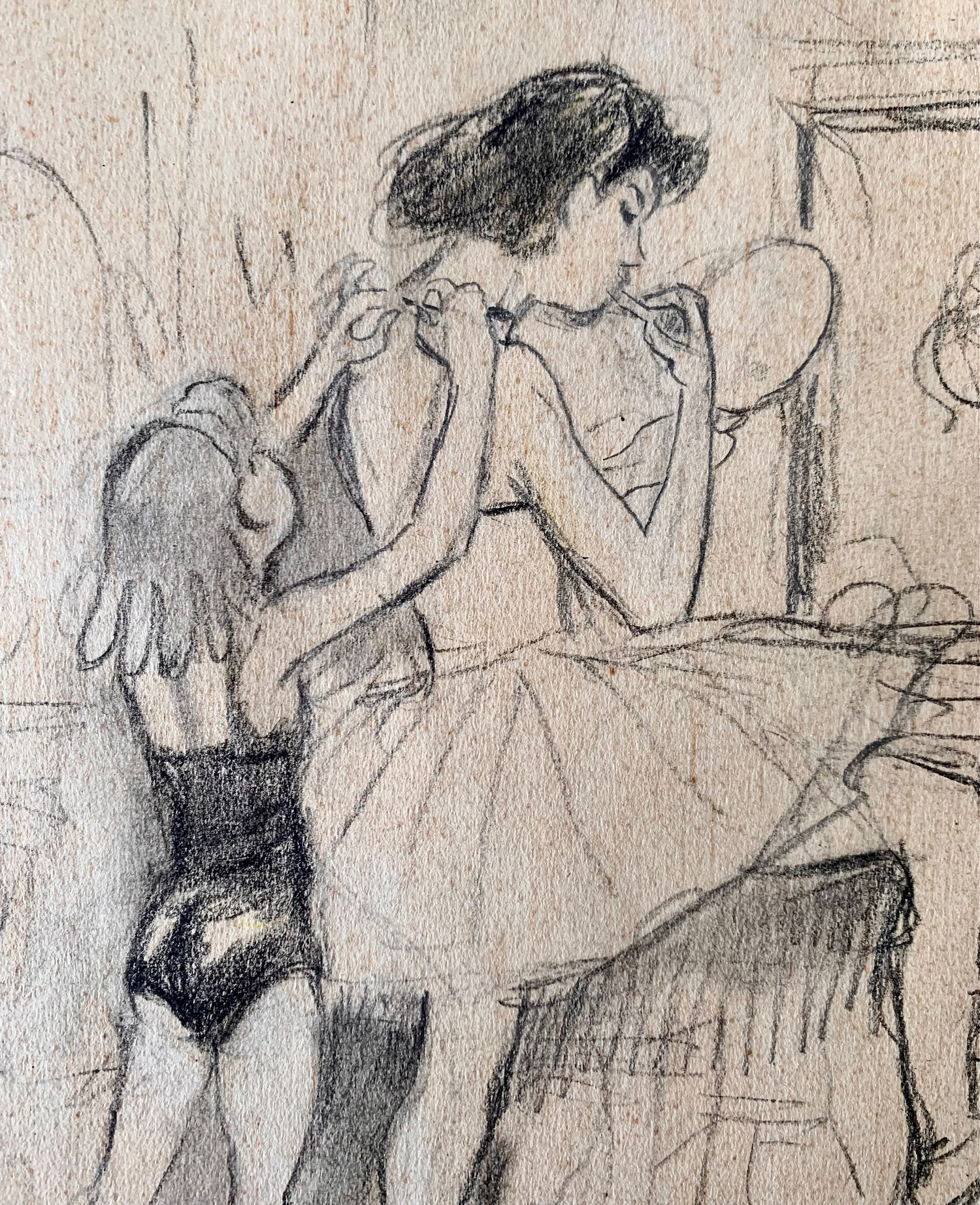 En el lado trasero dibujó un esbozo de las bailarinas, que luego acabó definitivamente en el otro lado. Firmado en el lado inferior derecho. También se conserva una vieja etiqueta de una exposición.