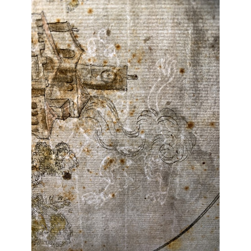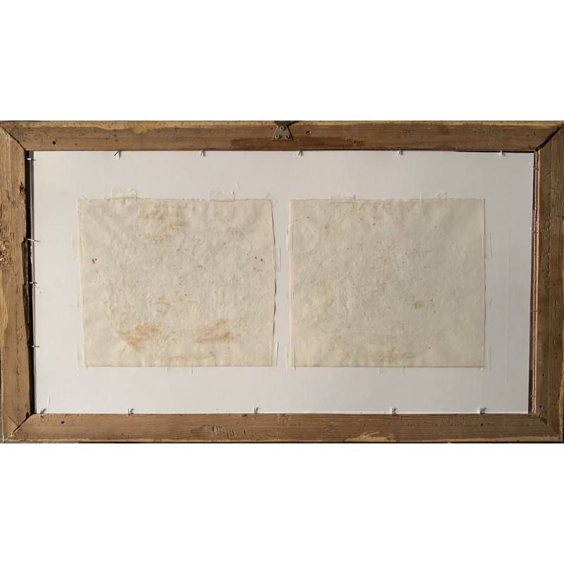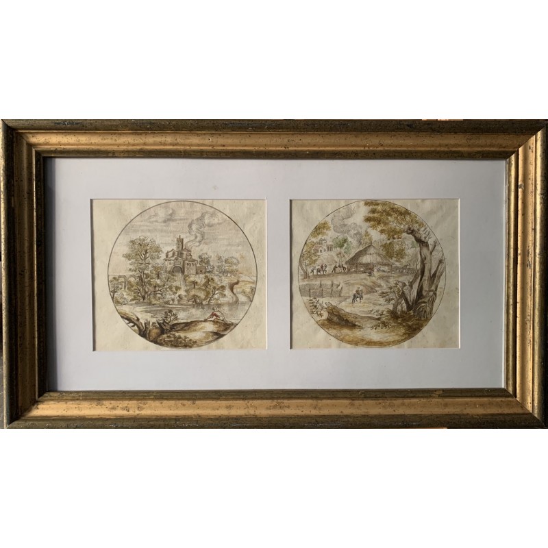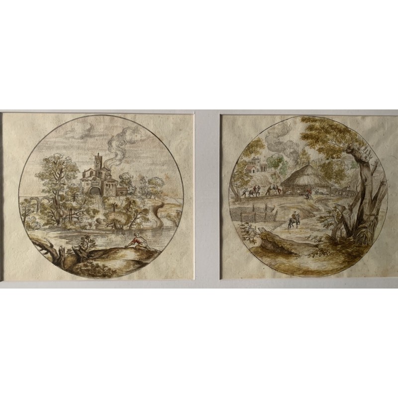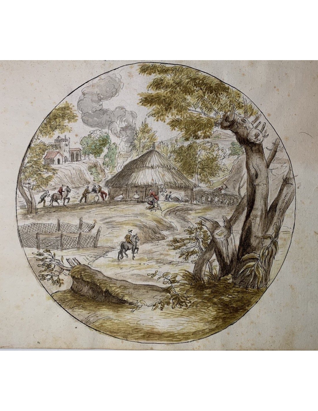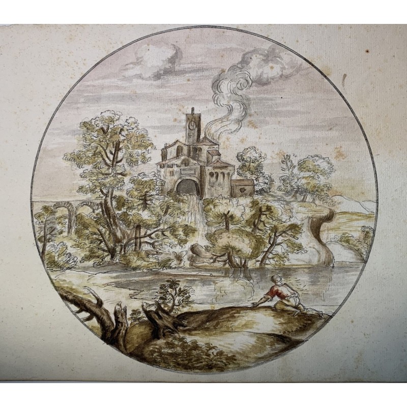 Dibujos acuarelados de la mitad del siglo XVIII, paisajes con figuras, tinta y acuarela sobre papel, visible en contra luz un Leon, marca de agua o filigrana del papel y utilizada como firma del fabricante.