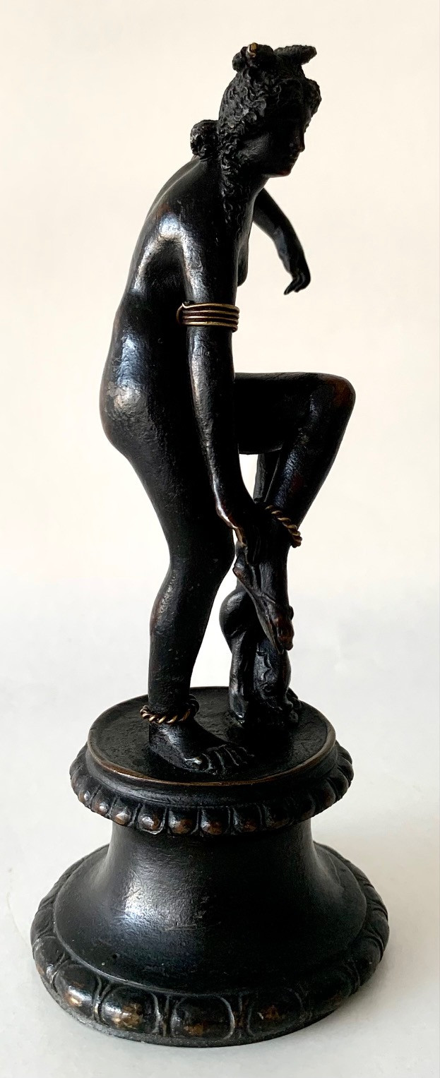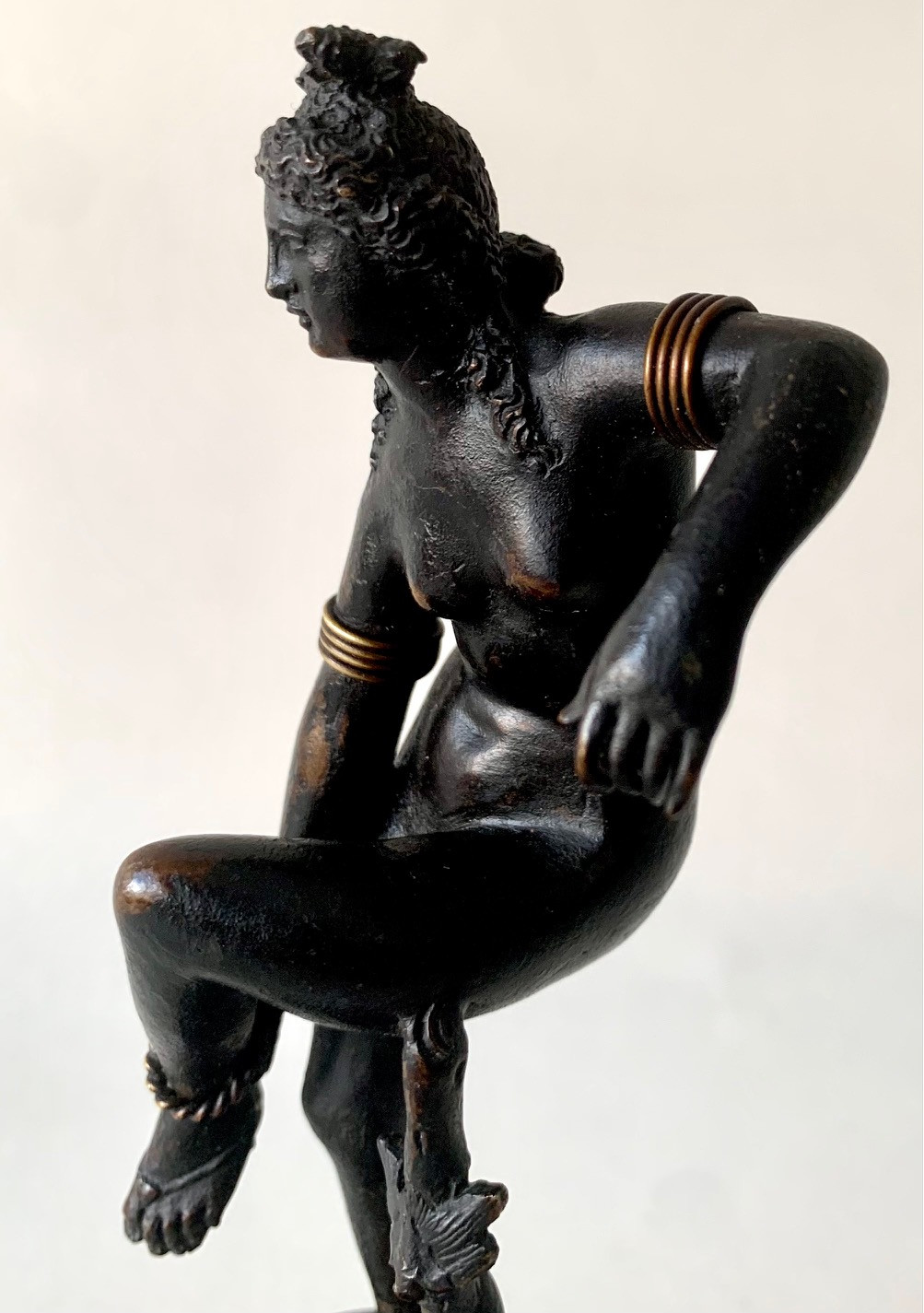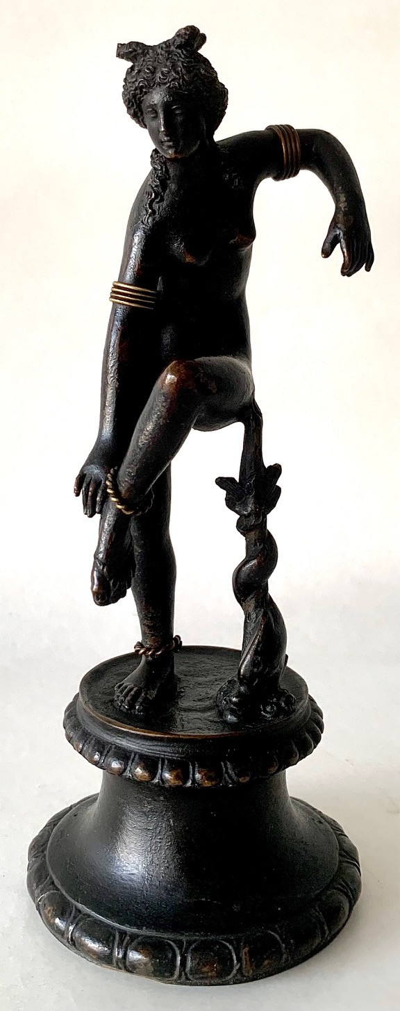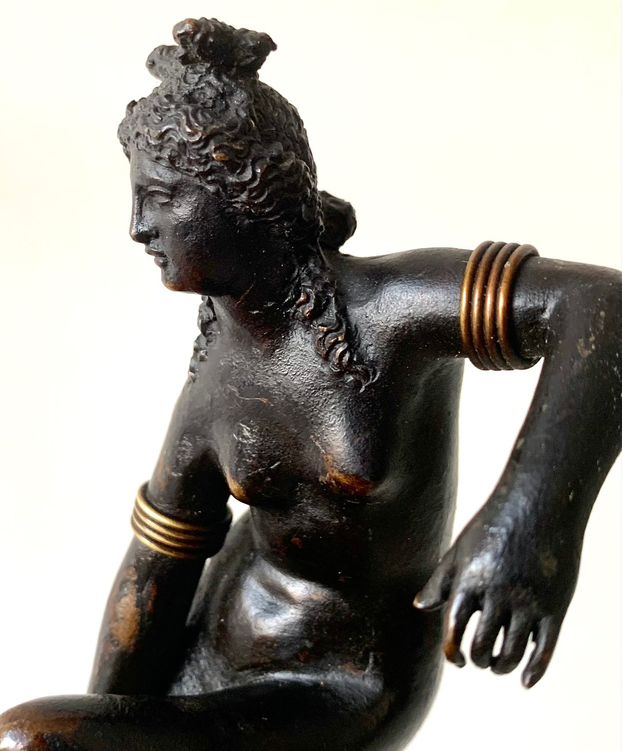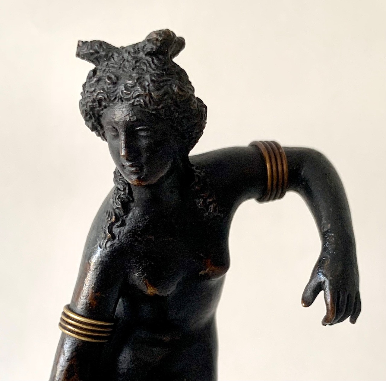 “Afrodita al baño o Venus en la religión romana”, bronce de la primera mitad del siglo XIX (1830 circa), bronce con patina marrón oscura, sobre ella, destacan las cuatro pulsera en bronce no patinado. Venus se representa desnuda y sujetándose a un delfín estilizado descalzándose la sandalia, base redonda de apoyo, bonita definición de los detalles, buen estado de conservación considerando los dos siglo de vida.