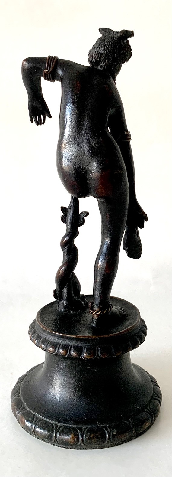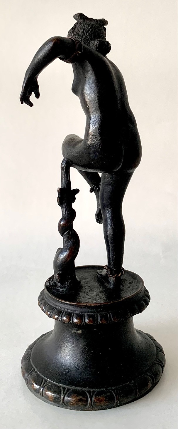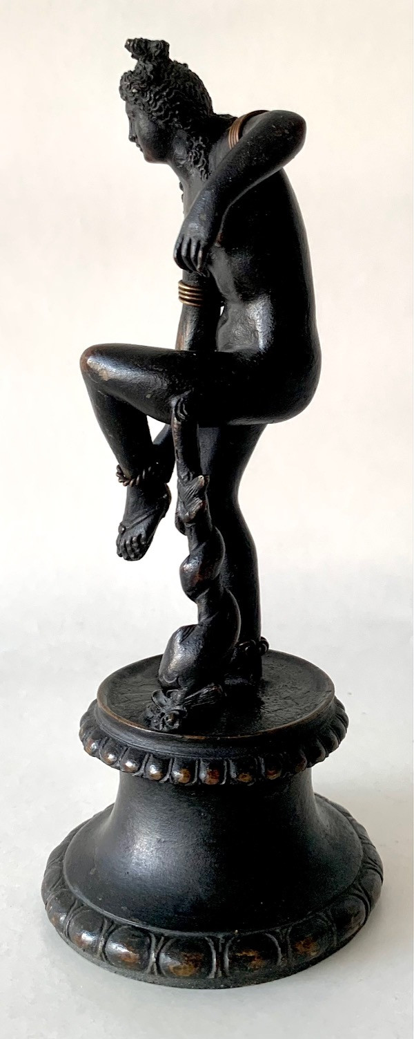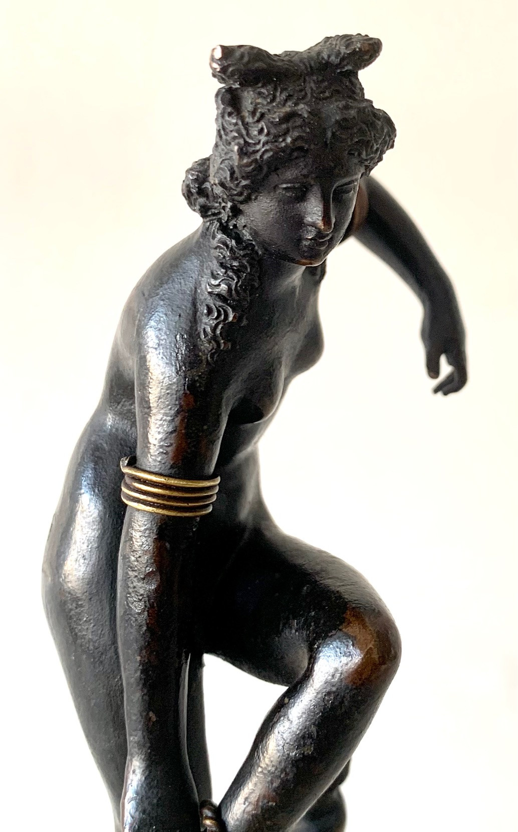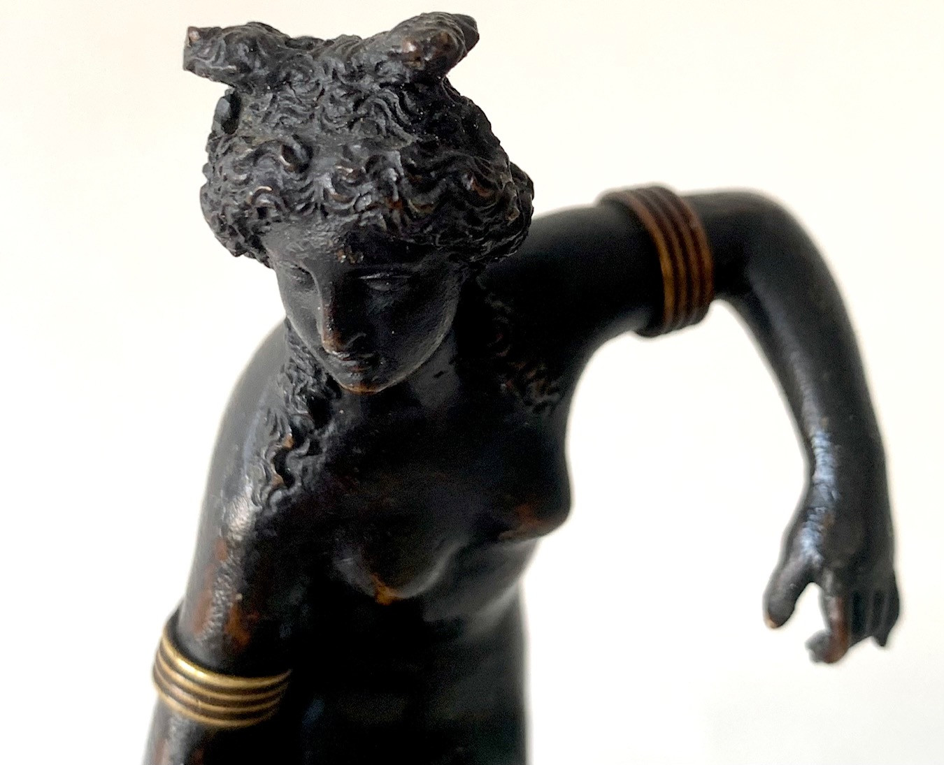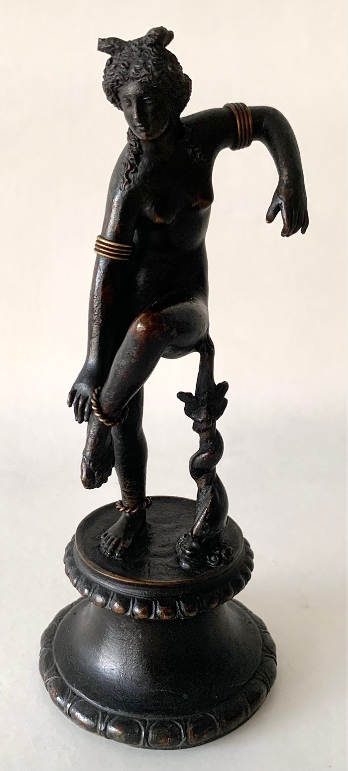 “Afrodita al baño o Venus en la religión romana”, bronce de la primera mitad del siglo XIX (1830 circa), bronce con patina marrón oscura, sobre ella, destacan las cuatro pulsera en bronce no patinado. Venus se representa desnuda y sujetándose a un delfín estilizado descalzándose la sandalia, base redonda de apoyo, bonita definición de los detalles, buen estado de conservación considerando los dos siglo de vida.