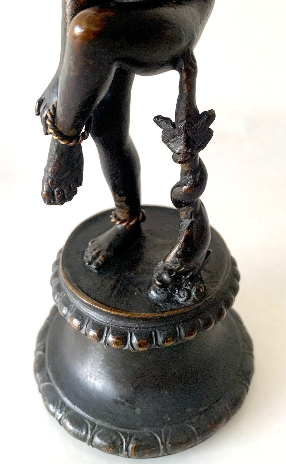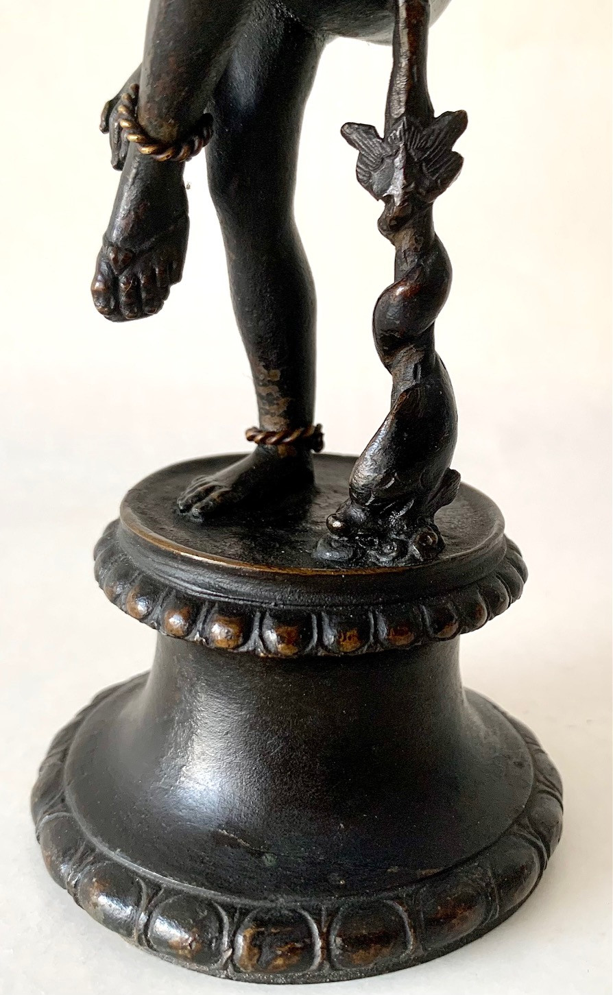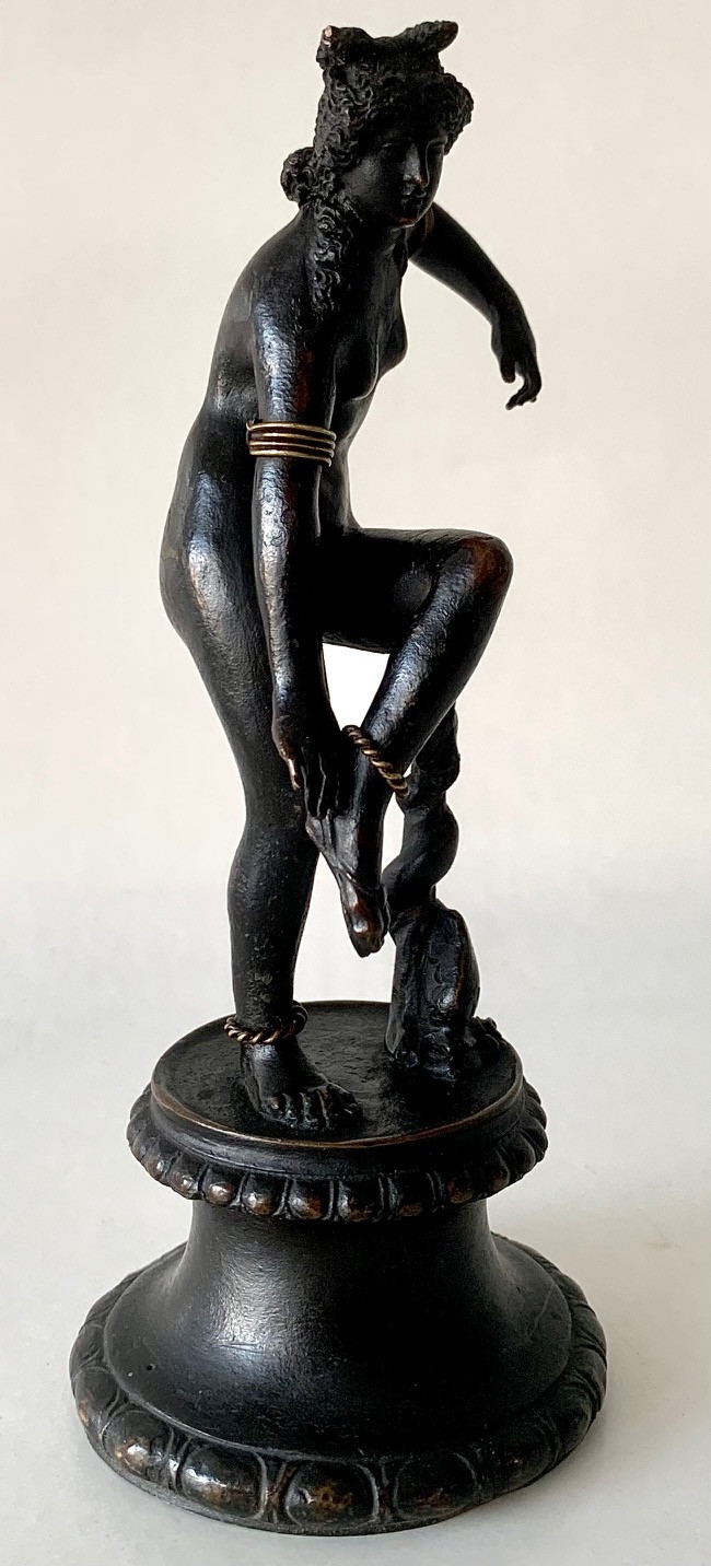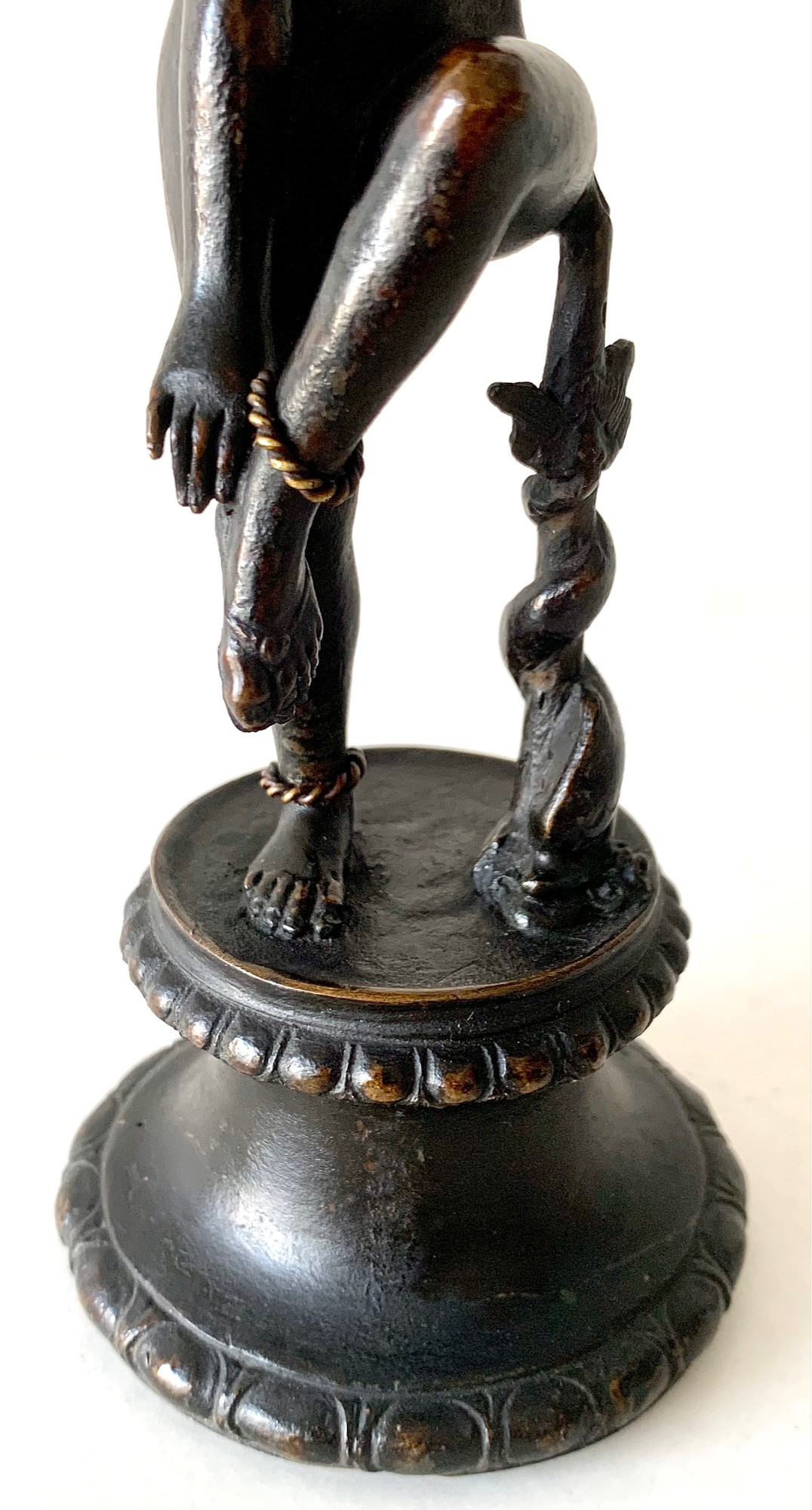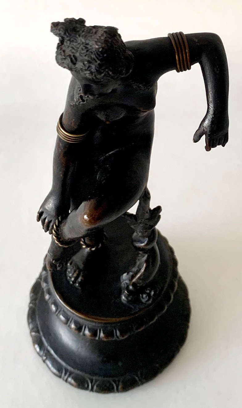 “Afrodita al baño o Venus en la religión romana”, bronce de la primera mitad del siglo XIX (1830 circa), bronce con patina marrón oscura, sobre ella, destacan las cuatro pulsera en bronce no patinado. Venus se representa desnuda y sujetándose a un delfín estilizado descalzándose la sandalia, base redonda de apoyo, bonita definición de los detalles, buen estado de conservación considerando los dos siglo de vida.