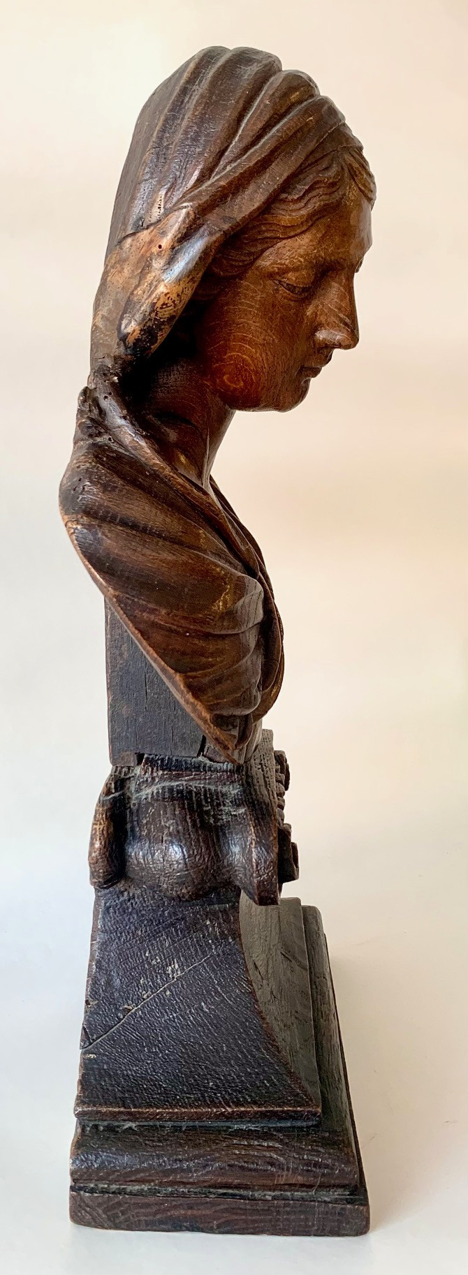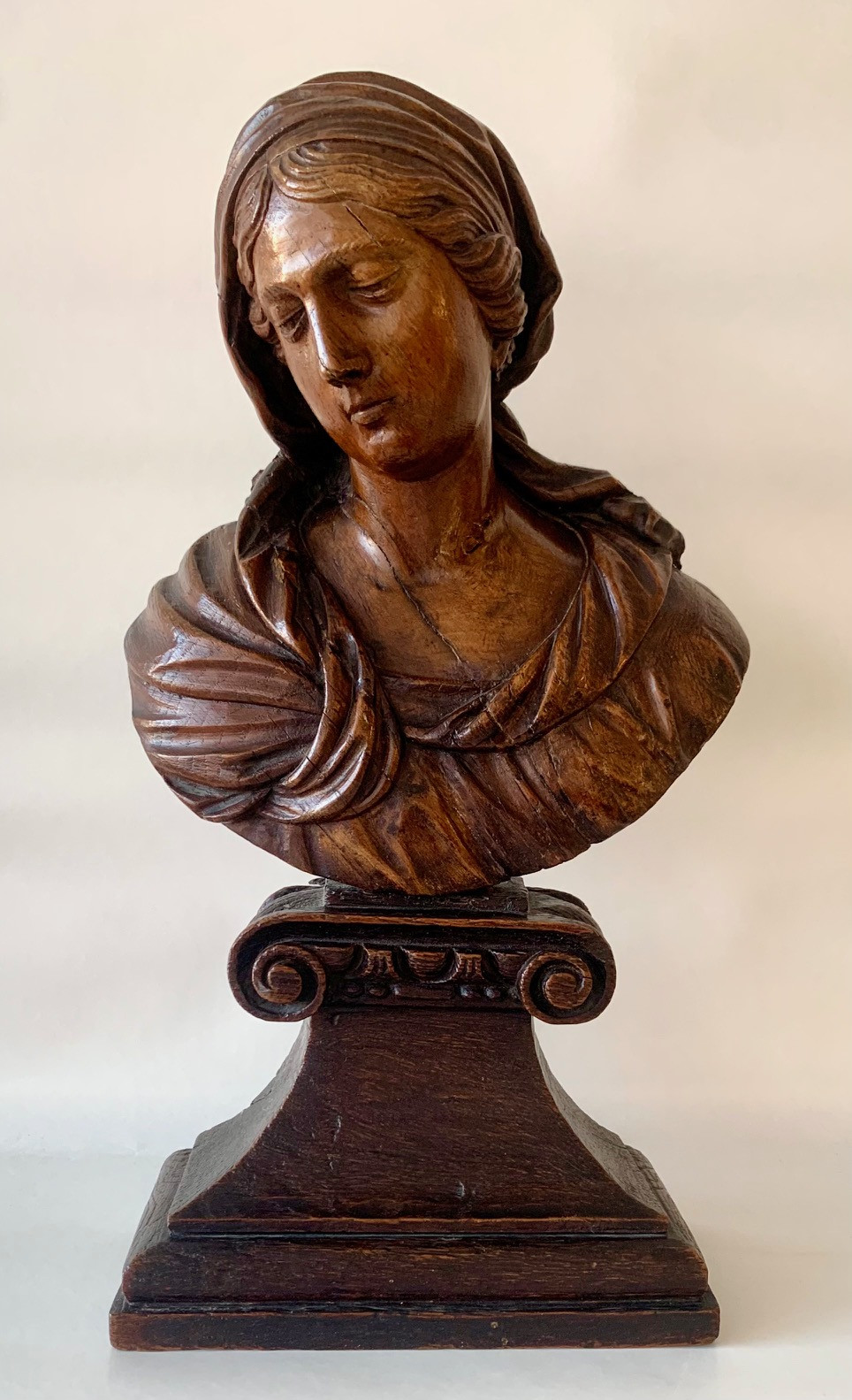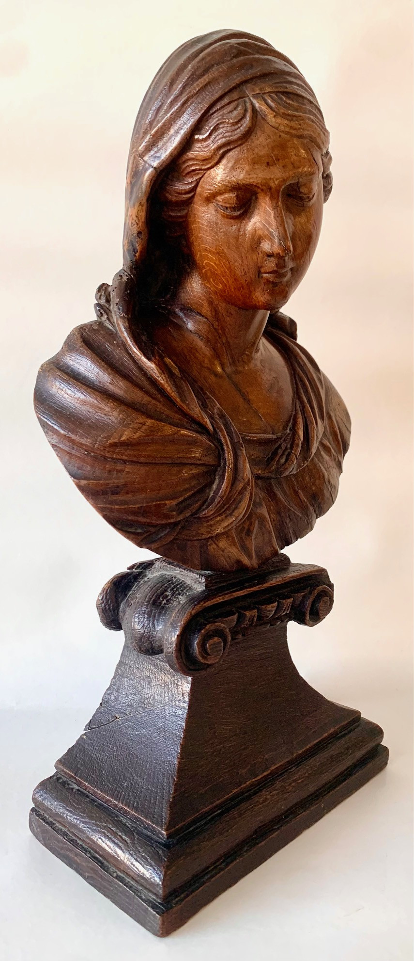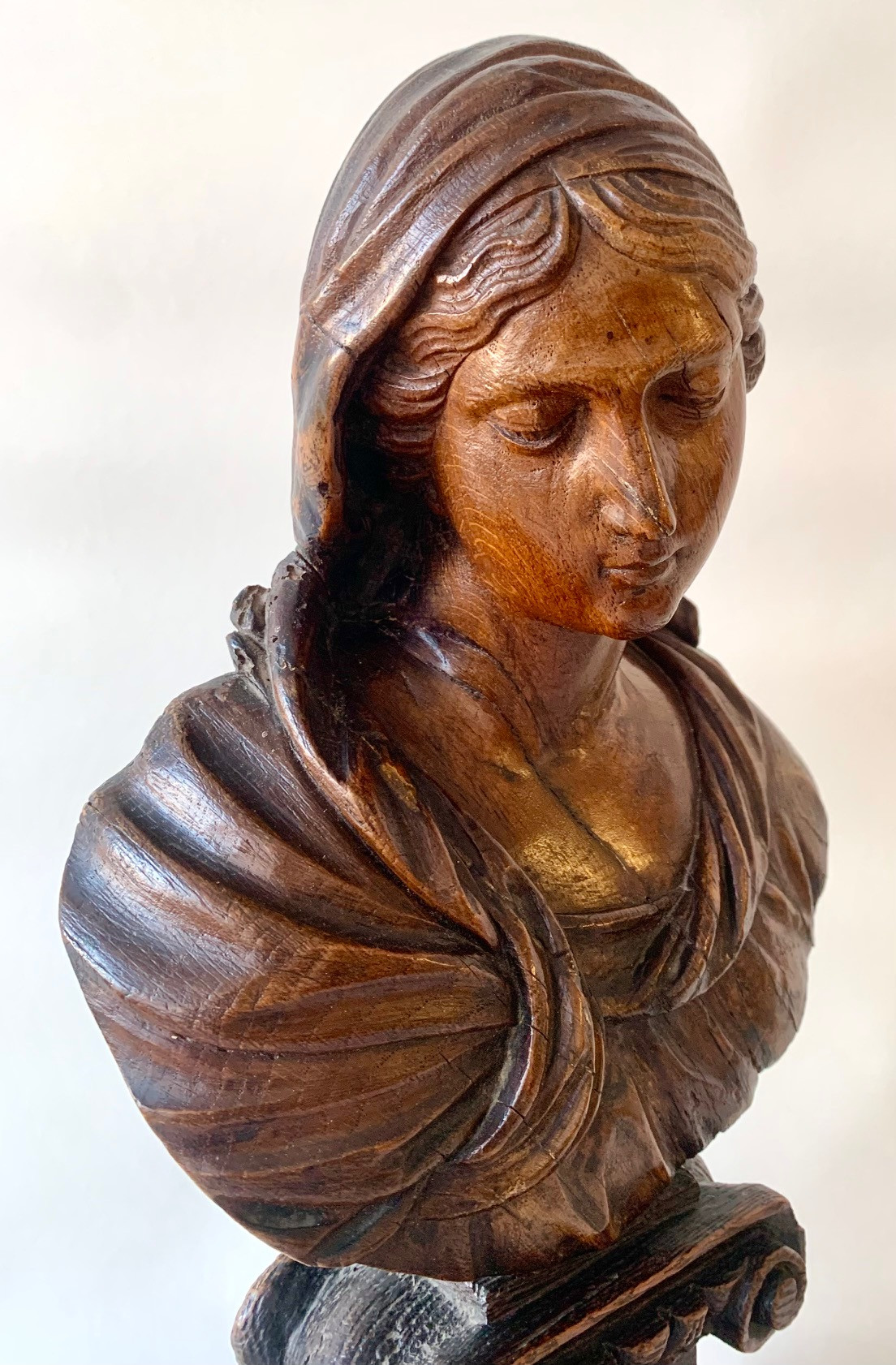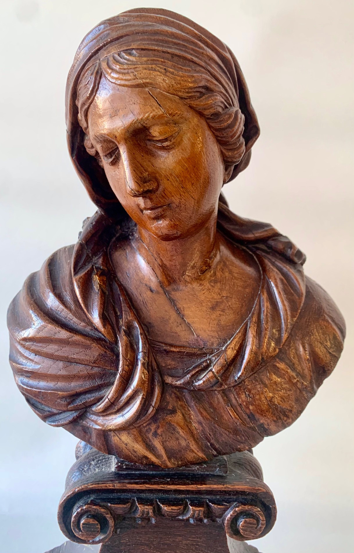 Busto de la Virgen Maria del siglo XVII, de madera de roble tallado sobre peana tronco conica con dos volutas en la base superior, delicada manufactura muy probablemente francesa. Muy buen estado de conservación.