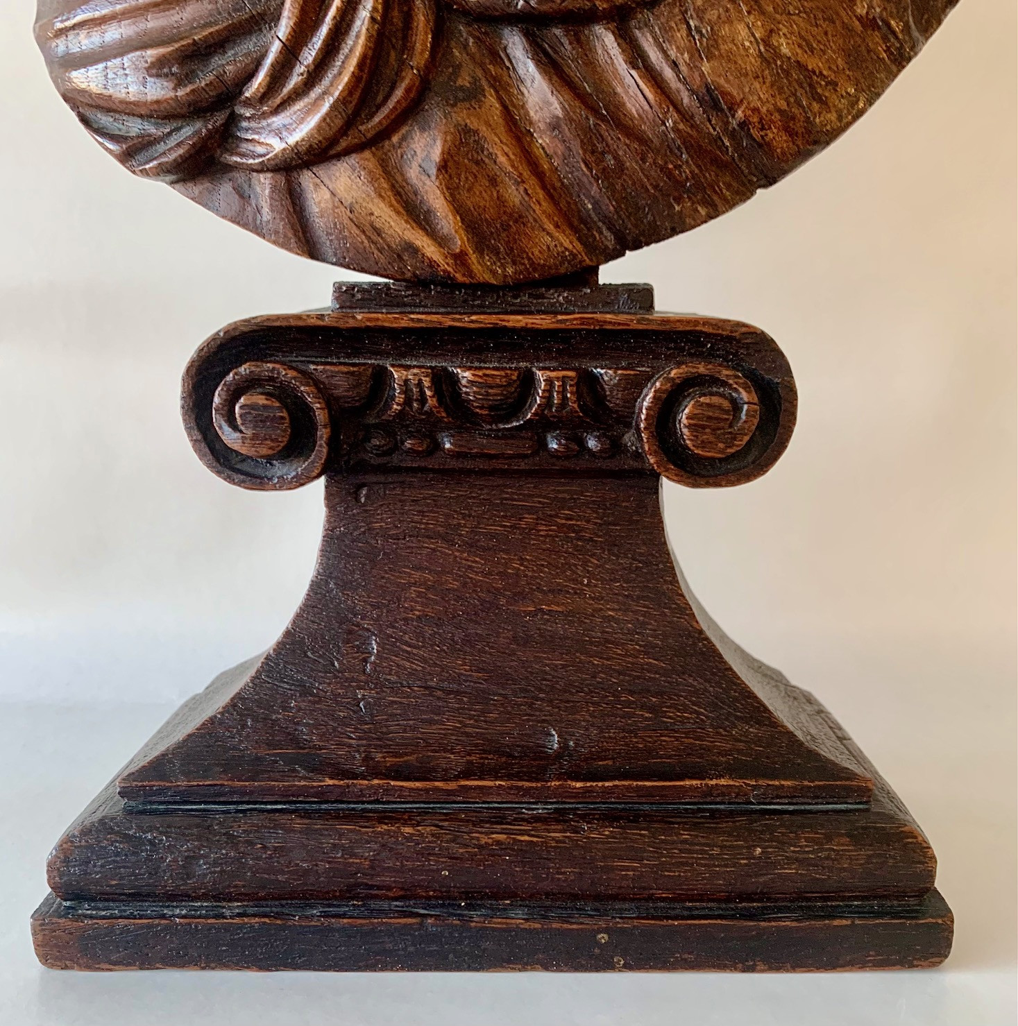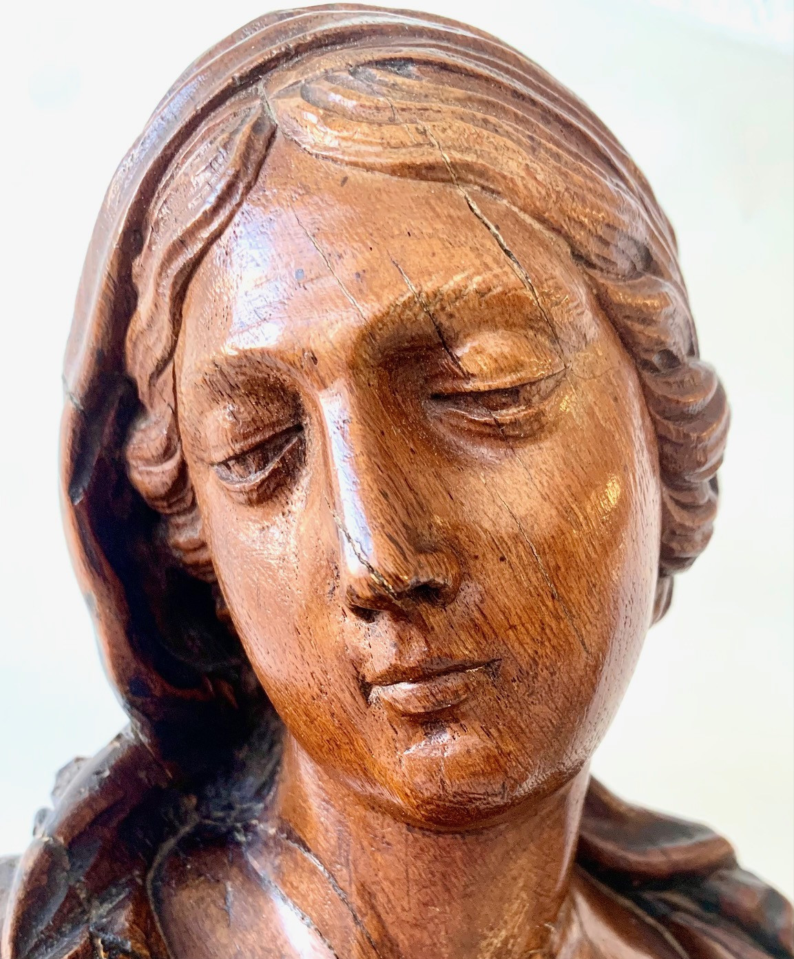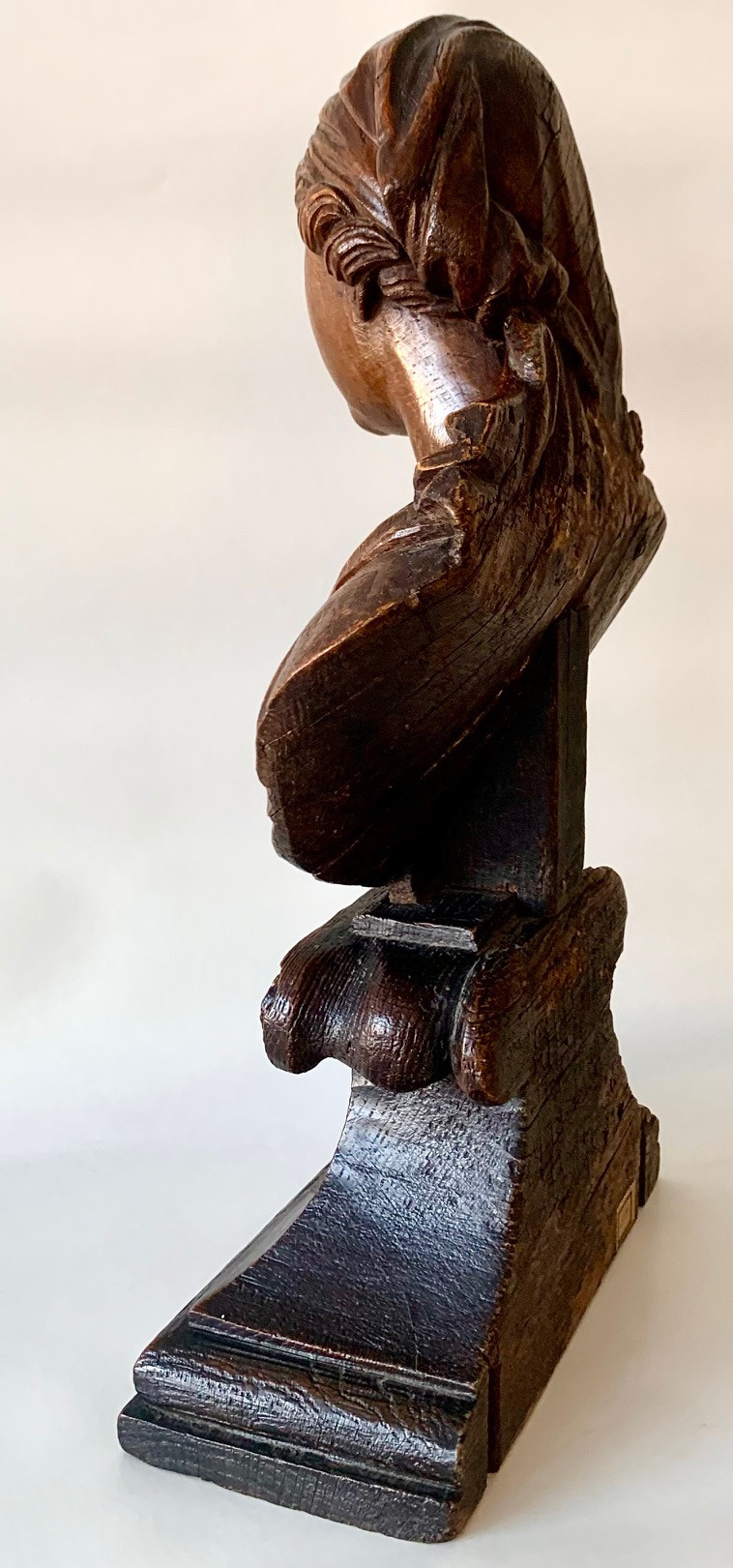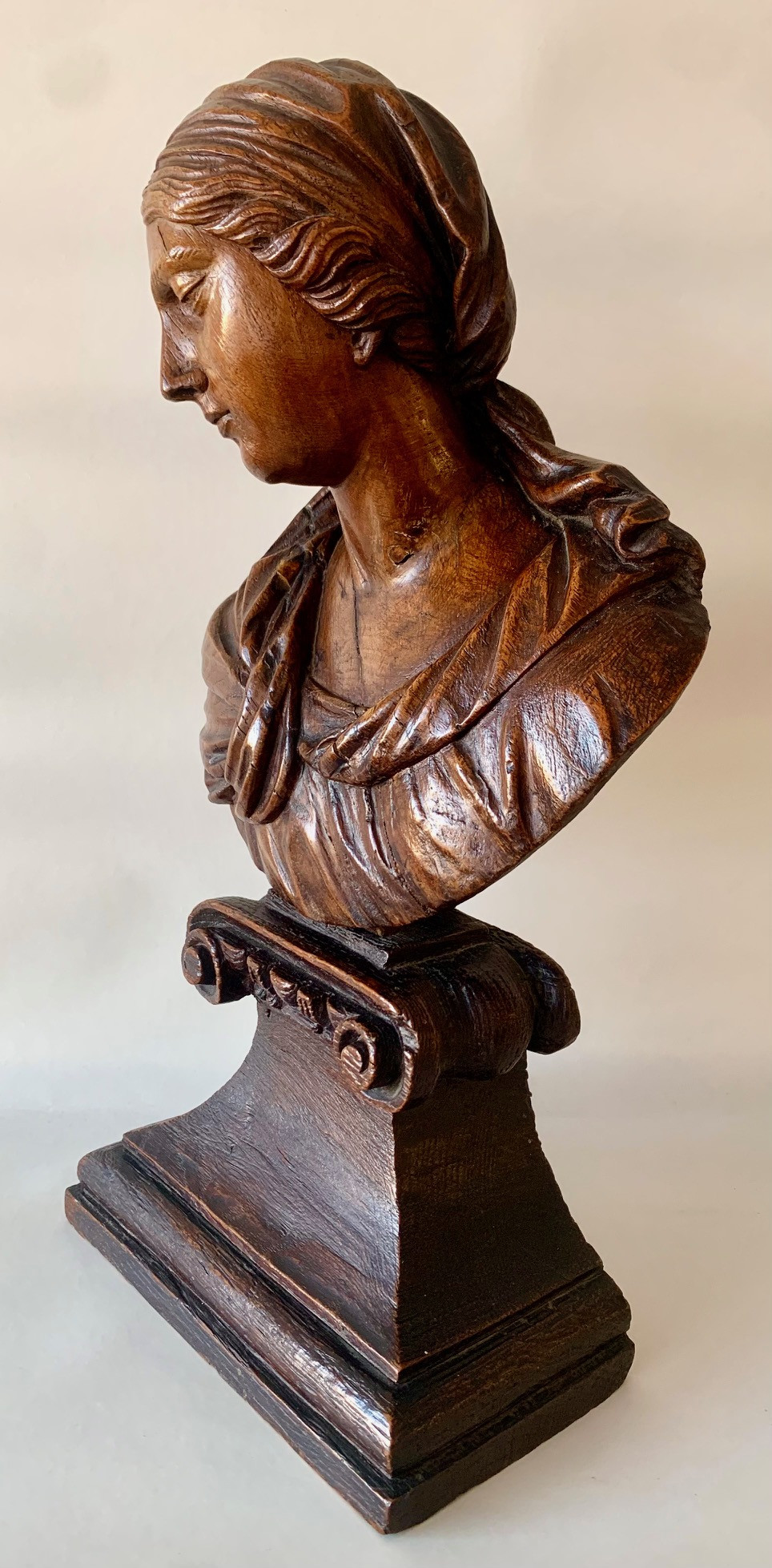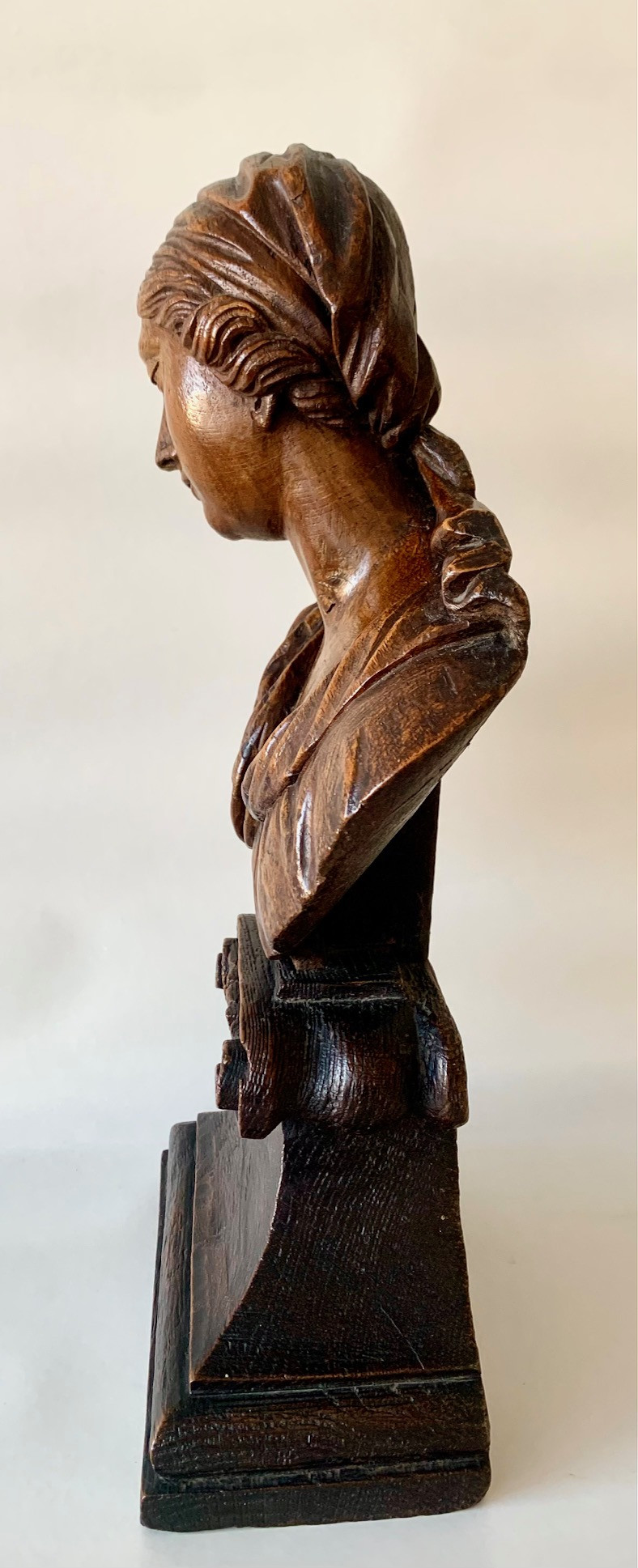 Busto de la Virgen Maria del siglo XVII, de madera de roble tallado sobre peana tronco conica con dos volutas en la base superior, delicada manufactura muy probablemente francesa. Muy buen estado de conservación.